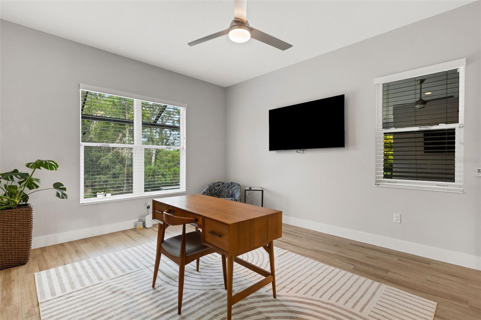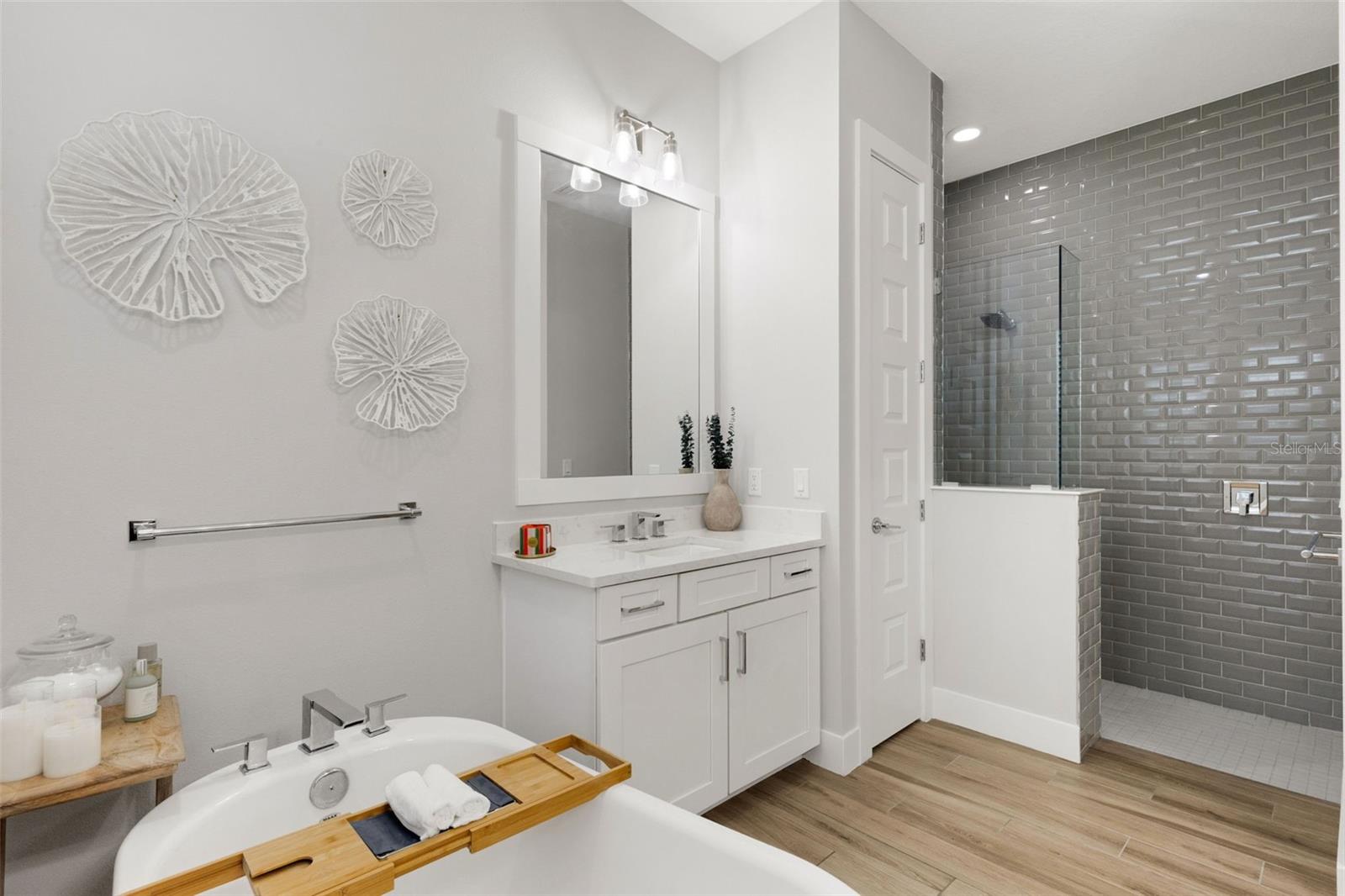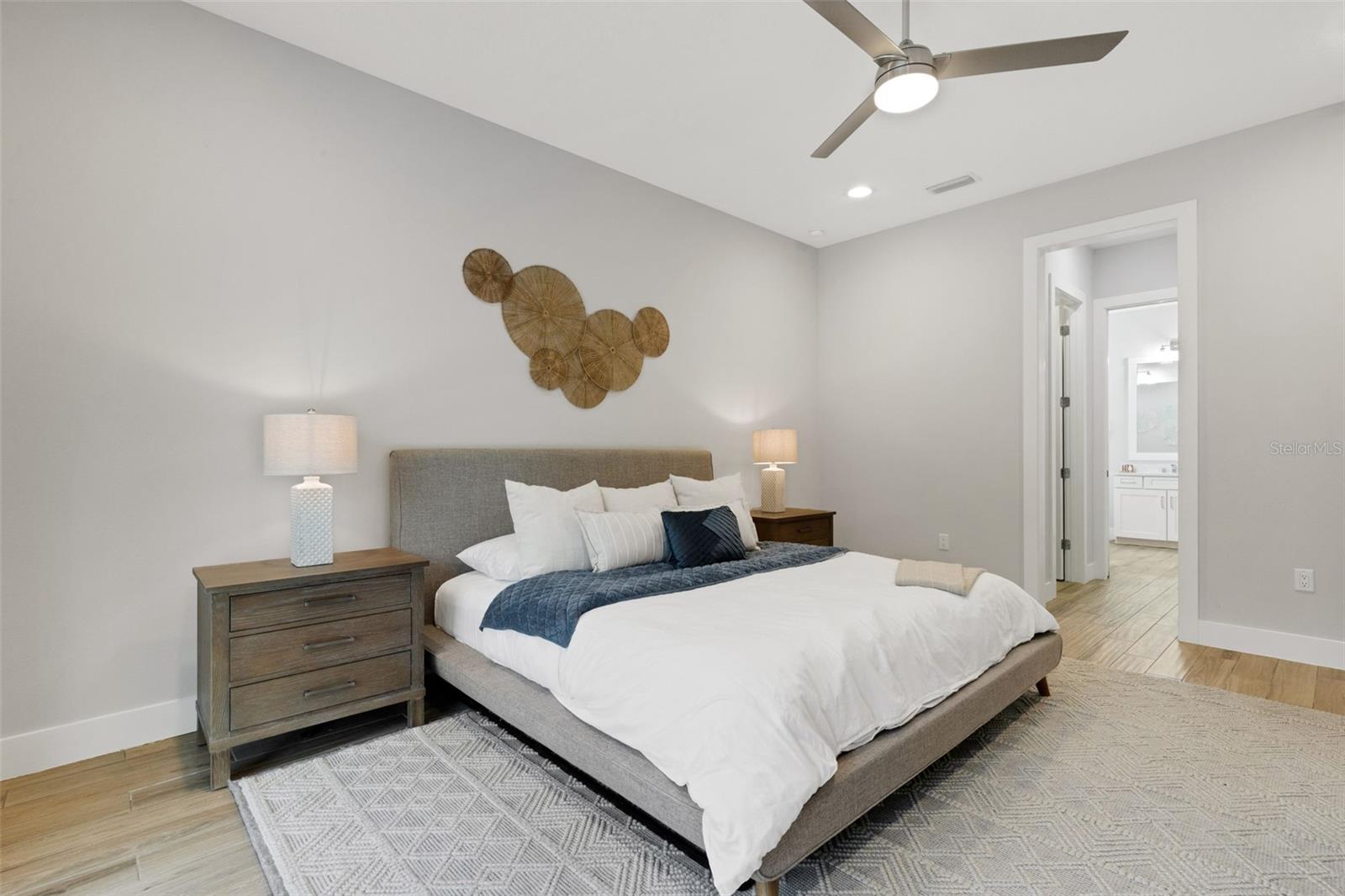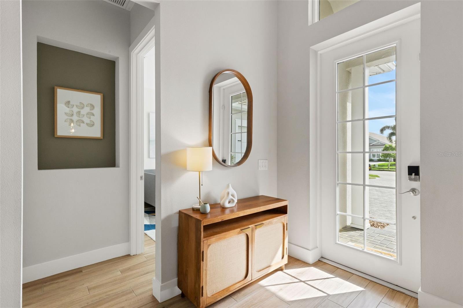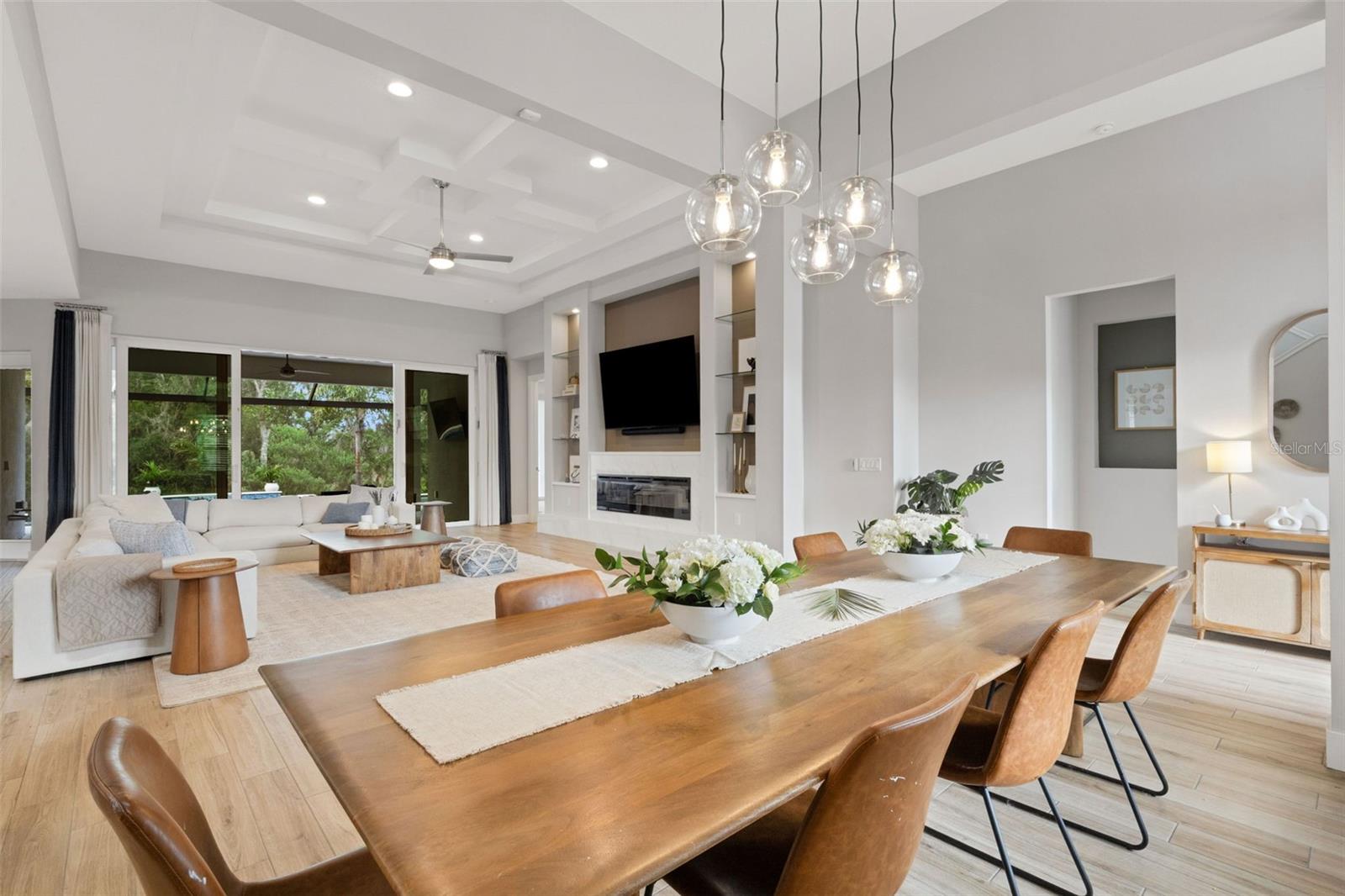 Striking coastal elegance and exceptional upgrades define this beautifully designed Tideland model, set on a PRIVATE PRESERVE homesite in the highly sought-after Lakehouse Cove at Waterside. With 3 bedrooms, 3 baths, a dedicated office, and an EXPANSIVE SECOND FLOOR BONUS SUITE, this home offers a rare combination of sophistication, space, and versatility.From the moment you arrive, the inviting front porch, manicured landscaping, and SIDE-FACING THREE CAR GARAGE create a polished first impression. Inside, soaring ceilings, 8-foot doors, and wood-look tile flooring throughout establish a light, airy feel, while the open-concept design flows effortlessly from one space to the next. The great room is a true centerpiece, featuring a COFFERED CEILING, custom FEATURE WALL, glass shelving, and a sleek marble-accented electric FIREPLACE.The GOURMET KITCHEN n is both stunning and highly functional, anchored by a LARGE QUARTZ ISLAND WITH SEATING FOR SIX, and complemented by a new gas cooktop, new refrigerator, walk-in pantry, tile backsplash, and abundant cabinetry--perfect for entertaining or everyday living.The primary suite offers a luxurious retreat with a FREE-STANDING SOAKING TUB, spacious walk-in shower, dual vanities with built-in seating, and custom closets. Two additional bedrooms, a private office with double doors and serene preserve views, and a well-designed laundry room complete the main level. Upstairs, a generous bonus area with full bath provides ideal space for guests, hobbies, or a private getaway.Step outside and experience resort-style Florida living at its finest. The HEATED SALTWATER POOL AND SPA and generously-sized lanai overlook a lush, private preserve, while the expansive shellstone paver lanai creates a seamless indoor-outdoor lifestyle designed for both relaxation and entertaining.Additional highlights include a whole-house generator, tankless gas water heater, water softener system, custom closets throughout, and a functional mudroom/drop zone.Located in one of Waterside's premier communities, Lakehouse Cove residents enjoy a lakeside clubhouse, resort-style pool and spa, fitness center, pickleball courts, scenic trails, and water taxi access to Waterside Place--offering dining, shopping, and entertainment just minutes from home.