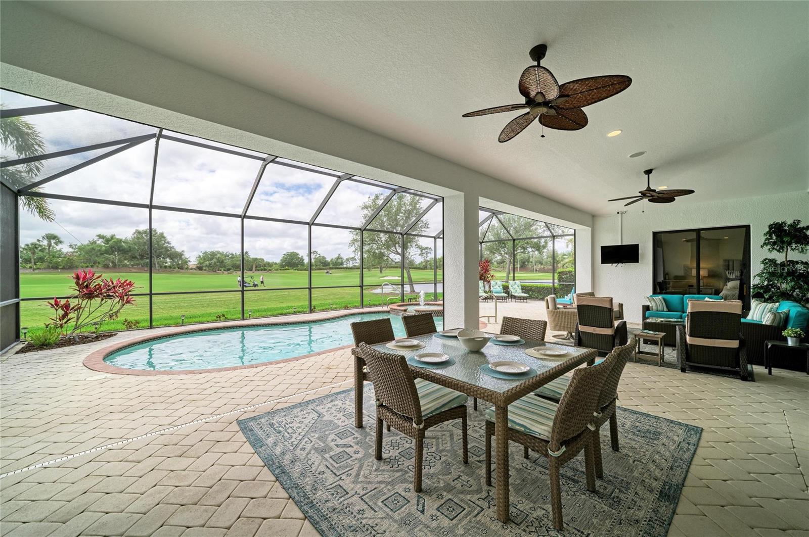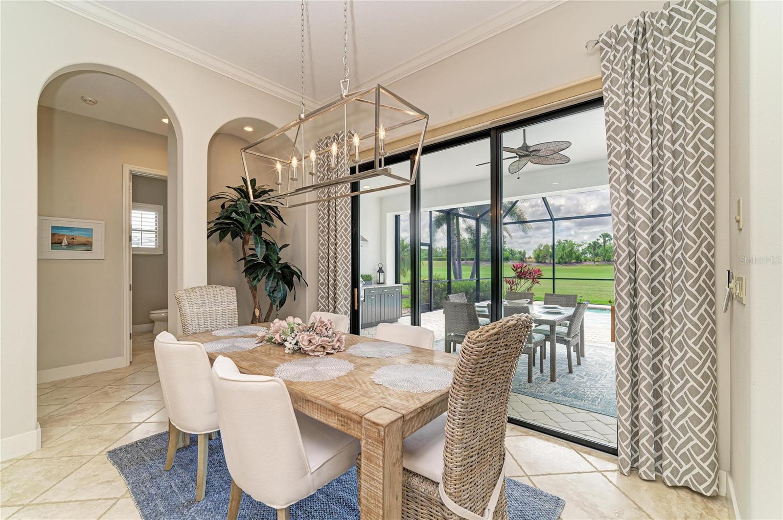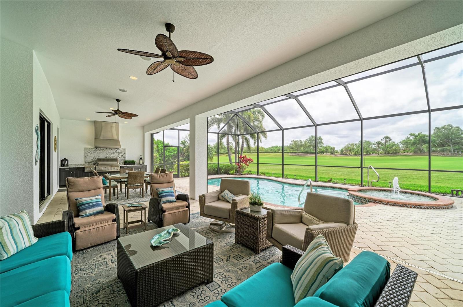 Experience timeless sophistication in this CUSTOM RESIDENCE BY JOHN CANNON, ideally situated within the gated resort community of River Strand Golf & Country Club! One of only a select few custom-built homes in the community, this distinguished GOLF DEEDED property showcases masterful craftsmanship, innovative architectural design and beautiful refined finishes.From the moment of arrival, the home's striking curb appeal makes a lasting impression, highlighted by a three-car side-entry garage. Inside, a grand foyer unfolds into an expansive great room, where dual arched built-ins, soaring 10-foot illuminated tray ceilings, and triple 10-foot sliding glass doors create an atmosphere of elegance bathed in natural light.A formal dining room offers an inviting setting for elevated entertaining, while the OPEN CONCEPT main living space seamlessly blends casual dining with a beautifully appointed chef's kitchen. Featuring a generous center island and breakfast bar, this space is thoughtfully designed to overlook both the main living area and the outdoor retreat beyond.Step outside to a breathtaking private oasis. The custom SALTWATER POOL AND SPA are framed by an expansive lanai designed for luxurious outdoor living. A substantial covered area provides the perfect setting for alfresco dining and entertaining, complemented by a fully equipped outdoor kitchen. The PANORAMIC VIEWS are truly extraordinary--offering sweeping, private vistas of the 8th hole of the Tributary Course, along with tranquil water views that span the entire rear of the property.The primary suite is a serene sanctuary, privately situated behind double doors and occupying its own wing of the home. This grand retreat features dual walk-in closets, a spacious spa-inspired en-suite with dual vanities, and direct access to the lanai. On the opposite side of the residence, two well-appointed guest bedrooms provide comfort and privacy--one with its own en-suite bath, and the other conveniently located adjacent to a full bath that also serves as a pool bath.A richly appointed office with custom wood built-ins offers a refined space for work or study. Throughout the home, HURRICANE IMPACT WNDOWS and newer installed (2024) lanai screens provide peace of mind.Every detail has been meticulously curated--from the oversized laundry room with built-in sink to plantation shutters, custom ceiling features, designer lighting, and custom paint finishes. Set on a generously sized, private homesite, this remarkable residence embodies the very essence of luxury living. River Strand Golf & Country Club is celebrated for its 27 holes of impeccable championship golf and has recently unveiled a stunning 9 MILLION DOLLAR RENOVATION OF IT'S CLUBHOUSE, RESTAURANT, grill room, and tiki bar--elevating the resort lifestyle. Residents enjoy an exceptional array of amenities, including two resort-style pools and spas, six additional satellite pools, two fitness centers, and premier tennis and pickleball facilities. A vibrant calendar of curated social events and wellness activitiies is also offered year round.Perfectly positioned just minutes from I-75 and the Marketplace, featuring an expanding selection of shopping and dining and close to the beautiful beaches of the Gulf Coast! Discover an unparalleled standard of living where luxury, leisure, and location converge--so come and experience River Strand at its absolute finest, you may never want to leave!