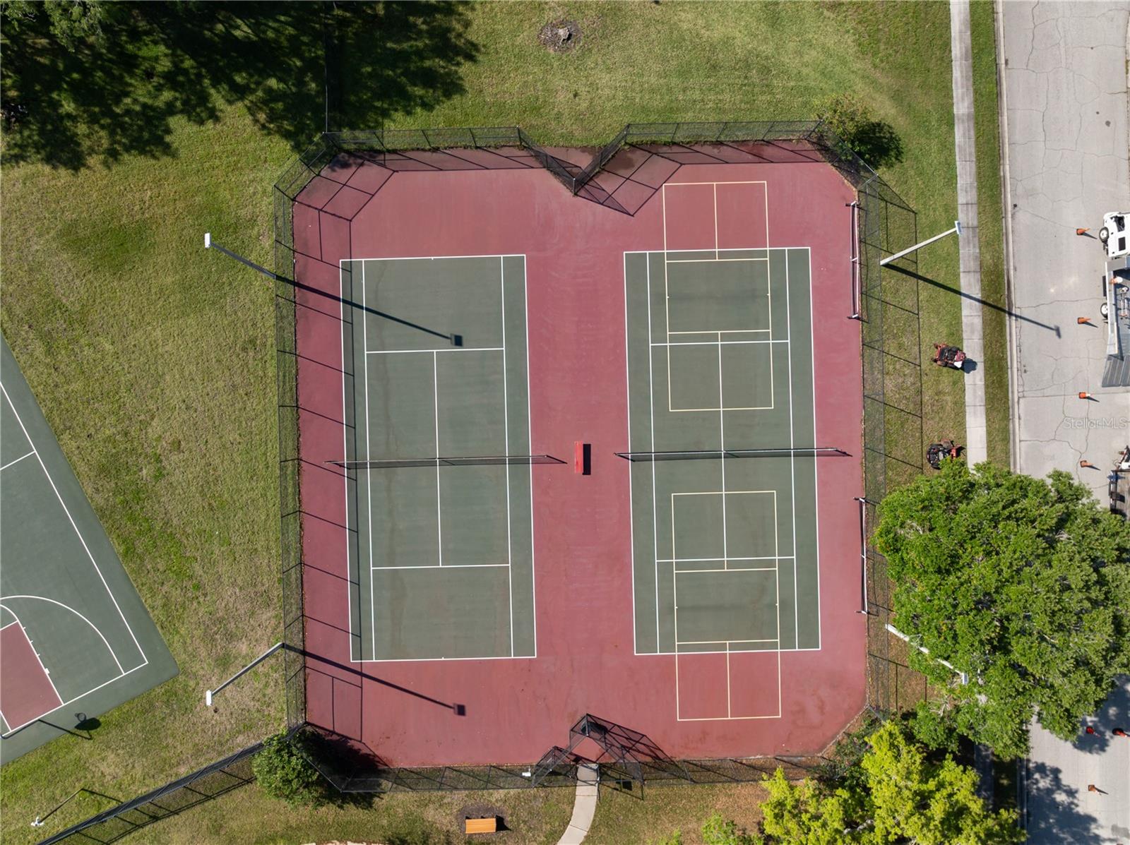 Exterior: Rain Gutters, Sidewalk, Sliding Doors, Tennis Court(s)