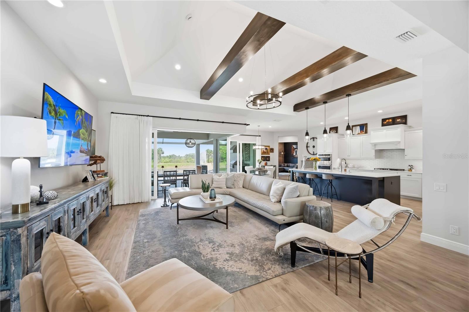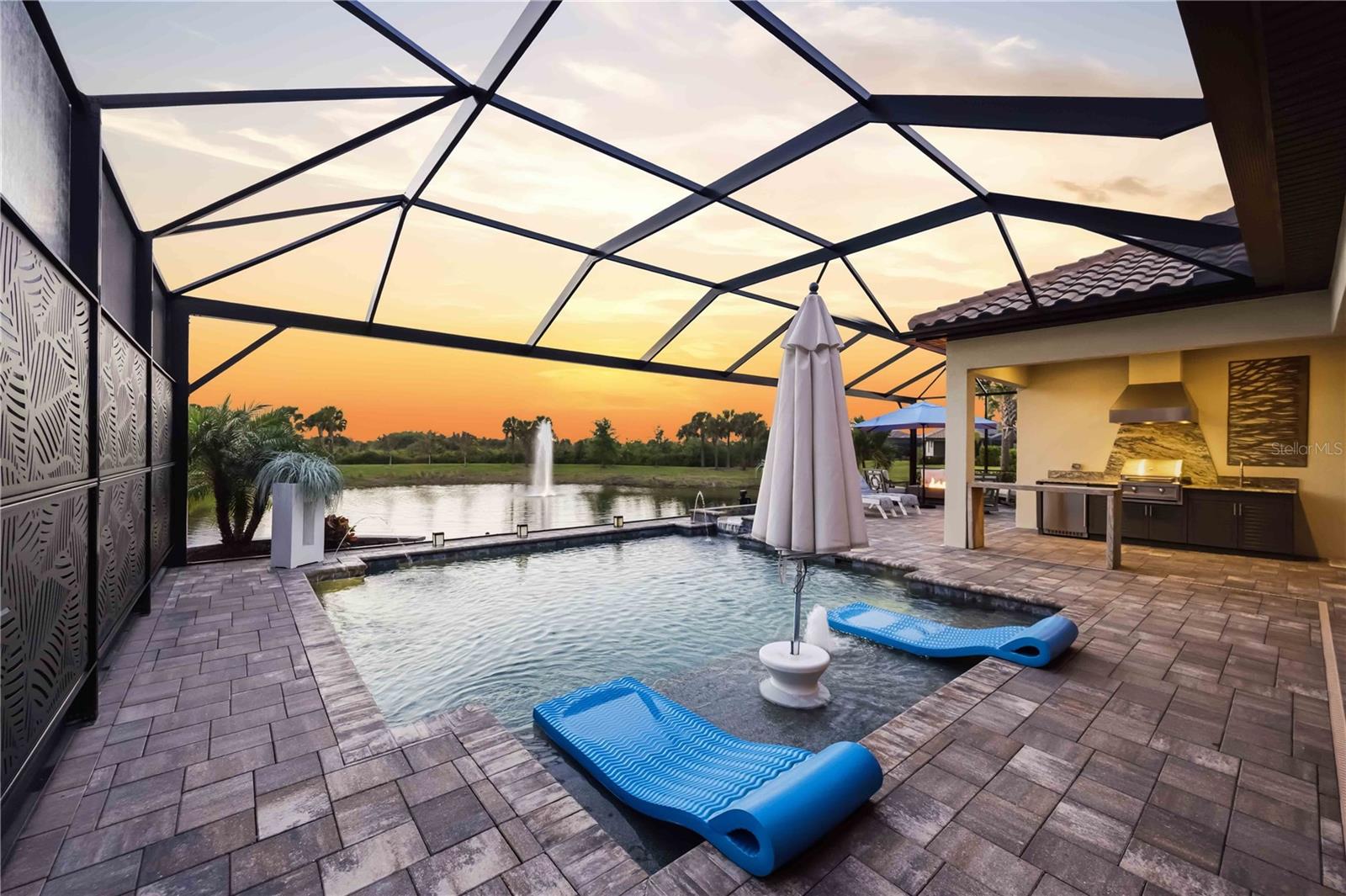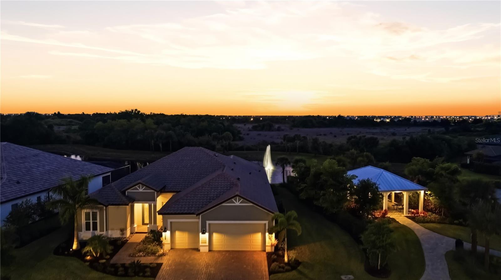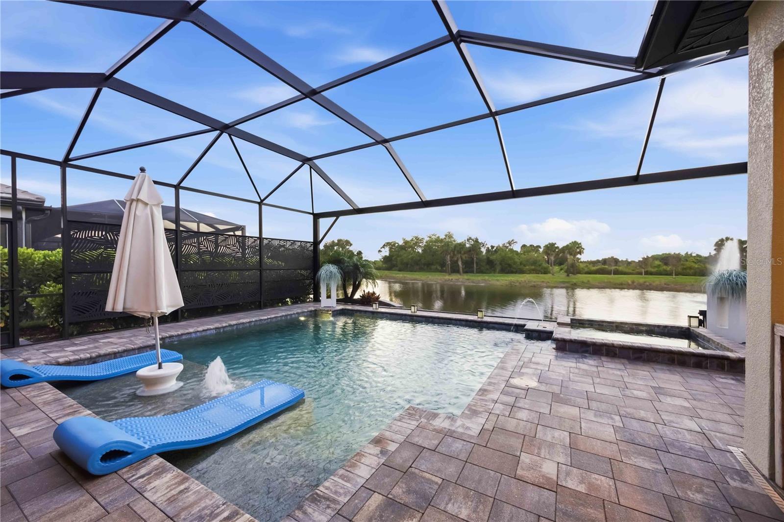 Don't miss this opportunity to own a SAM RODGERS CUSTOM HOME at Gran Place in Wellen Park! With ONLY 42 homes total, in this private gated community, this is an exclusive one-of-a-kind neighborhood with over 40 acres of natural preserves. This Sold Out Edgewater model is 2,872 sq ft, and offers 3 bedrooms plus large bonus room, 3 baths, 3 car garage and an outdoor living space that defines the word "Paradise" featuring a private heated pool/spa with a GORGEOUS WATER VIEW! Ideally situated next to the pavilion, this home offers a rare opportunity to expand your entertaining space--perfect for hosting events and gatherings--while still enjoying added privacy, with no immediate neighbor on one side. This open-concept floor plan features 10' ceilings w/crown molding, tray ceilings w/stained beams, and an abundance of natural light throughout. The gourmet kitchen includes a gas rangetop with custom wood hood, quartz counter tops with tile backsplash, and painted wood cabinetry with crown molding. The walk-in pantry features custom, adjustable height wood shelving. The private primary suite offers direct access to the lanai and beautiful outdoor living space with a glass full-lite french door. The spacious primary bath features seperate vanities with custom illuminated mirrored cabinets complete with lighted sconces, quartz counter tops, large walk-in shower, with floor to ceiling porcelain tile, and large soaking tub. The bath connects to a huge walk-in closet with custom wood shelving and drawers. Bedroom 2 has a private en-suite bath with glassed enclosed tub/shower and walk-in closet. Enjoy relaxing in the oversized bonus room which overlooks the extended lanai & water, and features custom wood, display shelving. Upon walking through the front door, your eyes will immediately be drawn to the highlight of the home...the AMAZING OUTDOOR OASIS!! This space is designed for entertaining with an expansive covered lanai, heated pool & spa, and a fully equipped outdoor kitchen with built-in gas BBQ grill. Enjoy countless sunsets overlooking your private water view, complete with lighted fountain surrounded by natural preserve. All in all, this luxurious custom home has been extensively upgraded with custom lighting and chandeliers, LVP flooring, custom wall paper, drapes & window coverings and much more. The oversized 3 car garage features built-in cabinets and work bench, epoxied floors, 8' garage doors, tankless water heater, and an EV outlet. This home has all PGT Impact windows & doors. There are many more upgrades I could list, but you must see this home for yourselves! Gran Place is a natural gas community and has one of the lowest HOA's and CDD fees in Wellen Park! Located in sought after Wellen Park, Gran Place is just 2 short miles of waterfront dining, Boutique shopping, entertainment and year-round events across 175 acres. Residents will enjoy the 3 mile health and wellness trail, food truck arena, splash pad, playground, activity lake, with paddle boards and kayaks, plus over 20 miles of scenic nature and fitness trails. With easy access to major highways, world class beaches, Downtown Venice, and Downtown Sarasota which are all within reach. Families will also appreciate proximity to top-rated Sarasota County schools. DON'T MISS OUT ON THIS GOLDEN OPPORTUNITY TO OWN YOUR OWN SLICE OF PARADISE IN THE MOST PRIVATE, EXCLUSIVE COMMUNITY IN WELLEN PARK, VENICE FL. *Please see "Realtor Remarks" for additional contact info.