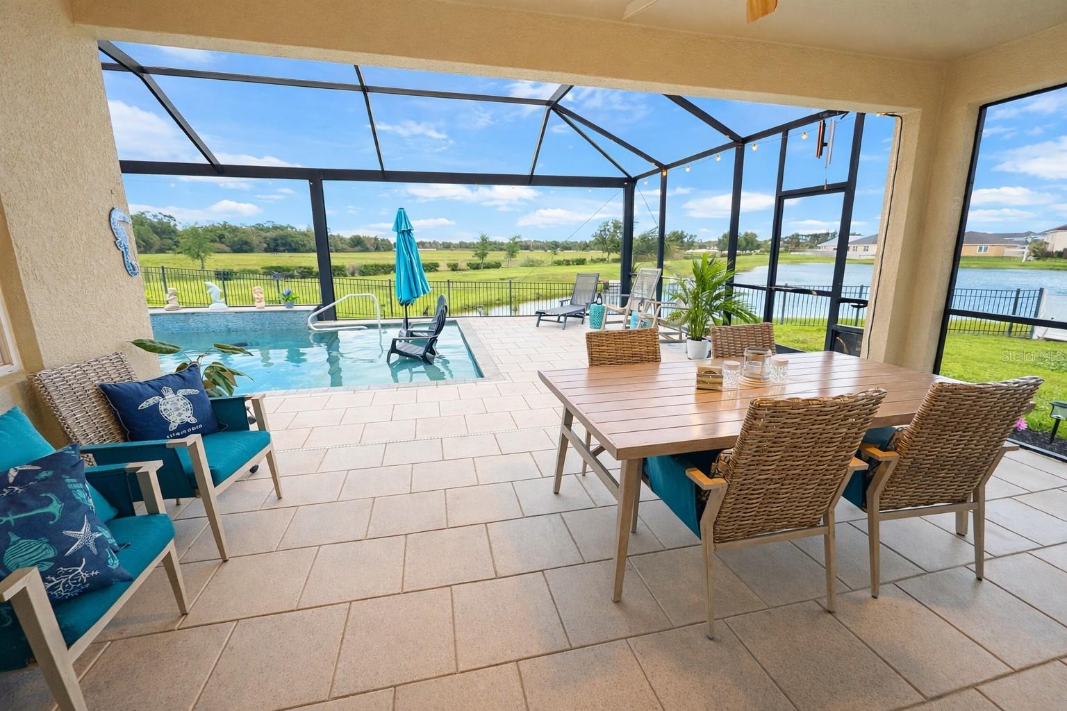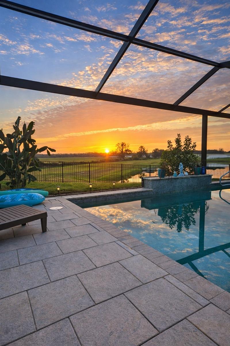 JUST LISTED! Rarely available and beautifully upgraded Next Gen one story home with a private in-law suite, 3 car garage, and oversized pie shaped premium lot with breathtaking sunrise views and glistening water vistas. Unlike new construction, this home is already thoughtfully enhanced with high end finishes, extensive upgrades, and a brand new roof, offering a level of detail and value that is truly hard to replicate. The home welcomes you with a freshly manicured lawn, updated landscaping, and new mulch, creating strong curb appeal from the moment you arrive. This sought after Camden floor plan features an open split bedroom layout with a grand foyer entrance and expansive living areas. The kitchen is designed for both everyday living and entertaining, complete with a large island, pendant lighting, granite countertops, stainless steel appliances, white cabinetry, and a spacious walk in pantry. An additional flex space off the kitchen is perfect for a breakfast area, home office, or playroom, all overlooking peaceful water and natural views. The primary suite is generously sized with room for large furnishings, a walk in closet, and a well appointed bath with dual vanities, soaking tub, separate shower, and linen storage. Two guest bedrooms share a Jack and Jill bath at the front of the home. The private in-law suite offers its own bedroom, full bath with walk in shower, living area, and kitchenette with full size refrigerator. This suite has both interior and private exterior access, making it ideal for guests, multigenerational living, teens, or even potential rental income opportunities. Step outside to your screened lanai and experience a true backyard retreat. Relax in your elegantly upgraded pool featuring travertine decking, PebbleTec finish, mosaic accents, a sun shelf with bubblers, umbrella holder, sitting ledge, and full length steps. Additional features include a fountain, fiber optic lighting, saltwater system, heater, and panoramic screen enclosure. The extended pool deck offers ample space for outdoor furniture, dining, and entertaining, creating the perfect setting to enjoy the Florida lifestyle while taking in serene water views and beautiful sunrises. The oversized pie shaped lot features a fully fenced yard with both side yards, offering plenty of space for pets, play, and privacy. With open water and natural views, this backyard setting is truly special. Additional highlights include a glass front door with hurricane protection, updated bedroom flooring, and garbage disposal. This home combines thoughtful design, premium upgrades, and an exceptional lot to create a one of a kind opportunity. Located in Del Tierra, a gated community known for its low HOA fees and no CDD, residents enjoy a welcoming, family friendly atmosphere surrounded by natural beauty. Community amenities include a resort style pool, fitness center, soccer fields, and a large playground, making it ideal for all ages. Conveniently situated just minutes from SR 64, I 75, and the Fort Hamer Bridge, with easy access to nearby shopping and dining including Costco, Target, Hobby Lobby, and more. Close proximity to top rated schools, including Gene Witt Elementary, just a short bike ride away. All information is deemed reliable but not guaranteed. Buyer and buyer agent to verify. PROFESSIONAL PHOTOS COMING SOON! Call for a showing today. This home won't last long!