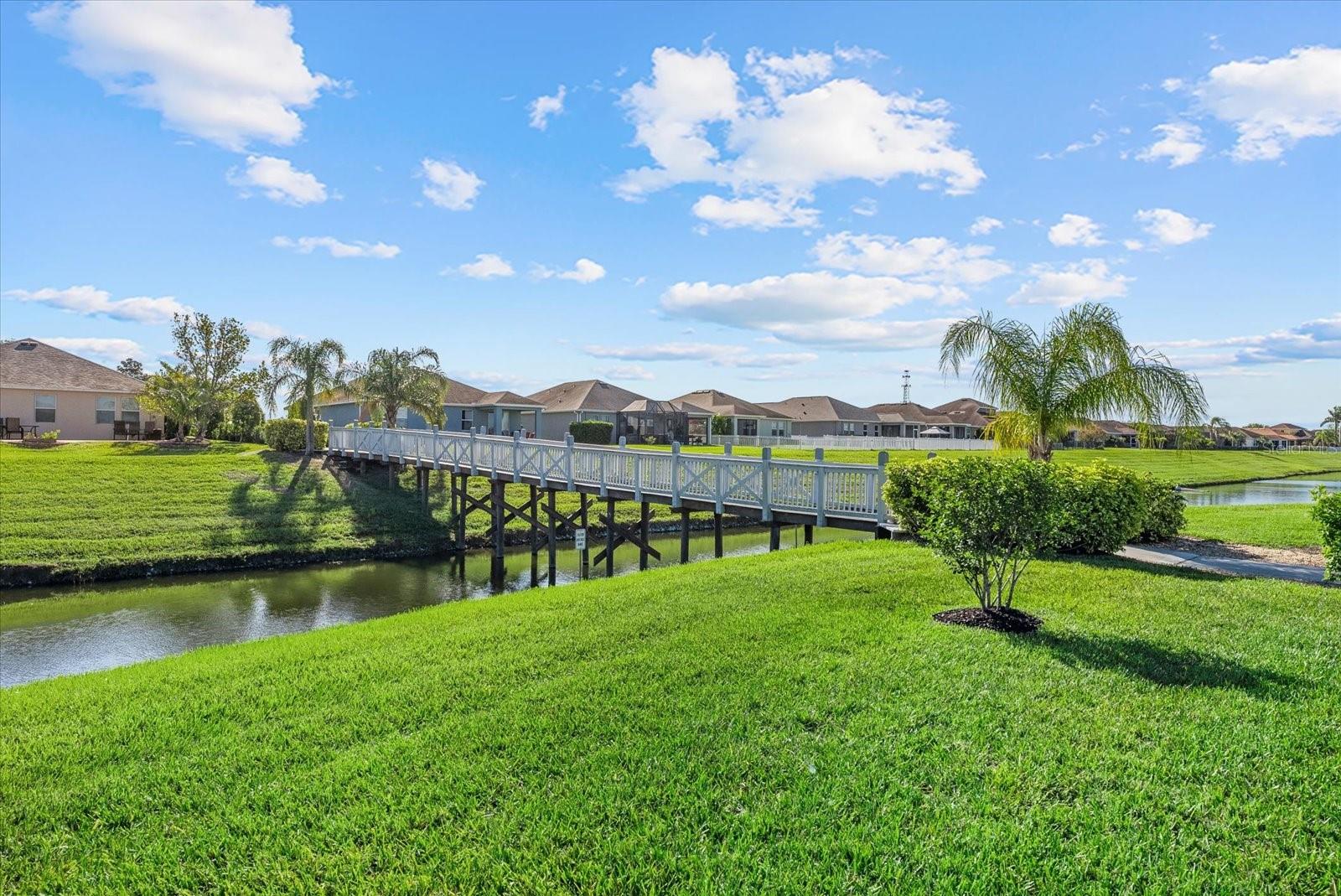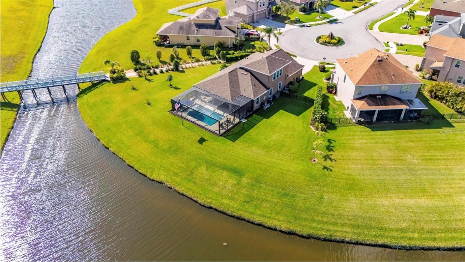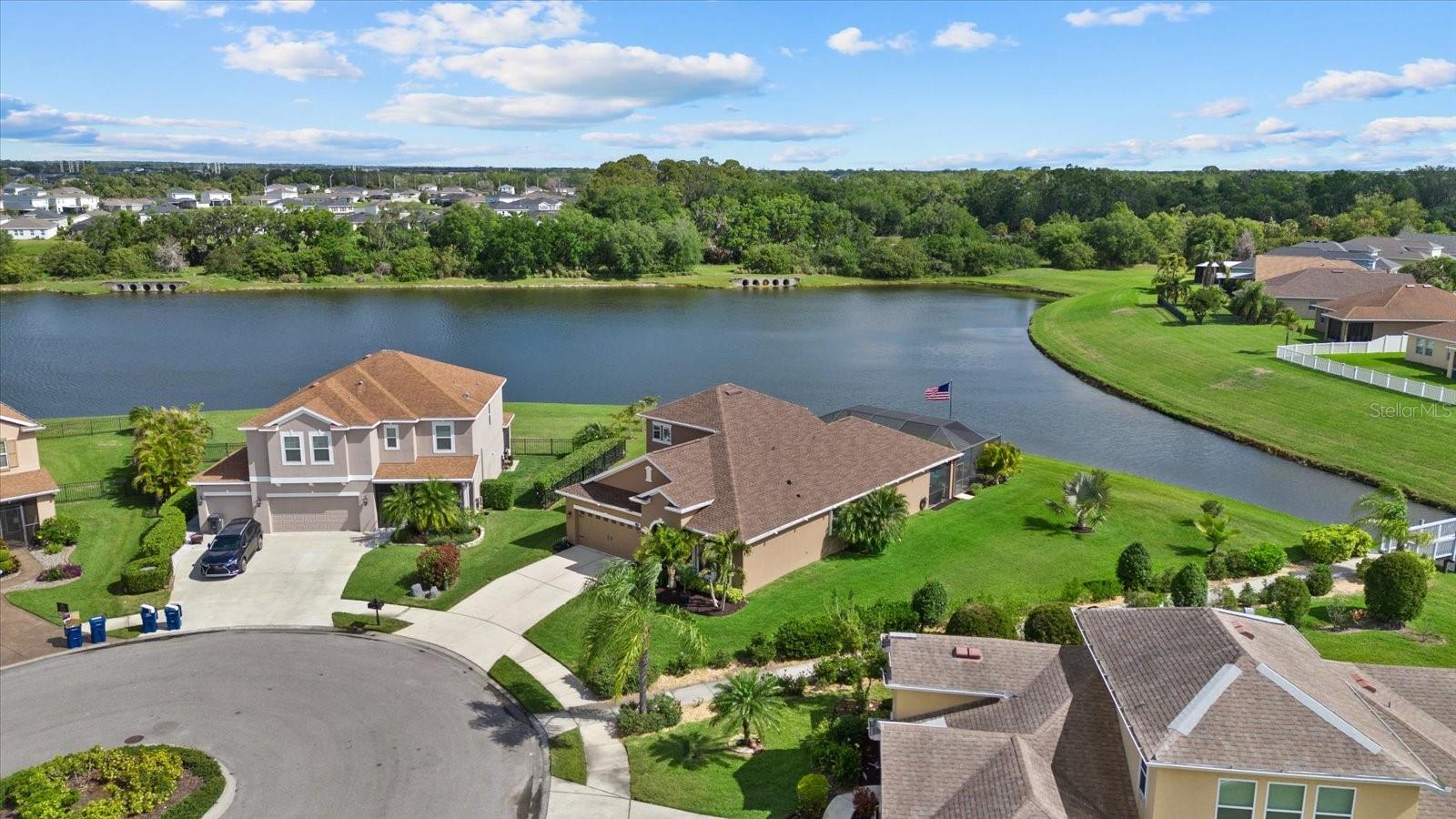 Welcome to one of the most desirable homes in Copperstone .Perfectly positioned on a premium oversized .27-acre cul-de-sac lot with breathtaking long lake views and direct sightlines to the community bridge. This beautifully maintained 4-bedroom, 2.5-bath home offers the ideal blend of comfort, functionality, and Florida lifestyle living. From the moment you step inside, you're greeted by an open and inviting floor plan filled with natural light and designed for both everyday living and entertaining. The spacious great room flows seamlessly into the dining area and kitchen, creating a comfortable and functional layout for gatherings and family time. The kitchen features granite countertops, ample cabinetry, stainless steel appliances, and a large breakfast bar overlooking the main living space. A dedicated dining area provides additional space for entertaining, while large sliding glass doors draw your eye toward the stunning lake views and outdoor living area. Just off the main living space, you'll find a versatile bonus room currently used as a den. This flexible space works beautifully as a home office, den, or formal dining room, offering buyers the ability to tailor the layout to their needs. The primary suite offers a peaceful retreat with beautiful backyard views, generous space, and a well-appointed ensuite bathroom featuring dual vanities, a walk-in shower, and a large walk-in closet. Three additional bedrooms provide comfortable accommodations for family or guests, along with a convenient half bath for visitors. The heart of the home flows seamlessly to the outdoor living space -- where this property truly shines. Step outside to your private backyard retreat featuring a heated saltwater pool, expansive sun shelf with in-water loungers, and a large screened lanai designed for both relaxation and entertaining. The oversized covered patio offers multiple seating areas, perfect for hosting guests or enjoying peaceful lakefront sunsets. The infinity-style screen enclosure maximizes panoramic water views, while the expansive yard provides additional outdoor space to enjoy the peaceful lakefront setting. Additional upgrades include a newer roof (approximately 1 year old), built-in slide-and-lock hurricane shutters for quick and convenient storm protection, whole-house water softener system, generator hookup allowing easy connection to a portable gas-powered generator, and meticulous pride of ownership throughout. Located in the gated community of Copperstone, residents enjoy resort-style amenities including a clubhouse, fitness center, community pool, playground, and scenic walking paths. This is a rare opportunity to own one of the best lots and most impressive outdoor living spaces in Copperstone. Homes with this combination of location, upgrades, and views rarely become available.
