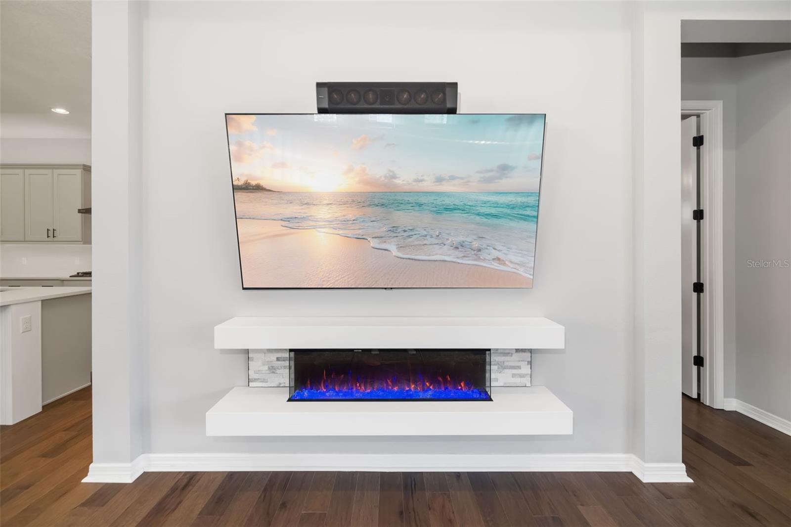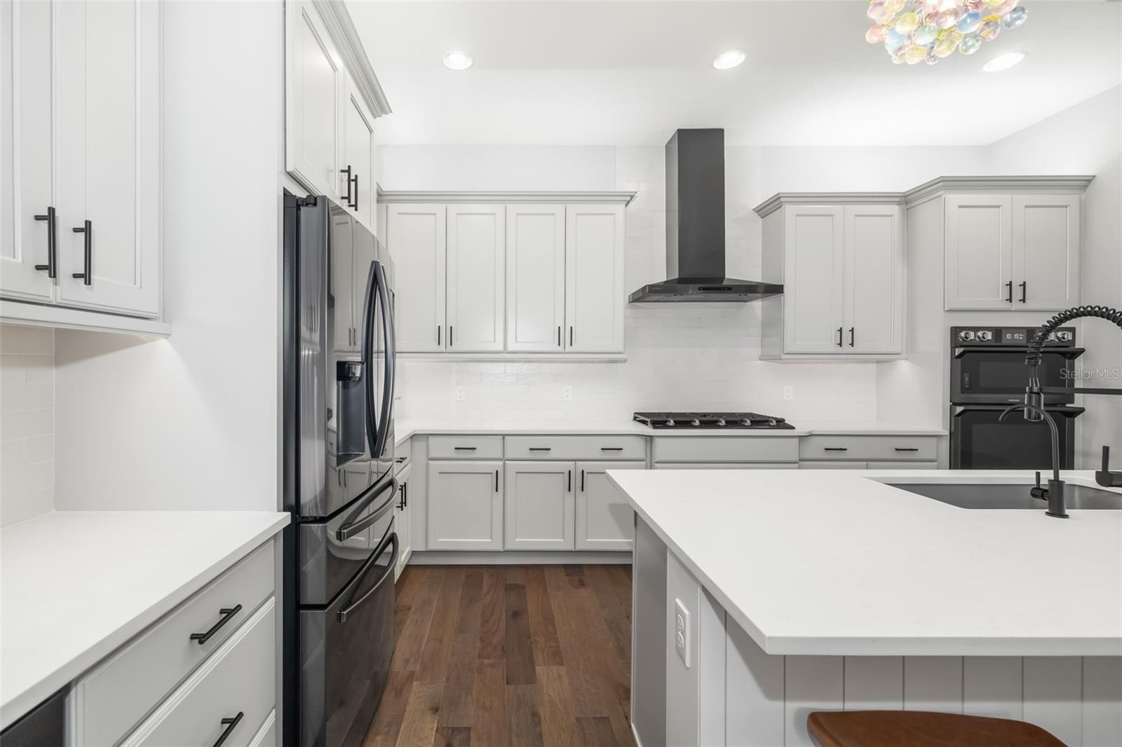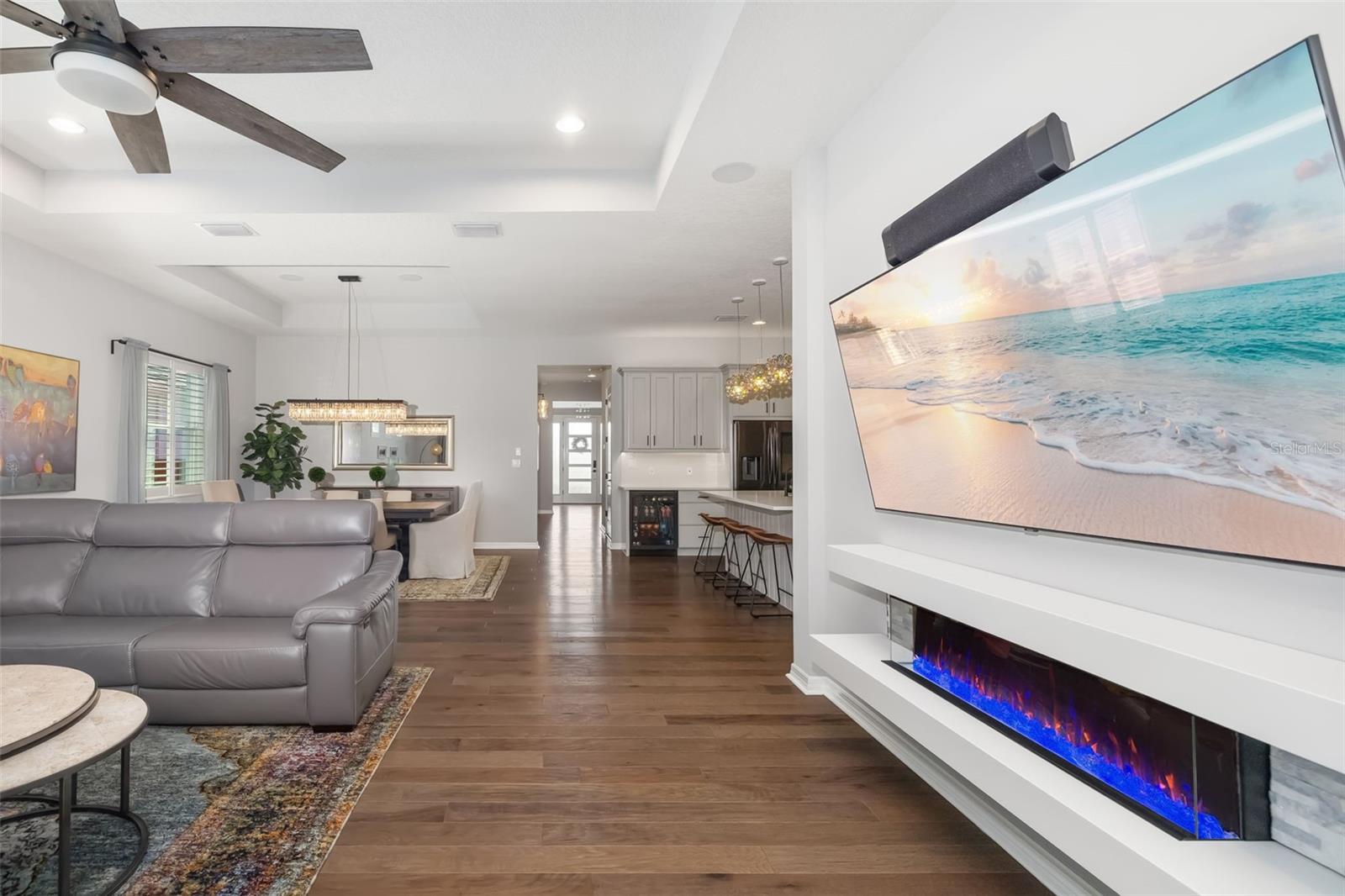 This stunning 2021-built single-story pool home is in an exclusive gated enclave of 30 residences, offering maintenance-free lawn care with low HOA fees and no CDD. Perfectly positioned on a private 0.36-acre cul-de-sac lot with no rear neighbors, this meticulously maintained four-bedroom, 2.5-bath home delivers the ideal blend of luxury, comfort and modern convenience. Inside, an open-concept design showcases soaring tray ceilings, recessed LED lighting and rich hardwood flooring throughout. The great room serves as a striking focal point, featuring a sleek electric fireplace with customizable lighting and a built-in surround sound system, with integrated speakers extending throughout the home and lanai for seamless indoor-outdoor living. Expansive triple sliding glass doors open to the screened lanai, creating an effortless connection to the outdoor space. The gourmet kitchen is both elegant and functional, featuring upgraded soft-close cabinetry, quartz countertops, a designer tile backsplash, and a spacious center island with counter-height seating and custom pendant lighting. A stylish dry bar with a beverage refrigerator enhances the space, while premium Samsung smart black stainless-steel appliances, including a gas cooktop with a vented hood, a built-in convection wall oven with a Flex Duo divider and a steam cooking and convection microwave, complete this chef-inspired kitchen. The private primary suite offers a peaceful retreat with an 11-foot tray ceiling, plantation shutters and two custom walk-in closets. The spa-like en-suite bath features a dual quartz vanity, an expansive double walk-in shower with frameless glass, and modern matte black fixtures. Secondary bedrooms are generously sized, each with 10-foot ceilings, plantation shutters, ceiling fans and in-ceiling speakers with individual controls. A well-appointed laundry room includes custom cabinetry, quartz countertops, a deep utility sink and a subway tile backsplash. Outdoor living is exceptional, featuring a covered and screened lanai with paver decking that opens to a heated saltwater pool, complete with a sun shelf, color-changing LED lighting, a waterfall and a bubbling fountain, all conveniently controlled from your smartphone. The custom summer kitchen is ideal for entertaining, offering marine-grade cabinetry, granite countertops, a gas grill, sink and a beverage refrigerator. Additional upgrades include smart home technology with a Ring doorbell and security, keyless entry, and Z-wave lighting; a two-car garage with epoxy flooring, built-in storage and an EV charging outlet; a whole-house water softener; and a tankless gas water heater. With HOA services covering lawn care, irrigation, cable, and high-speed internet, this home offers an effortless, luxury lifestyle. Don't miss the opportunity to own this exceptional, like-new residence.