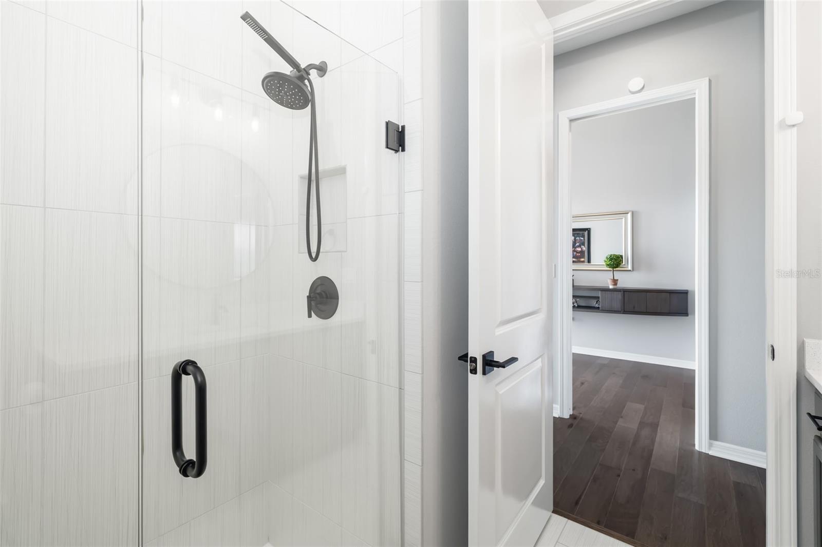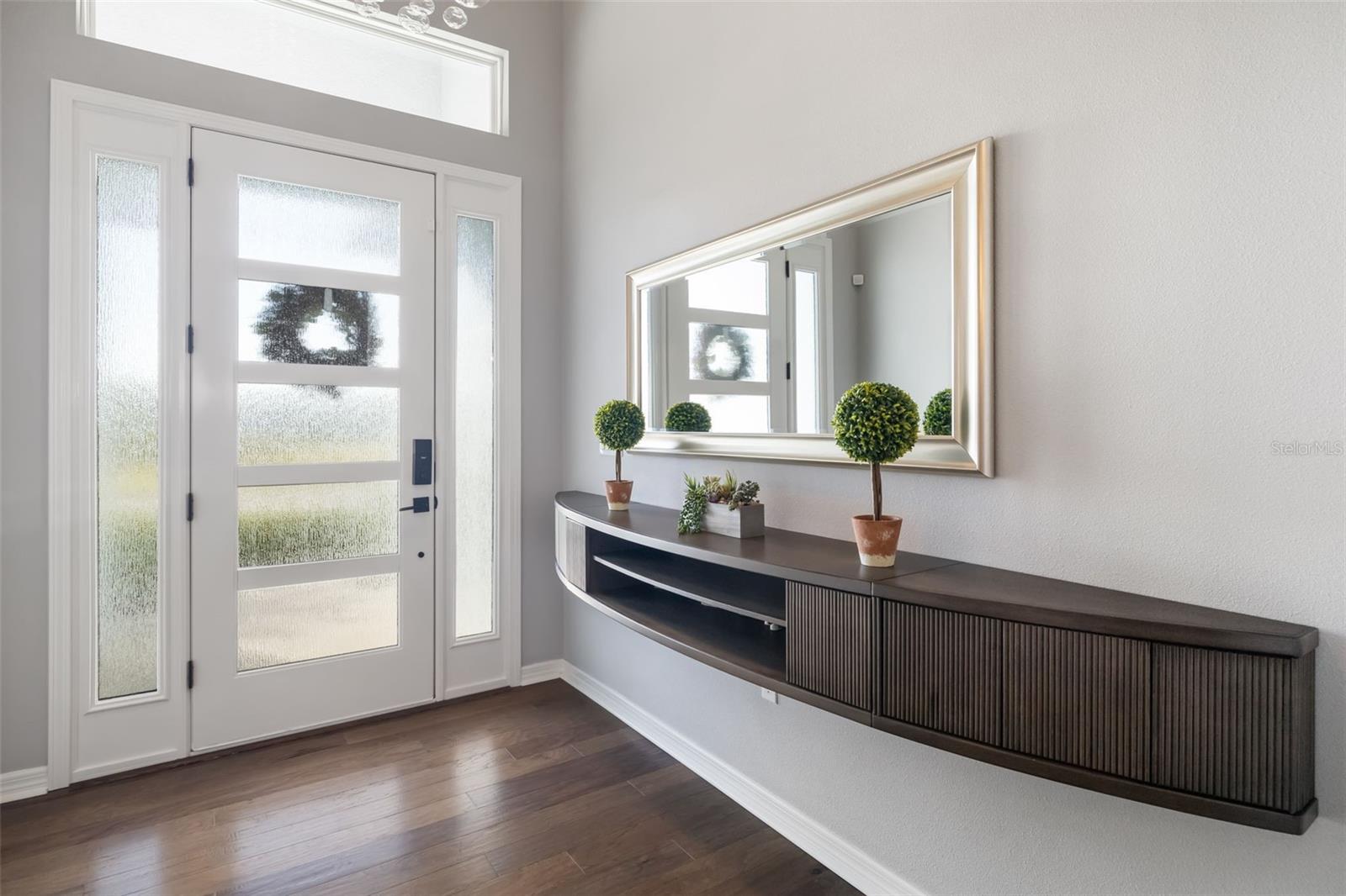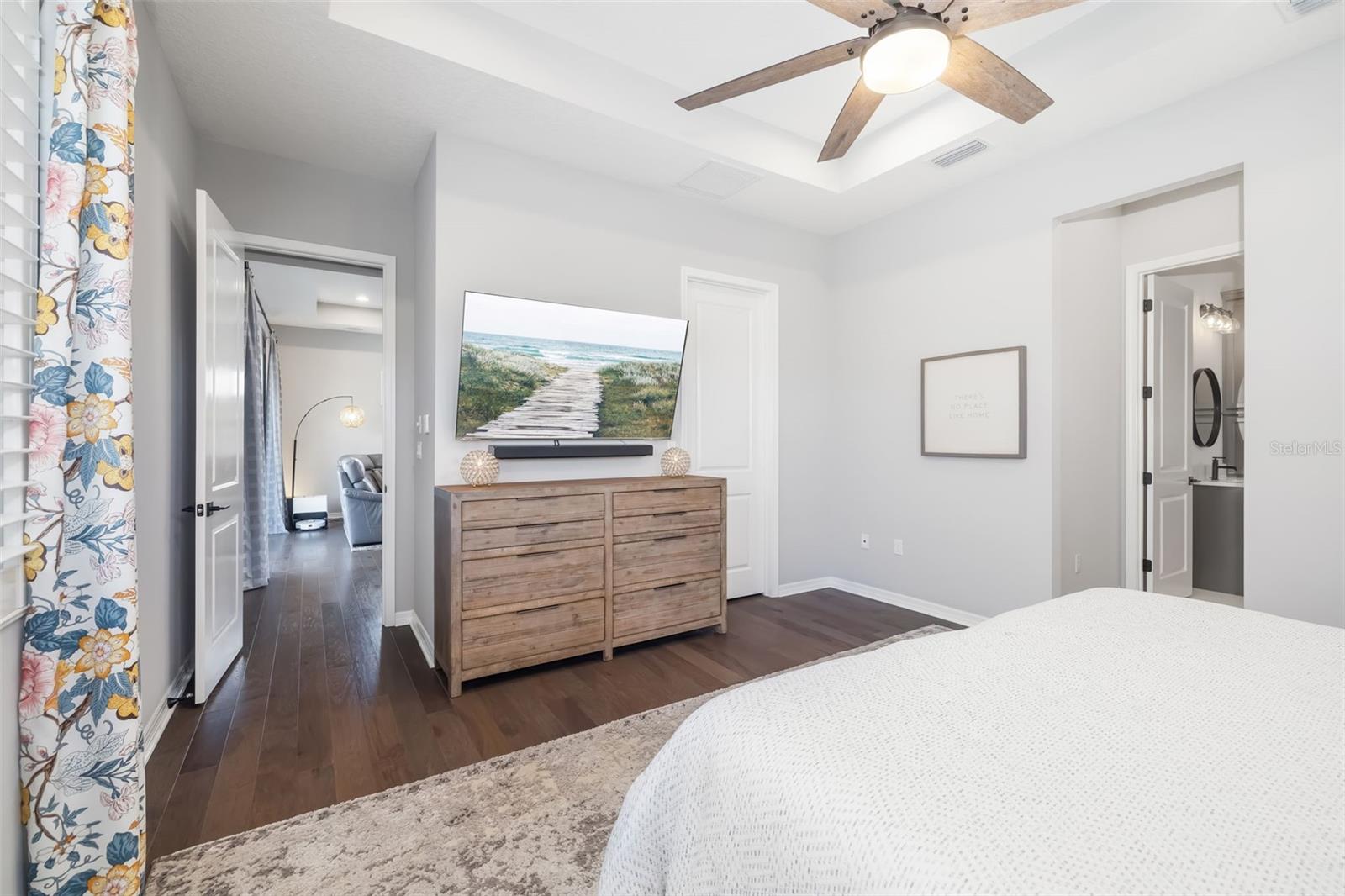 This stunning 2021-built single-story pool home is in an exclusive gated enclave of 30 residences, offering maintenance-free lawn care with low HOA fees and no CDD. Perfectly positioned on a private 0.36-acre cul-de-sac lot with no rear neighbors, this meticulously maintained four-bedroom, 2.5-bath home delivers the ideal blend of luxury, comfort and modern convenience. Inside, an open-concept design showcases soaring tray ceilings, recessed LED lighting and rich hardwood flooring throughout. The great room serves as a striking focal point, featuring a sleek electric fireplace with customizable lighting and a built-in surround sound system, with integrated speakers extending throughout the home and lanai for seamless indoor-outdoor living. Expansive triple sliding glass doors open to the screened lanai, creating an effortless connection to the outdoor space. The gourmet kitchen is both elegant and functional, featuring upgraded soft-close cabinetry, quartz countertops, a designer tile backsplash, and a spacious center island with counter-height seating and custom pendant lighting. A stylish dry bar with a beverage refrigerator enhances the space, while premium Samsung smart black stainless-steel appliances, including a gas cooktop with a vented hood, a built-in convection wall oven with a Flex Duo divider and a steam cooking and convection microwave, complete this chef-inspired kitchen. The private primary suite offers a peaceful retreat with an 11-foot tray ceiling, plantation shutters and two custom walk-in closets. The spa-like en-suite bath features a dual quartz vanity, an expansive double walk-in shower with frameless glass, and modern matte black fixtures. Secondary bedrooms are generously sized, each with 10-foot ceilings, plantation shutters, ceiling fans and in-ceiling speakers with individual controls. A well-appointed laundry room includes custom cabinetry, quartz countertops, a deep utility sink and a subway tile backsplash. Outdoor living is exceptional, featuring a covered and screened lanai with paver decking that opens to a heated saltwater pool, complete with a sun shelf, color-changing LED lighting, a waterfall and a bubbling fountain, all conveniently controlled from your smartphone. The custom summer kitchen is ideal for entertaining, offering marine-grade cabinetry, granite countertops, a gas grill, sink and a beverage refrigerator. Additional upgrades include smart home technology with a Ring doorbell and security, keyless entry, and Z-wave lighting; a two-car garage with epoxy flooring, built-in storage and an EV charging outlet; a whole-house water softener; and a tankless gas water heater. With HOA services covering lawn care, irrigation, cable, and high-speed internet, this home offers an effortless, luxury lifestyle. Don't miss the opportunity to own this exceptional, like-new residence.