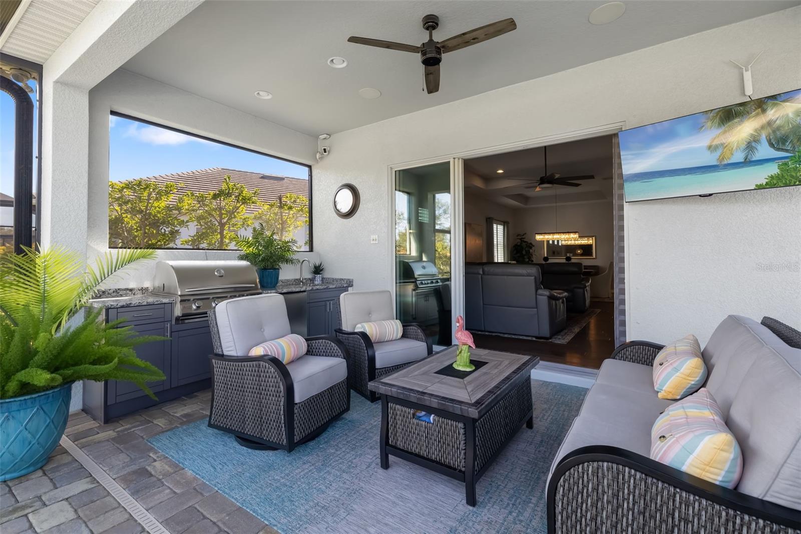 Exterior: Outdoor Grill, Outdoor Kitchen, Rain Gutters, Sidewalk, Sliding Doors