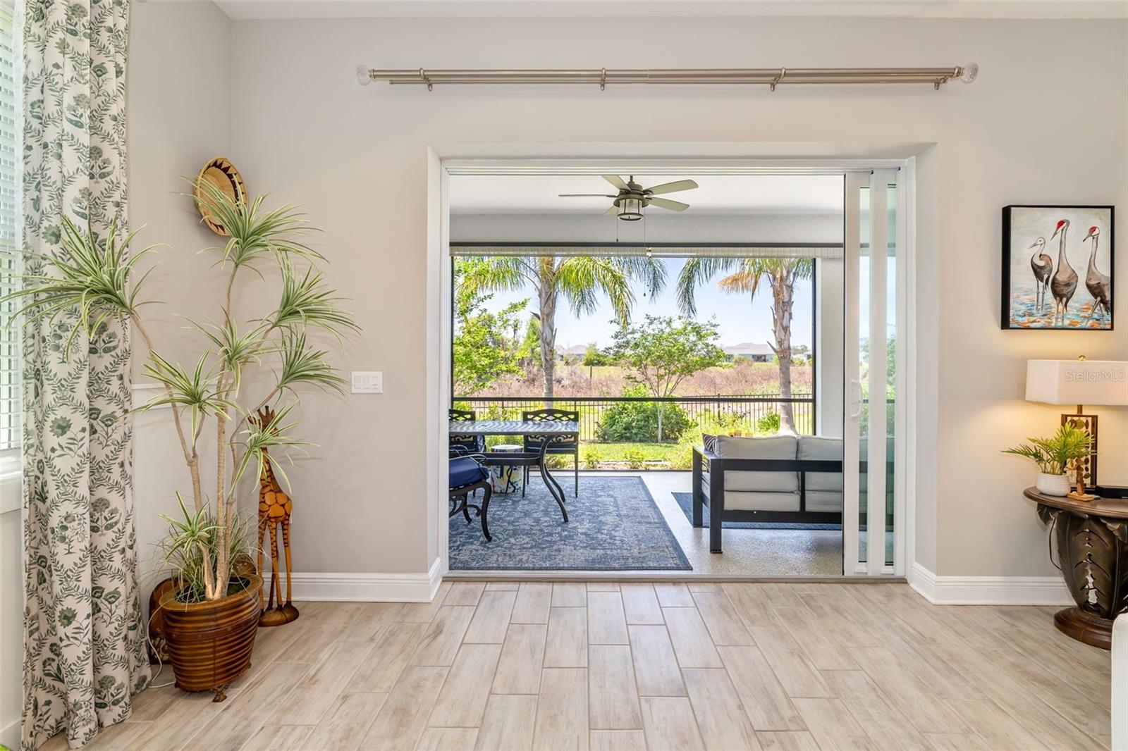 Welcome to this beautifully upgraded residence located in the highly desirable Canoe Creek community in Parrish. This thoughtfully enhanced 3-bedroom, 2.5-bath home with a flexible den/office space offers a perfect blend of modern comfort, functionality, and Florida-style living.From the moment you enter, you'll notice the spacious, open-concept design with high ceilings and an abundance of natural light. The main living areas flow effortlessly, creating an ideal environment for both everyday living and entertaining. The kitchen serves as the heart of the home, featuring a large center island, ample cabinetry, and seamless connection to the dining and living spaces.The primary suite offers a peaceful retreat, complete with a well-appointed ensuite bathroom and generous closet space. Two additional bedrooms, each with walk-in closets, provide comfort for family or guests, while the dedicated den with French doors offers the perfect space for a home office, media room, or additional lounge area.Step outside to your extended screened lanai, already equipped with gas, water, and electric connections ready for a future outdoor kitchen or entertainment setup. The fully fenced backyard has been meticulously landscaped and enhanced over time, including mature plantings and thoughtfully designed garden beds that add both privacy and charm. Enjoy tranquil green space views and stunning Florida sunsets right from your backyard.This home has been extensively improved with valuable upgrades, including impact-rated double-hung windows and impact patio doors (with transferable warranties), updated HVAC components, a newer water heater expansion tank, epoxy-coated garage flooring, upgraded gutters, enhanced irrigation system with sediment filtration, and professionally installed wainscoting in the main living area. Additional features such as smart ceiling fans, dimmer switches, flood lighting, and a built-in security system further elevate the home's comfort and convenience.The exterior has also been carefully curated with both front and rear landscaping improvements, including the addition of palm trees and flowering plants, creating beautiful curb appeal and a more private outdoor setting.Located in Canoe Creek, residents enjoy access to resort-style amenities including a community pool, fitness center, pickleball courts, dog parks, and social spaces all within a welcoming, active neighborhood. With low HOA fees and no CDD, this community offers exceptional value.This move-in ready home presents a rare opportunity to own a meticulously maintained and upgraded property in one of Parrish's most sought-after communities. Furniture is included in the sale and is negotiable, offering a seamless move-in experience for a full-time residence or seasonal retreat.Schedule your private showing today and experience all that this exceptional home has to offer.