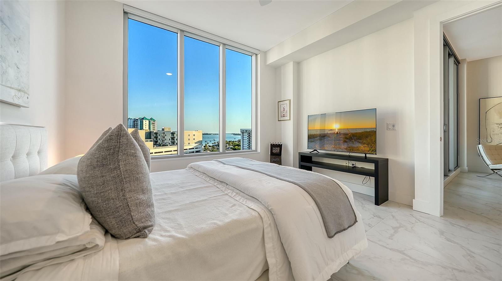 Residence 1013 at The Mark Sarasota offers a rare combination of comfort, convenience, and newer construction in the heart of downtown. Built in 2019, this residence provides modern peace of mind with impact hurricane glass and exterior doors, along with soaring 10-foot ceilings and a bright, open feel throughout. The home includes two deeded side-by-side covered parking spaces located just 20 feet from the elevator, an exceptional convenience rarely found downtown. Positioned on the quiet and highly desirable side of the building, the residence enjoys southern exposure and beautiful views overlooking the pool, with sightlines extending toward Sarasota Bay and the Gulf of Mexico. Set on the 10th floor, this thoughtfully designed layout features two bedrooms plus a den and two-and-a-half baths across 1,577 square feet, along with a covered terrace that extends the living space outdoors. The split-bedroom floor plan provides privacy while maintaining an open, functional flow ideal for both everyday living and entertaining. Walls of glass fill the home with natural light and frame tranquil views over the treetops toward Paul Thorpe Park and the Mermaid Fountain. The kitchen blends style and function with imported cabinetry, stone countertops, designer backsplash, stainless steel appliances, and an upgraded induction cooktop. It connects seamlessly to the main living and dining areas, creating an inviting space to gather. A full-size utility room with additional storage adds everyday practicality. The primary suite opens directly to the terrace and features a spacious walk-in closet and a well-appointed bath with illuminated mirrors and refined finishes. The guest bedroom is privately situated, while the den offers flexibility as a home office or additional lounge space. A climate-controlled storage unit located just down the hall provides added convenience. Residents enjoy The Mark's resort-style amenities, including a heated saltwater pool and spa, outdoor seating and grilling areas, club room with catering kitchen, billiards, fitness center, yoga studio, and spin room. The building also offers a pet-friendly environment, 24/7 front desk staffing, secure lobby access, and overnight roving security. Located in the center of downtown Sarasota, the residence places you just steps from the renowned Sarasota Farmers Market and only two blocks from Whole Foods Market. Cultural attractions including the Sarasota Opera House, Florida Studio Theatre, and Selby Public Library are all within easy reach, along with dining, galleries, and the waterfront. Surrounded by exciting new luxury developments, including the nearby Waldorf Astoria Residences Sarasota, this location continues to elevate as one of downtown's most sought-after areas. Don't miss the opportunity to own a newer-built residence in one of Sarasota's most vibrant and walkable neighborhoods.