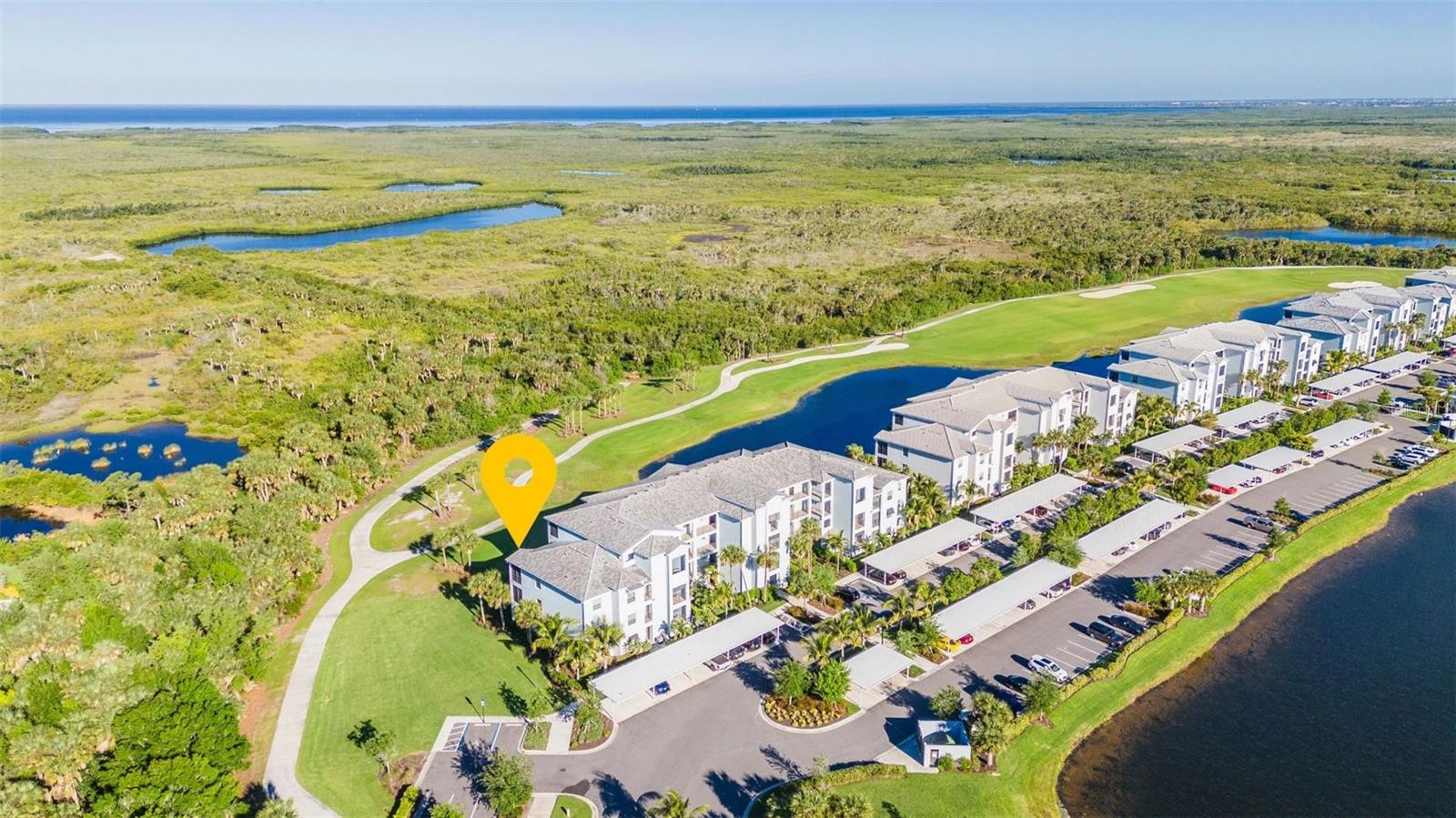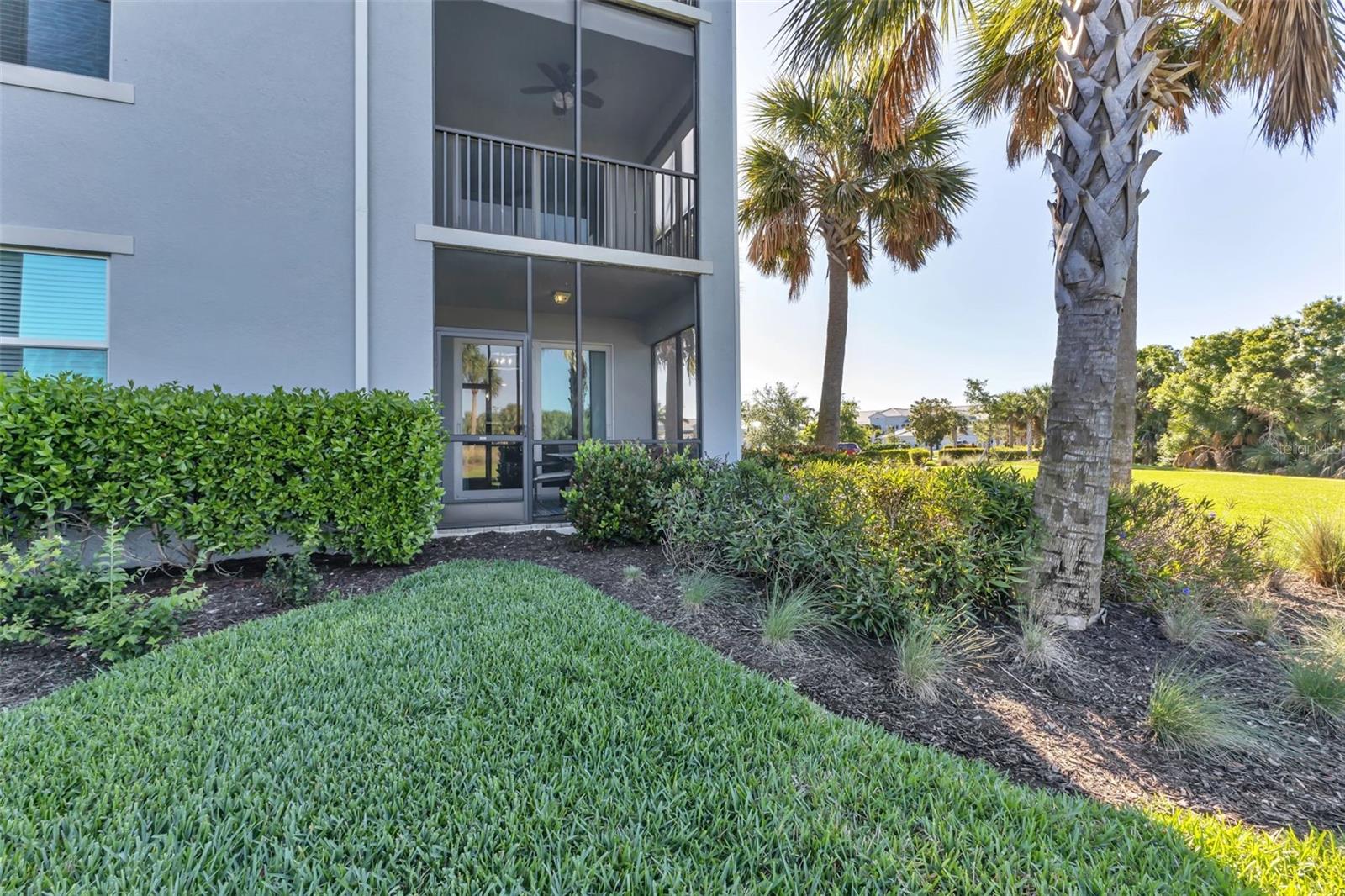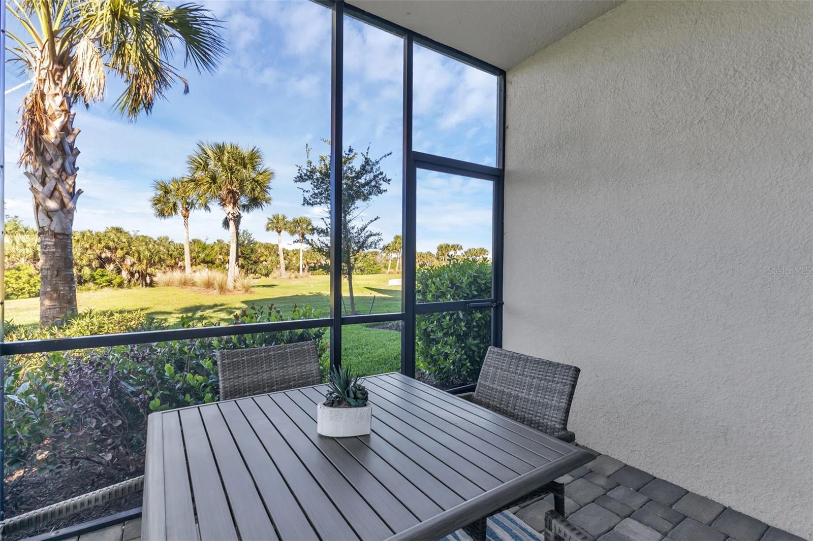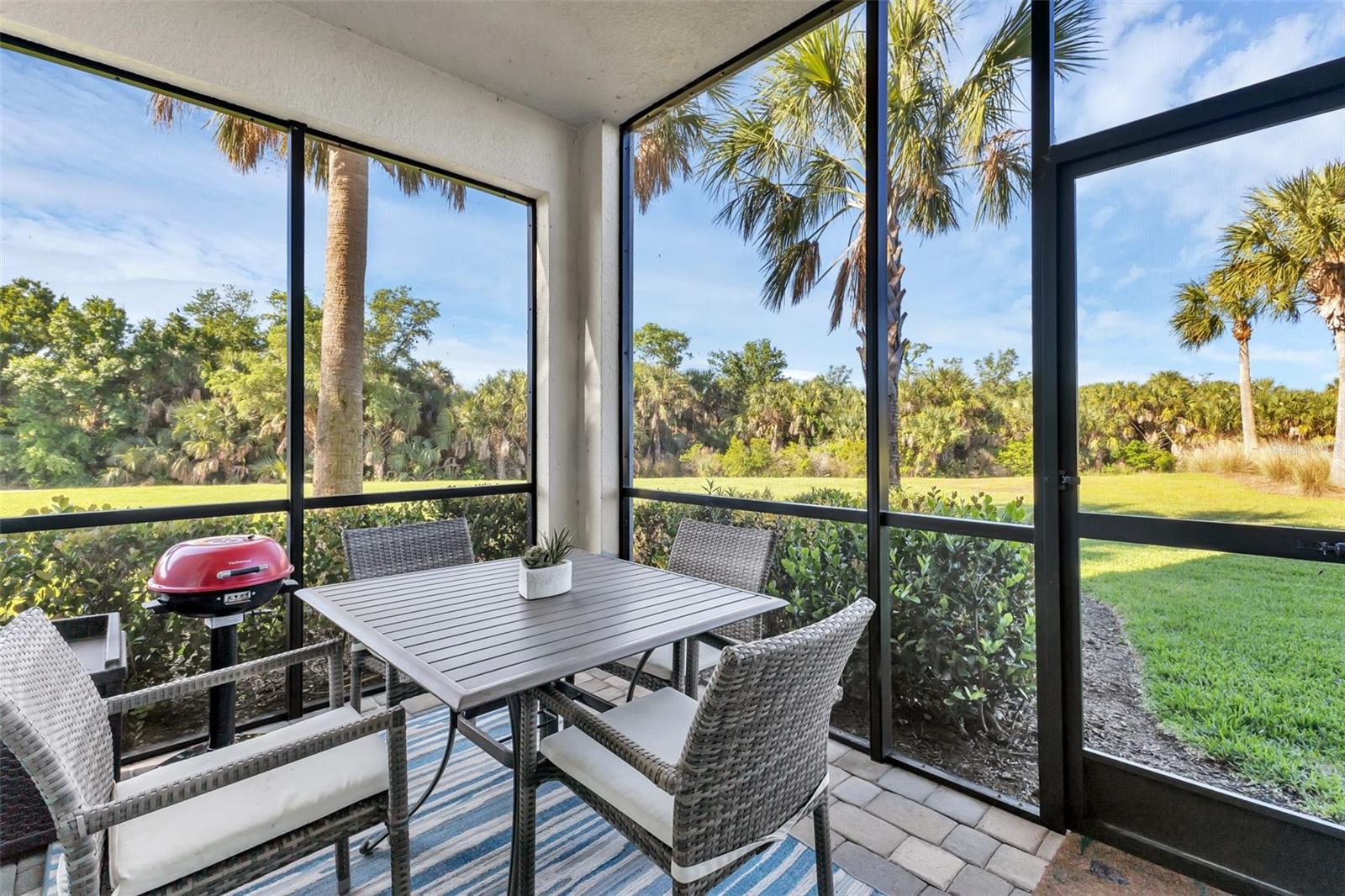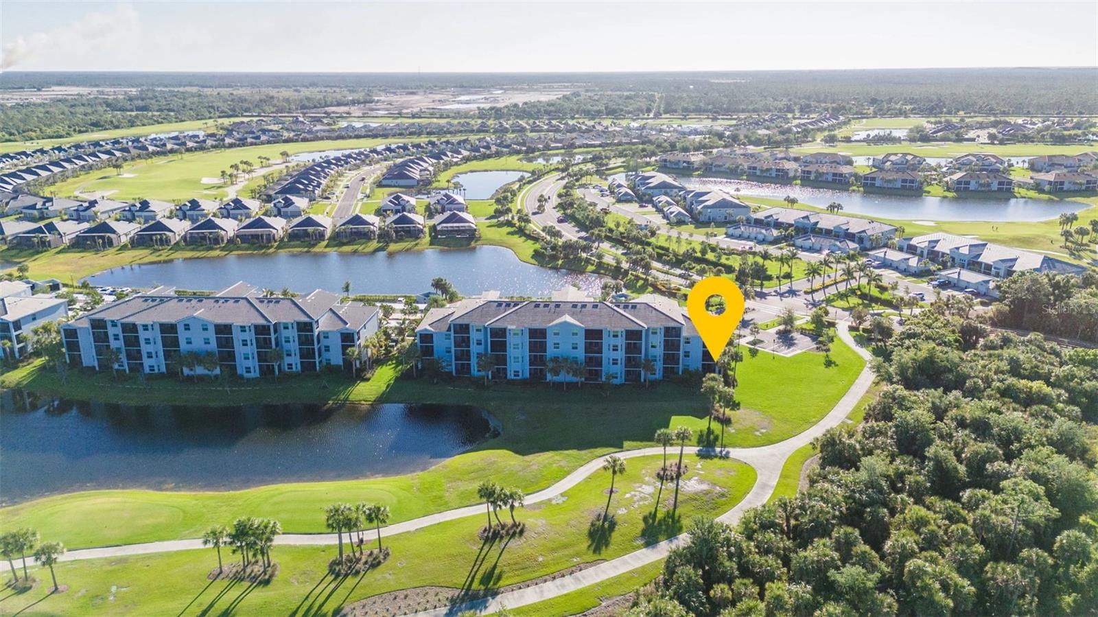Available NOW, this Beautiful Turnkey first floor 3 bed, 2 bath Carolina model condo in the private, gated golf course community of Heritage Landing! (GOLF MEMBERSHIP INCLUDED) With views of the golf course and pond, this tastefully decorated home with clean lines, unique contemporary lighting, and custom paint in cool coastal shades of blue is sure to impress! Stunning 10ft tray ceilings allow for an open, airy feel while the chair rail, crown molding, plantation shutters, and custom drapes show off the thoughtful design of the builder. The spacious kitchen features granite countertops, stainless appliances, breakfast bar, and shaker cabinets and is open to the dining area and comfortable living room. Open the sliders and enjoy your morning coffee and the beautiful Florida weather in the screened-in lanai. The primary is ensuite with dual sinks and tiled shower, while guests will appreciate privacy in the 2nd and 3rd bedrooms and guest bath. Heritage Landing amenities include a resort-style pool featuring gradual entry and lap lanes, a total of three restaurants including an outdoor pool caf, two full-service bars, tennis, pickleball, bocce ball, guard gated entry, fitness center, aerobics room, full-service spa offering nails and massage, and more! This stunning condo will not last long. Start living the laid-back Florida lifestyle today!