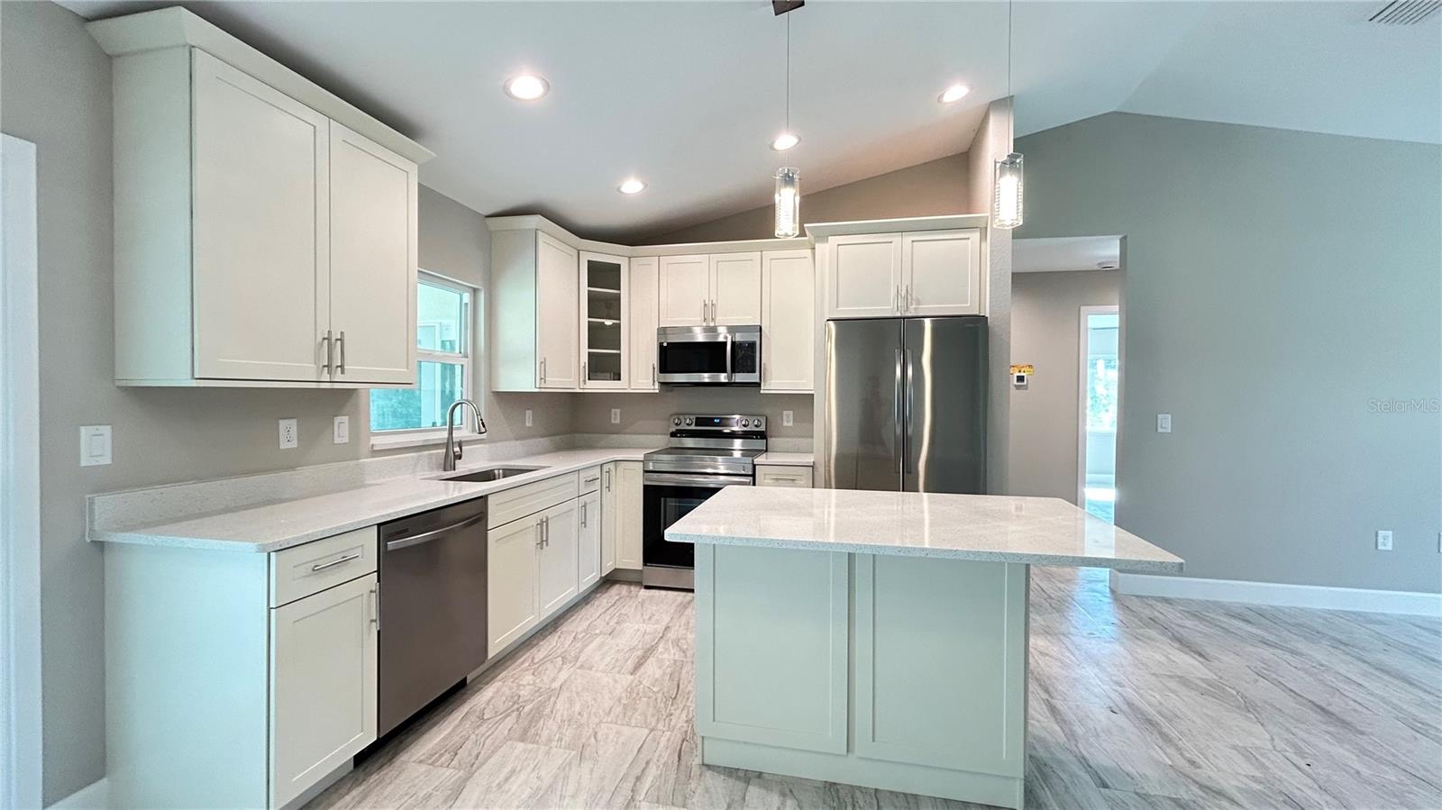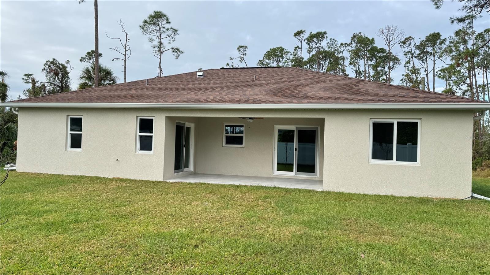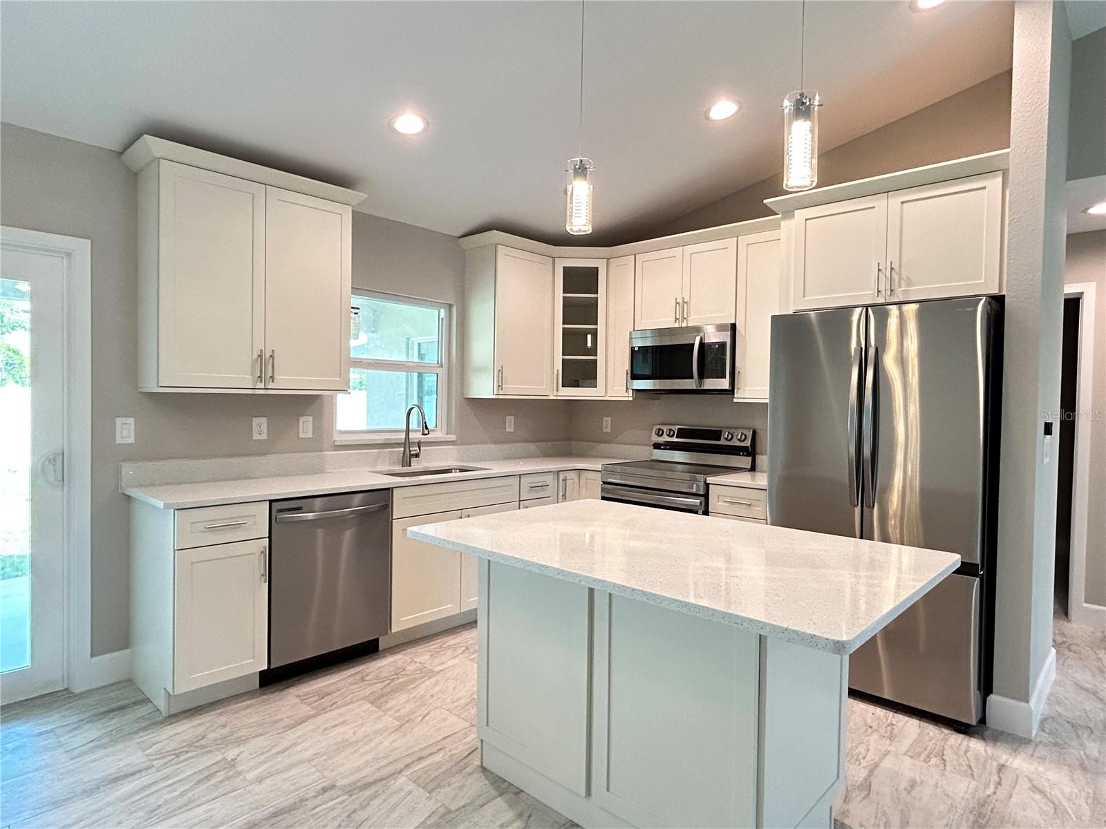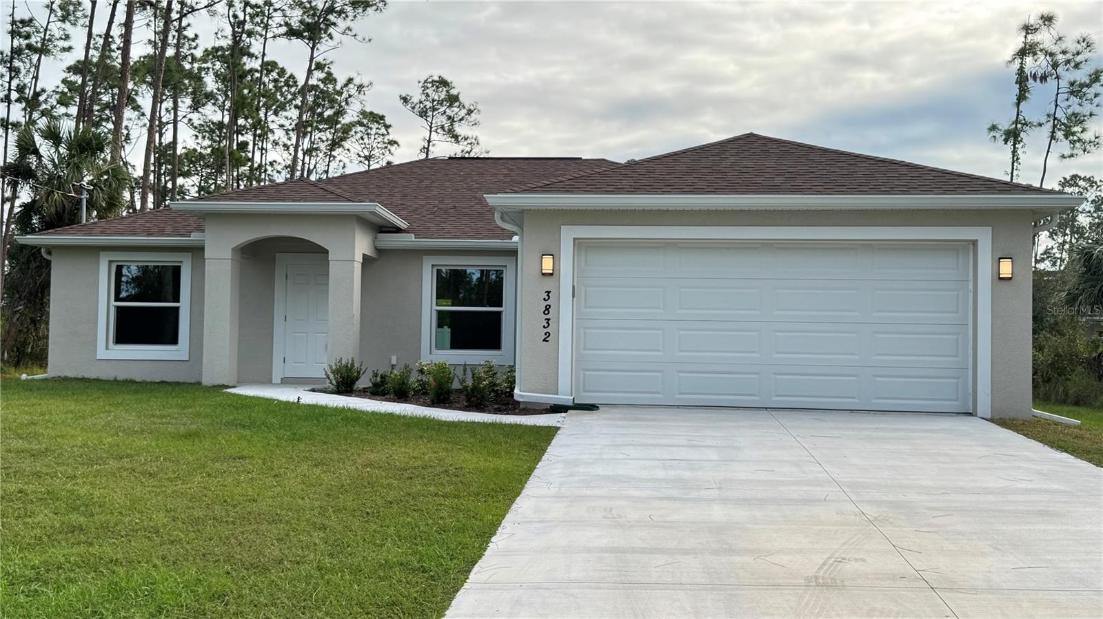COMPLETED AND READY FOR OCCUPANCY. Welcome to this new and beautifully constructed 3 bedrooms + ENCLOSED OFFICE (11x13) with spotlights, 2 bathrooms home with a 2-car garage. It is located in the fast-growing city of North Port. This property features ceramic tile floors throughout the house for easy maintenance, impact windows and impact sliding doors, which do not need hurricane shutters. The living area is expansive and has large sliding glass doors, which open up to the porch. The tiled lanai is under one roof with the house. The kitchen has quartz counter tops. It also features 39'' inches soft closing cabinets, upgraded stainless steel appliances, and a kitchen island overlooking the living and dining/breakfast areas. The master bedroom has a walk-in closet and sliding doors that lead to the lanai. The master bathroom has a linen closet, walk-in shower with a built-in bench and a double sink. Both - the master and guest bathrooms have full-length tiled shower walls. There is also a linen closet in the hall (between two guest bedrooms), and an inside laundry room with a sink. Other features of this home include seamless gutters around the entire house, quartz windowsills. There is plenty of room for a pool.