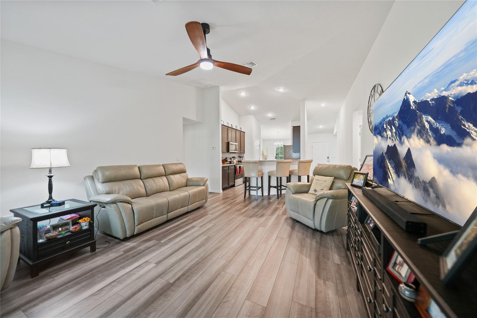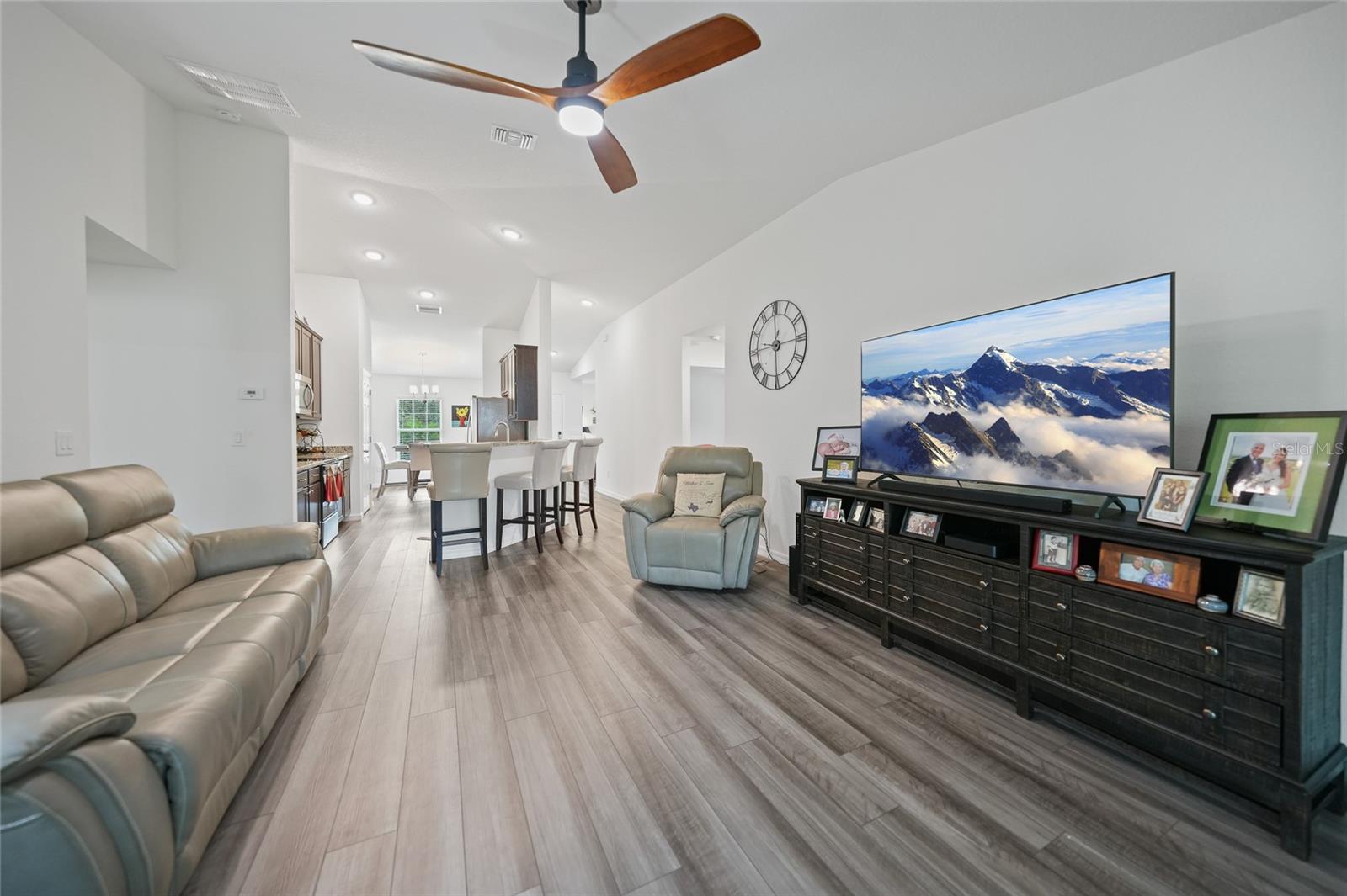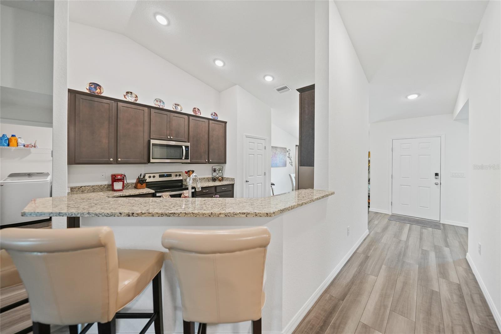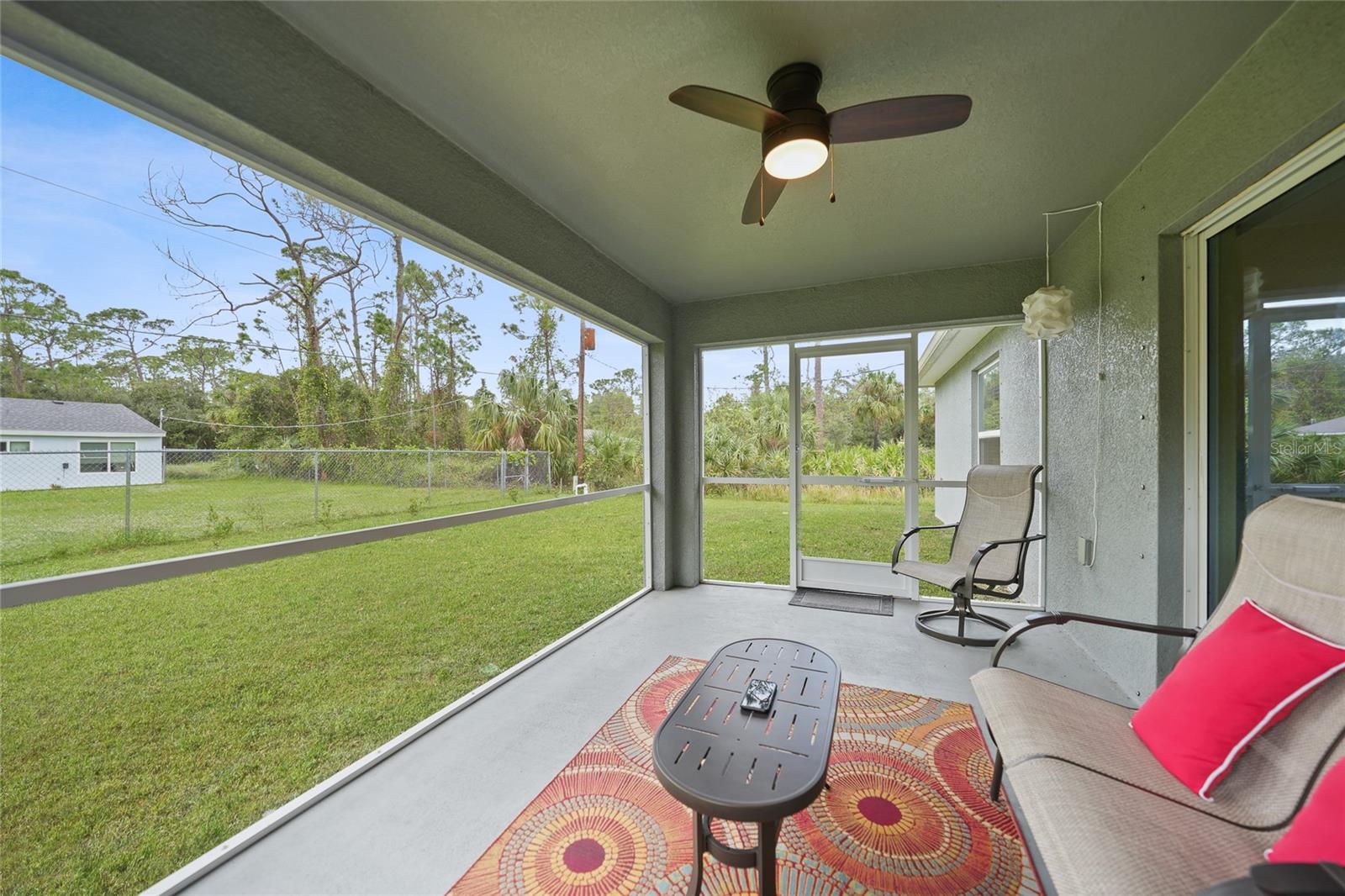 Welcome to this beautifully crafted 3-bedroom, 2-bathroom, 3-car garage home located in the desirable community of Port Charlotte. Built by Holiday Builders, this spacious Fallon model offers an open and inviting layout with modern finishes throughout. Upon entering, you'll be greeted by a formal dining room to the right and a bright living room to the left, both featuring luxury vinyl flooring that flows seamlessly through the main living spaces. The home opens into a spacious living room with soaring ceilings and expansive sliders that lead to the lanai, perfect for indoor-outdoor living. The impressive kitchen is a chef's dream, featuring gorgeous granite countertops, a large breakfast bar, and a pantry closet for ample storage. High-end Whirlpool stainless steel appliances complement the beautiful Shaker-style cabinetry, complete with crown molding, creating an elegant and functional cooking space. The kitchen is open to both the family room and dining room, making it perfect for entertaining. This home boasts a desirable split floor plan, with the spacious owner's suite privately located on one side of the home. The suite features plush carpeting, a custom walk-in closet, and an ensuite bathroom with a walk-in shower and a dual-sink granite vanity for added luxury. On the other side of the home, you'll find two guest bedrooms, both featuring plush carpeting and built-in closets. The guest rooms share a full bathroom, providing comfort and convenience for family or visitors. Convenience is key with a dedicated laundry room, which includes a washer and dryer, flowing seamlessly into the three-car garage. This extra-large garage offers plenty of storage space or room for additional vehicles, a workshop, or hobbies. The 16x10 screened lanai is the perfect spot for relaxing, entertaining, or enjoying a morning coffee while staying protected from the elements. Located in a quiet, well-established neighborhood in Port Charlotte, this home is close to shopping, dining, parks, and schools, offering the best of Florida living.