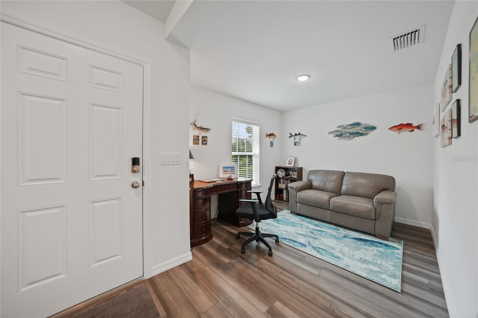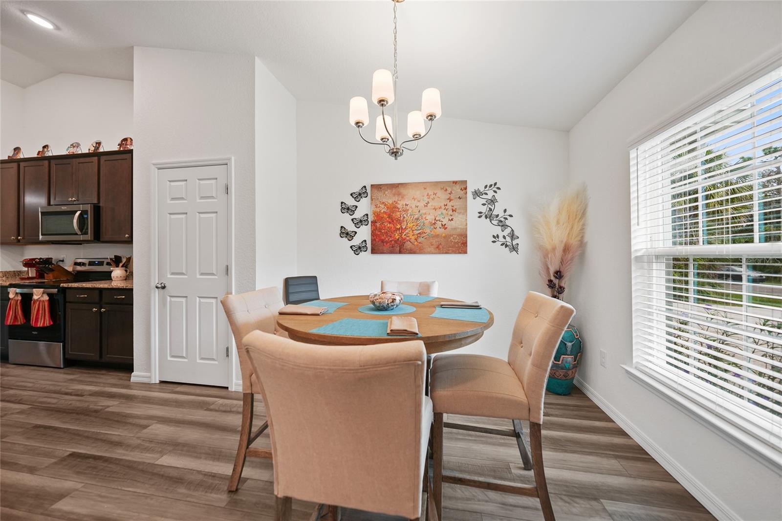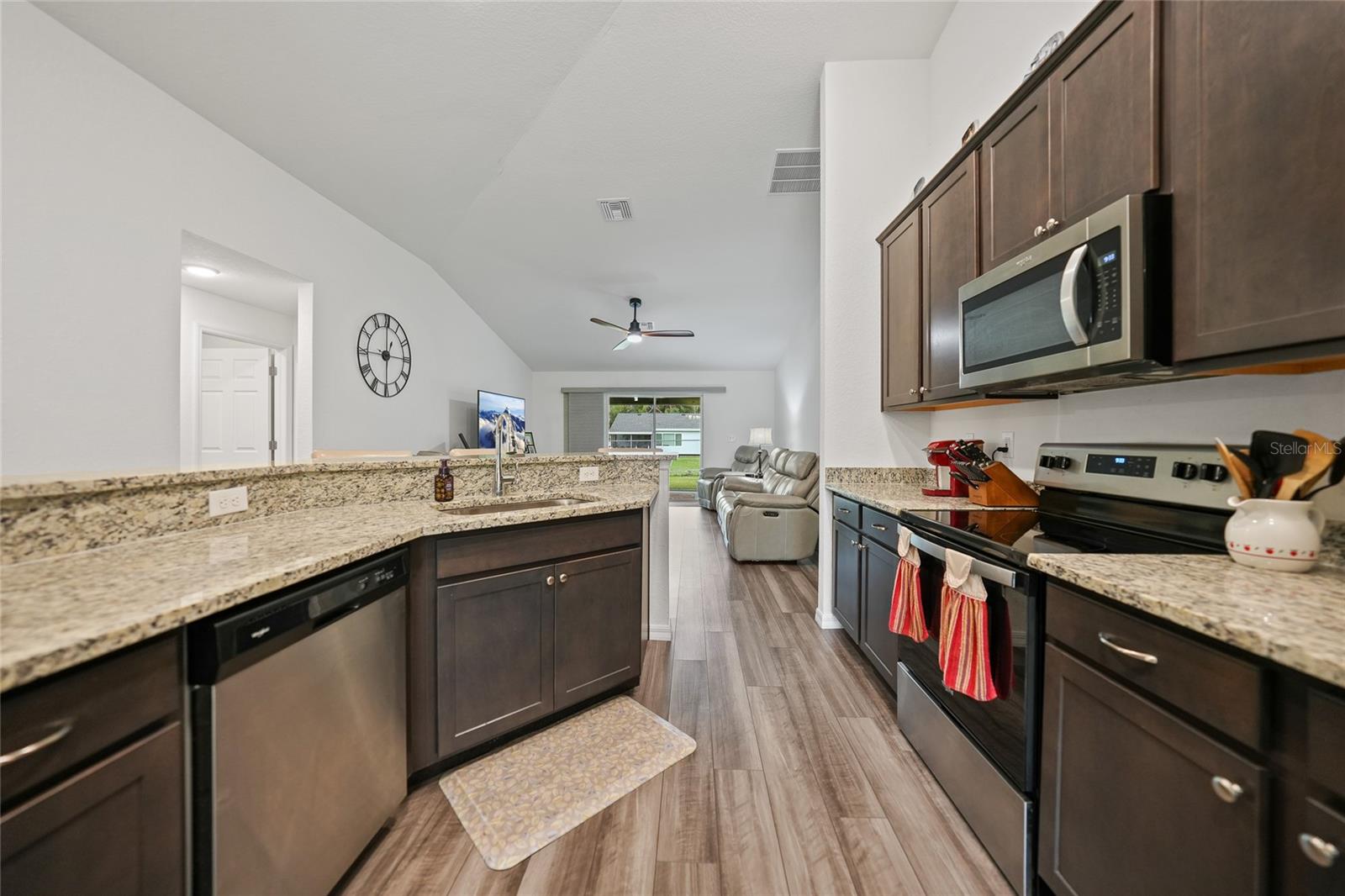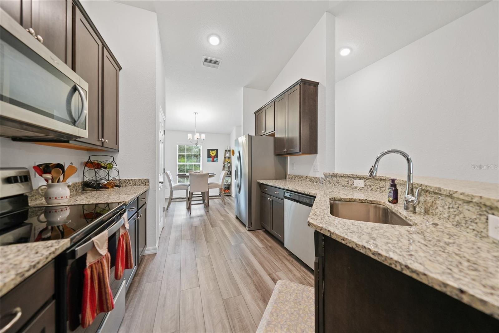 Welcome to this beautifully crafted 3-bedroom, 2-bathroom, 3-car garage home located in the desirable community of Port Charlotte. Built by Holiday Builders, this spacious Fallon model offers an open and inviting layout with modern finishes throughout. Upon entering, you'll be greeted by a formal dining room to the right and a bright living room to the left, both featuring luxury vinyl flooring that flows seamlessly through the main living spaces. The home opens into a spacious living room with soaring ceilings and expansive sliders that lead to the lanai, perfect for indoor-outdoor living. The impressive kitchen is a chef's dream, featuring gorgeous granite countertops, a large breakfast bar, and a pantry closet for ample storage. High-end Whirlpool stainless steel appliances complement the beautiful Shaker-style cabinetry, complete with crown molding, creating an elegant and functional cooking space. The kitchen is open to both the family room and dining room, making it perfect for entertaining. This home boasts a desirable split floor plan, with the spacious owner's suite privately located on one side of the home. The suite features plush carpeting, a custom walk-in closet, and an ensuite bathroom with a walk-in shower and a dual-sink granite vanity for added luxury. On the other side of the home, you'll find two guest bedrooms, both featuring plush carpeting and built-in closets. The guest rooms share a full bathroom, providing comfort and convenience for family or visitors. Convenience is key with a dedicated laundry room, which includes a washer and dryer, flowing seamlessly into the three-car garage. This extra-large garage offers plenty of storage space or room for additional vehicles, a workshop, or hobbies. The 16x10 screened lanai is the perfect spot for relaxing, entertaining, or enjoying a morning coffee while staying protected from the elements. Located in a quiet, well-established neighborhood in Port Charlotte, this home is close to shopping, dining, parks, and schools, offering the best of Florida living.