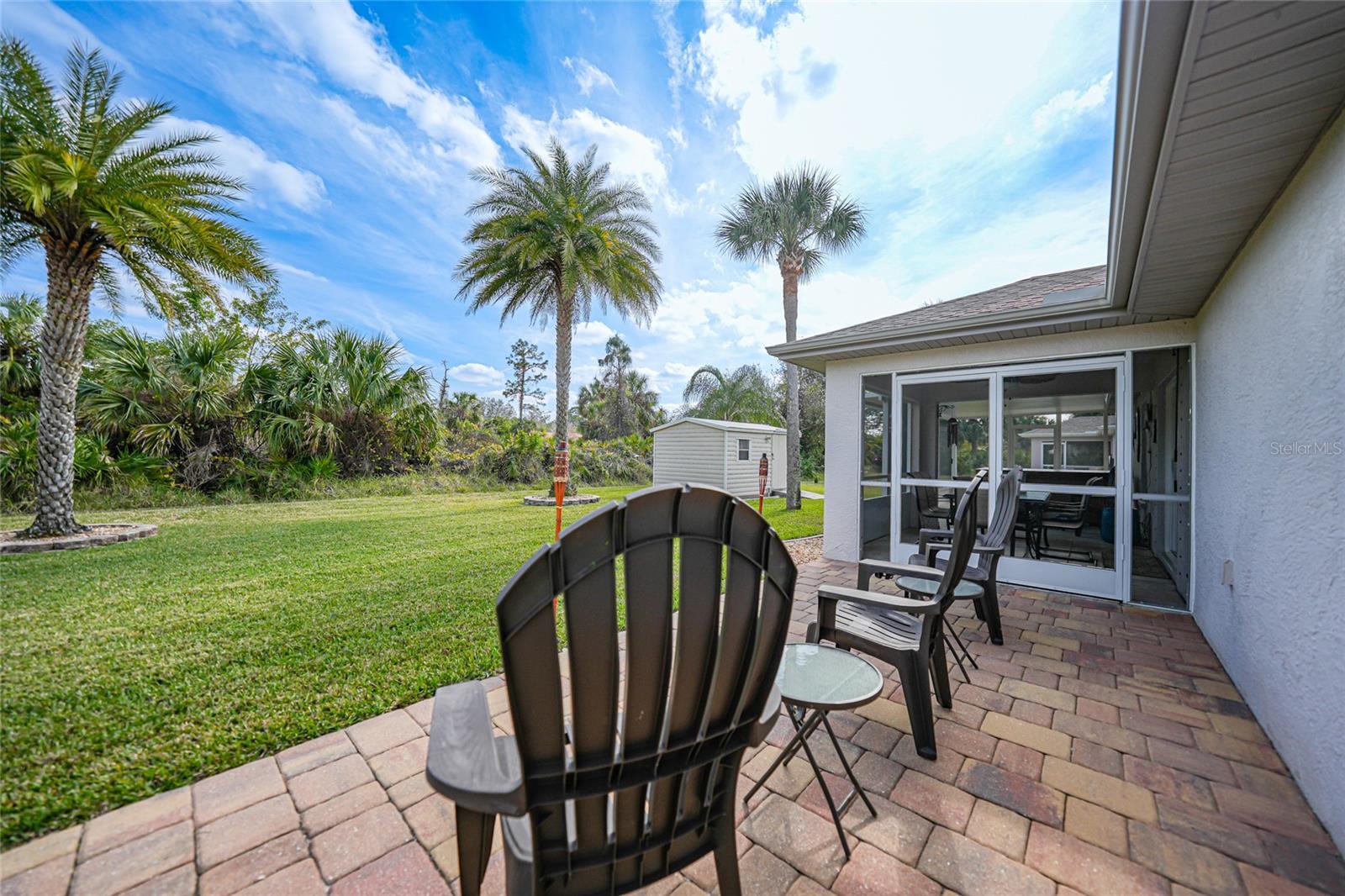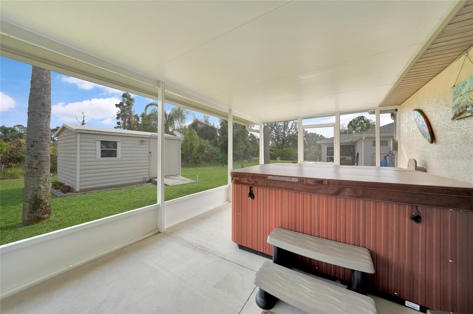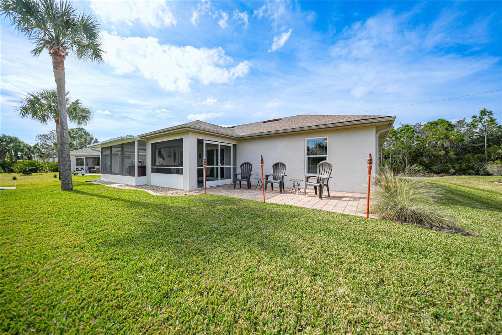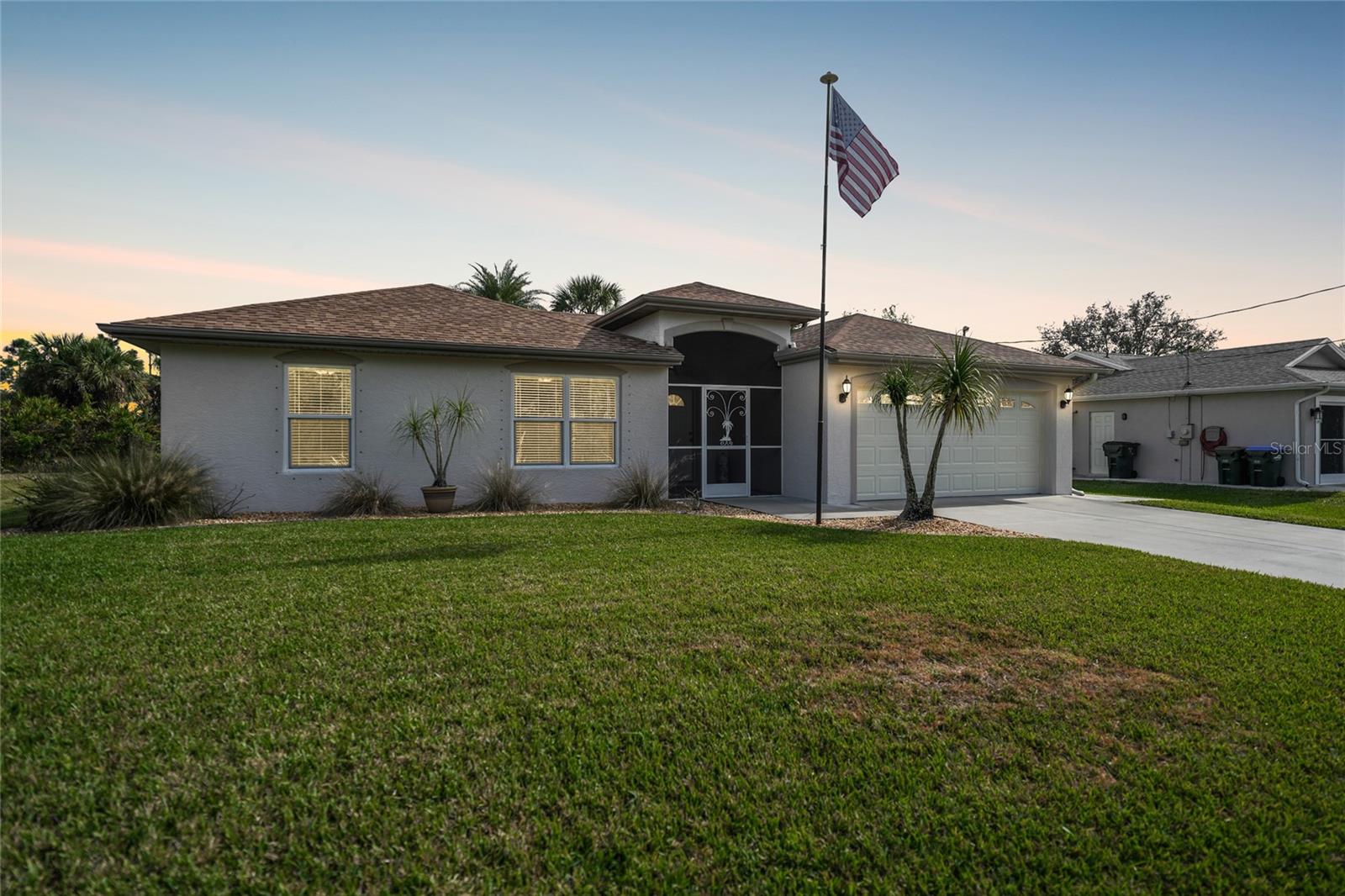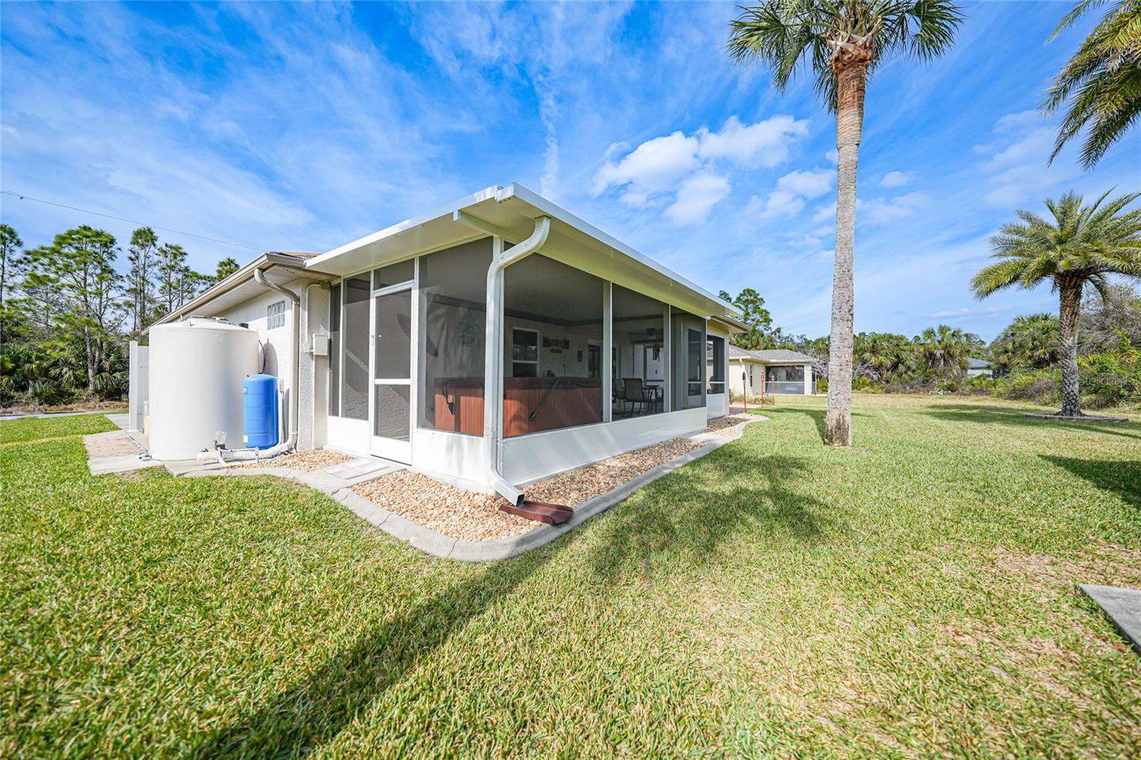 Welcome to your dream home! This beautifully maintained 3-bedroom, 2-bathroom, 2 car garage residence offers 1,350 square feet of modern living space, situated on a spacious 10,000-square-foot lot. Recently updated with a new roof (2023), this home showcases a smart split floor plan with soaring ceilings, blending style and function effortlessly. As you step inside, you'll immediately notice the ceramic tile and wood laminate flooring throughout the home, creating a warm and inviting atmosphere. The heart of the home is the chef-inspired kitchen, featuring sleek hardwood soft-close cabinets, high-end stainless steel appliances, granite countertops, and a Whole House Reverse Osmosis system. The dining area boasts charming windows that overlook the front yard, creating a perfect spot for casual meals. The open-concept design seamlessly connects the kitchen to the spacious great room, where sliding doors lead to the expansive lanai with Jacuzzi and brick paver patio--ideal for outdoor entertaining or simply relaxing. The primary bedroom is a true sanctuary, offering a tray ceiling with industrial style ceiling fan and a custom walk-in closet. The en-suite bath includes a walk-in shower, extended vanity, and a convenient linen closet. Two additional well-sized guest bedrooms, each with built-in closets, share a full bathroom, ensuring comfort and privacy for family and visitors. The large backyard is a blank canvas with plenty of space for a pool, providing endless opportunities for outdoor living. A 12x14 shed with electricity adds additional storage or workspace options. Surrounded by lush, wooded land in the back, the property provides a serene and peaceful outdoor retreat. The two-car garage includes a dedicated laundry area, adding convenience and practicality to this already exceptional home. With impact glass windows (2023) and an updated A/C system (2016), this home is ready for years of worry-free living. Don't miss the chance to own this beautifully updated property that blends modern features with ample space and a prime location! Situated in a desirable North Port neighborhood, this home is not located in a flood zone or subject to HOA fees. It's conveniently close to I-75 and Tamiami Trail, with quick access to some of Florida's best beaches, golf courses, public boat ramps, shopping, dining, and entertainment options.