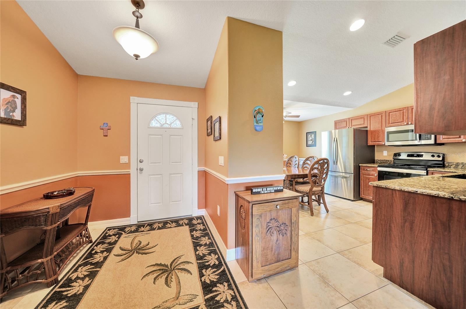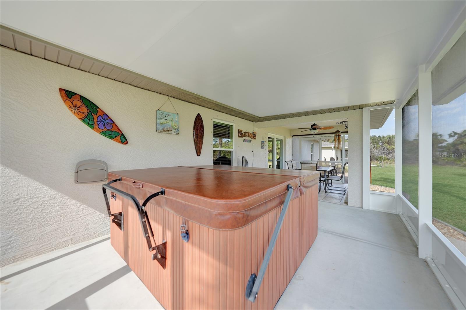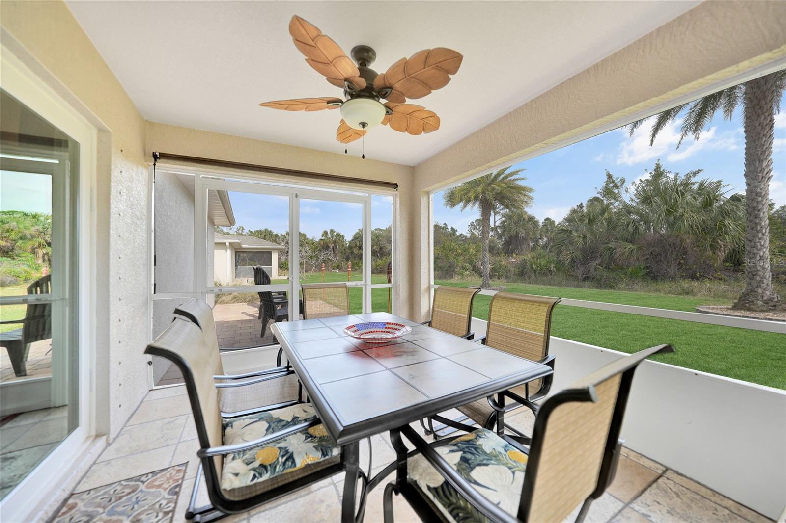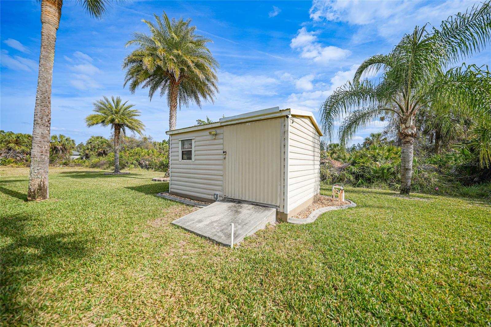 Welcome to your dream home! This beautifully maintained 3-bedroom, 2-bathroom, 2 car garage residence offers 1,350 square feet of modern living space, situated on a spacious 10,000-square-foot lot. Recently updated with a new roof (2023), this home showcases a smart split floor plan with soaring ceilings, blending style and function effortlessly. As you step inside, you'll immediately notice the ceramic tile and wood laminate flooring throughout the home, creating a warm and inviting atmosphere. The heart of the home is the chef-inspired kitchen, featuring sleek hardwood soft-close cabinets, high-end stainless steel appliances, granite countertops, and a Whole House Reverse Osmosis system. The dining area boasts charming windows that overlook the front yard, creating a perfect spot for casual meals. The open-concept design seamlessly connects the kitchen to the spacious great room, where sliding doors lead to the expansive lanai with Jacuzzi and brick paver patio--ideal for outdoor entertaining or simply relaxing. The primary bedroom is a true sanctuary, offering a tray ceiling with industrial style ceiling fan and a custom walk-in closet. The en-suite bath includes a walk-in shower, extended vanity, and a convenient linen closet. Two additional well-sized guest bedrooms, each with built-in closets, share a full bathroom, ensuring comfort and privacy for family and visitors. The large backyard is a blank canvas with plenty of space for a pool, providing endless opportunities for outdoor living. A 12x14 shed with electricity adds additional storage or workspace options. Surrounded by lush, wooded land in the back, the property provides a serene and peaceful outdoor retreat. The two-car garage includes a dedicated laundry area, adding convenience and practicality to this already exceptional home. With impact glass windows (2023) and an updated A/C system (2016), this home is ready for years of worry-free living. Don't miss the chance to own this beautifully updated property that blends modern features with ample space and a prime location! Situated in a desirable North Port neighborhood, this home is not located in a flood zone or subject to HOA fees. It's conveniently close to I-75 and Tamiami Trail, with quick access to some of Florida's best beaches, golf courses, public boat ramps, shopping, dining, and entertainment options.