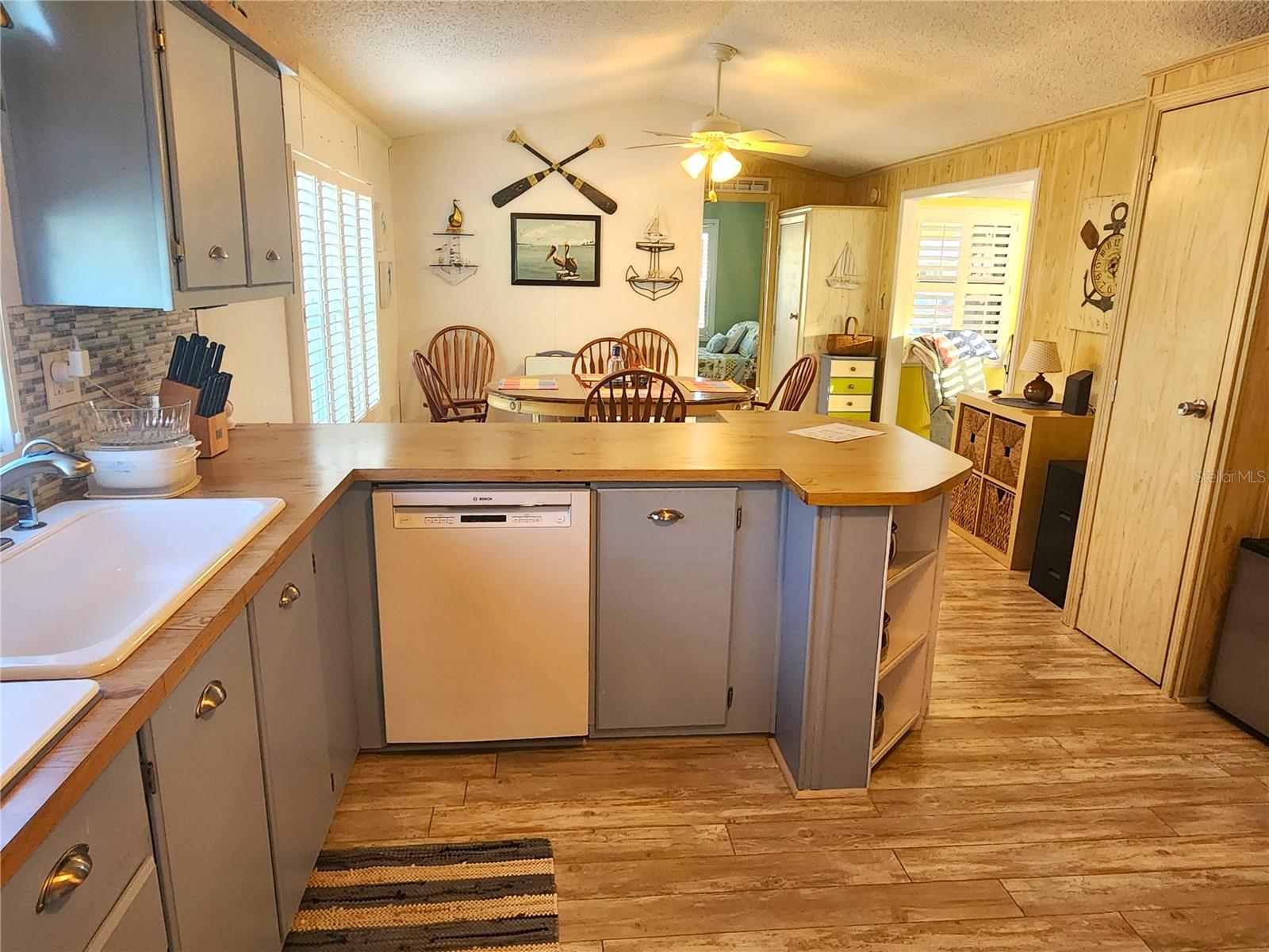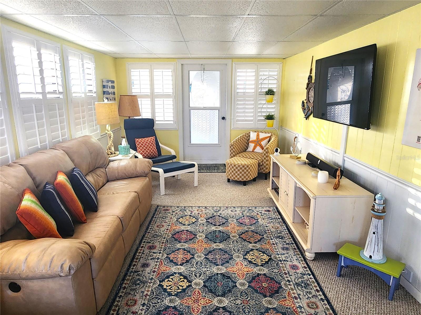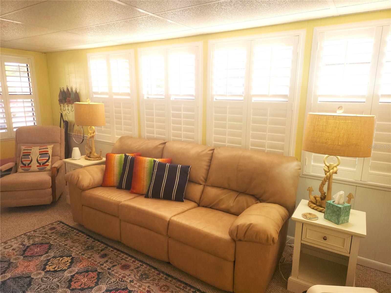 A must see, turn-key, fashionably furnished home will delight you with a fresh seashore decor, plantation shutters throughout and expanded living room adding almost 400 square feet to the a/c living area. Airy and light is the feeling you'll have in this unit due to high ceilings, lots of natural light and all furnishings are clean and comfortable. The newly renovated kitchen comes with all appliances including a reverse osmosis filtration system, dishwasher, large refrigerator, glasstop range and built-in microwave. Master bedroom is larger than most and has a private en suite bathroom with step-in shower and linen closet. The second bedroom has a sunny bay window, fold up bed and task desk allowing for multiple uses. Coach also offers additional parking with second driveway and separate storage shed. Holiday Park is a premier land-owned, DEEDED community offering an exceptional lifestyle with a low monthly maintenance fee of $195 ($2,340.00/year), conveniently included in your tax bill. Residents enjoy access to two well-appointed clubhouses, two inviting swimming pools, and a comprehensive fitness center, ensuring ample opportunities for relaxation and recreation. Whether you live here full-time or seasonally, you will feel like you are on VACATION EVERY DAY.