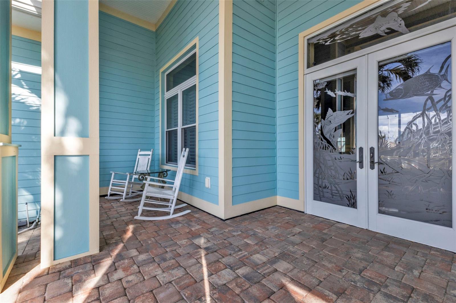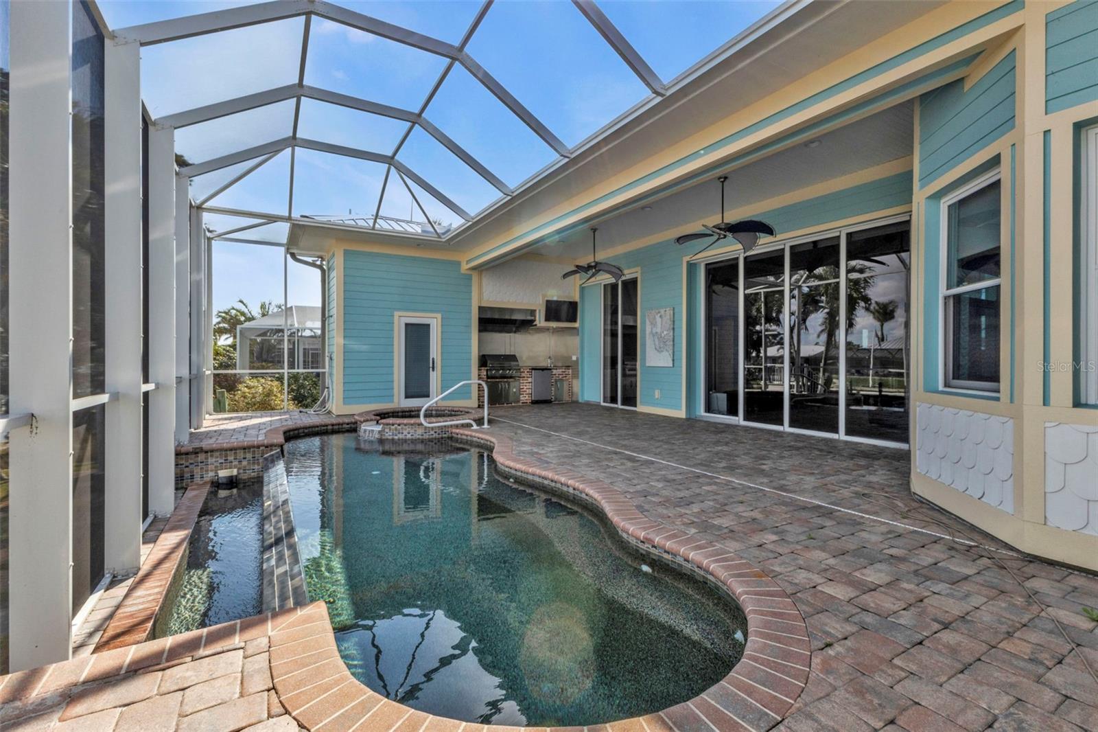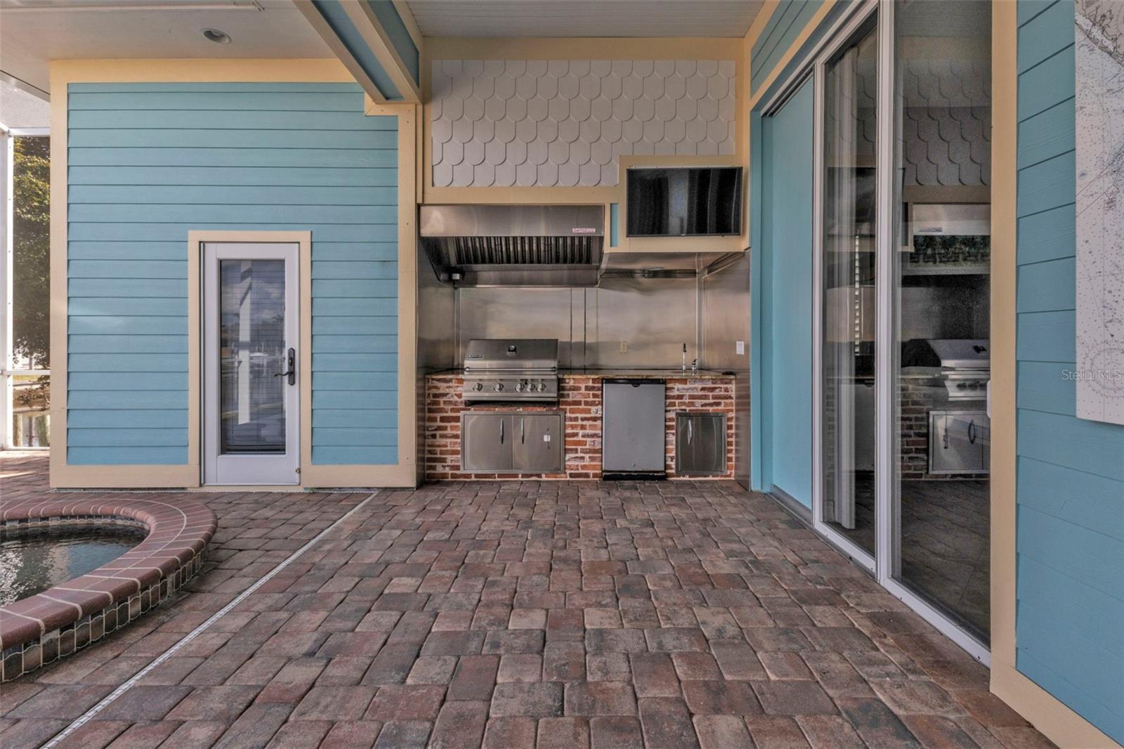 Exterior: Hurricane Shutters, Lighting, Other, Outdoor Grill, Outdoor Kitchen, Outdoor Shower, Rain Gutters, Sidewalk, Sliding Doors, Storage