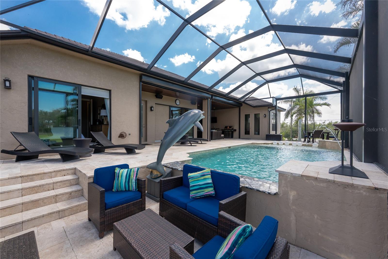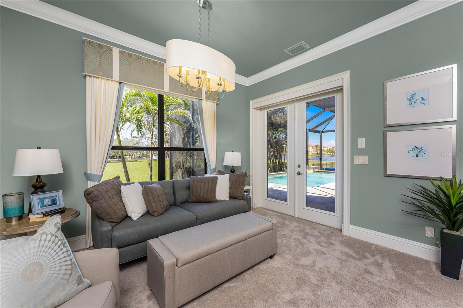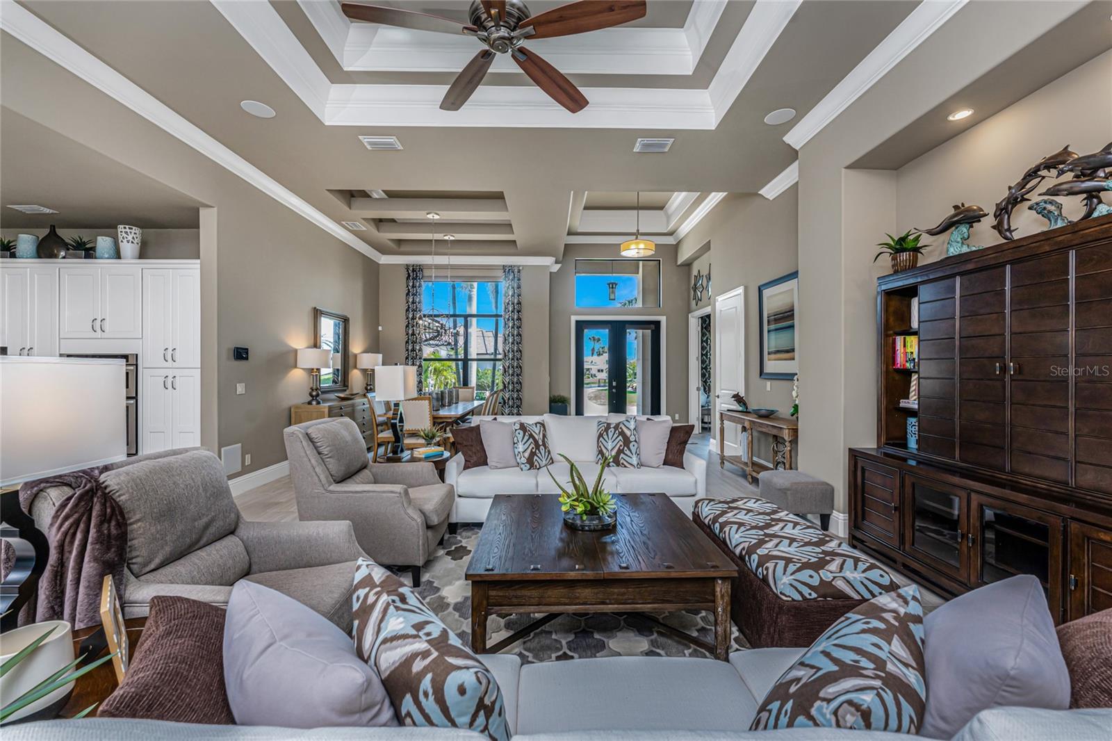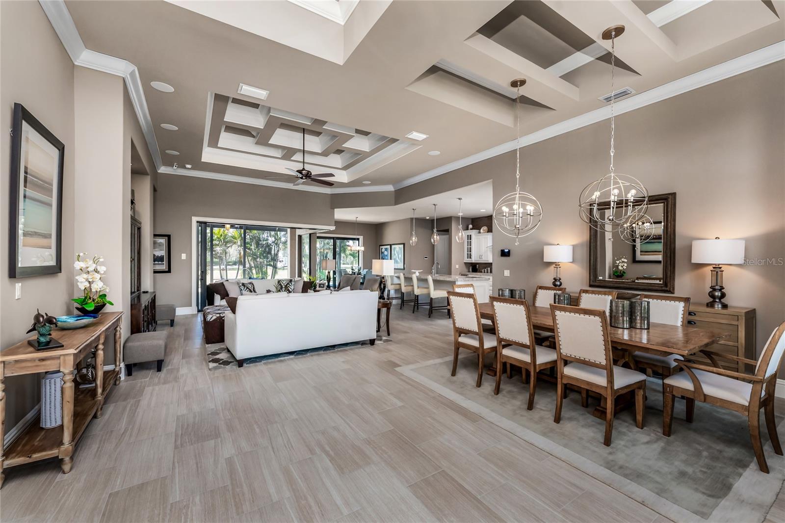 BACK ON THE MARKET DUE TO BUYER DEFAULT - NOW AN OPPORTUNITY FOR YOU! Welcome to your dream home! This former builder's model, crafted by award-winning PGI Homes in 2014, blends comfort, style, & luxury. Offered turnkey furnished including items in the garage, this 3-bedroom, 2-bath home with an office spans 2,680 sq. ft. features an oversized lanai and pool area. A circular paver driveway with lush landscaping leads to an elegant double-door entry. Inside, soaring ceilings with crown molding, an open-concept design and abundant natural light highlight the beautifully furnished space. The great room features a coffered ceiling, while the dining room showcases a unique architectural ceiling. The gourmet kitchen boasts a large 3" edge Silestone quartz countertop with the center island seating for four, a striking tile backsplash, KitchenAid stainless steel appliances, an induction cooktop with a sleek hood, and ample storage in classic white cabinetry. The luxurious primary suite includes a sitting area, French doors to the pool, a tray ceiling, and elegant lighting. Two walk-in closets lead to a spa-like bath with a crystal chandelier, soaking tub, Roman shower with dual heads, and dual vanities with Silestone quartz counters. The guest wing offers two spacious bedrooms and a pool-access bath with custom tile and a glass-walled shower. A standout 3-car garage features wood flooring, crown molding, recessed lighting, and newly installed independent climate control ideal for vehicles or a home gym. BRAND NEW York 5 ton, 16.2 seer AC installed August 2025. Smart home features include a Z-Wave system, security cameras, & a Nuvo sound system with built-in speakers. Additional peace of mind comes with all impact windows and doors, plus electric Kevlar protection across the back lanai and a 2023 stone-coated metal roof. Disappearing sliders open to a wood-ceilinged lanai, summer kitchen, and wall-mounted TV. The expansive travertine pool deck boasts a heated pool with fountains, a sun platform, a submerged granite bar, and multiple lounging area all overlooking a gorgeous lake view. Close to Ponce de Leon Park and minutes to Fishermen's Village - THIS IS YOUR DREAM HOME!