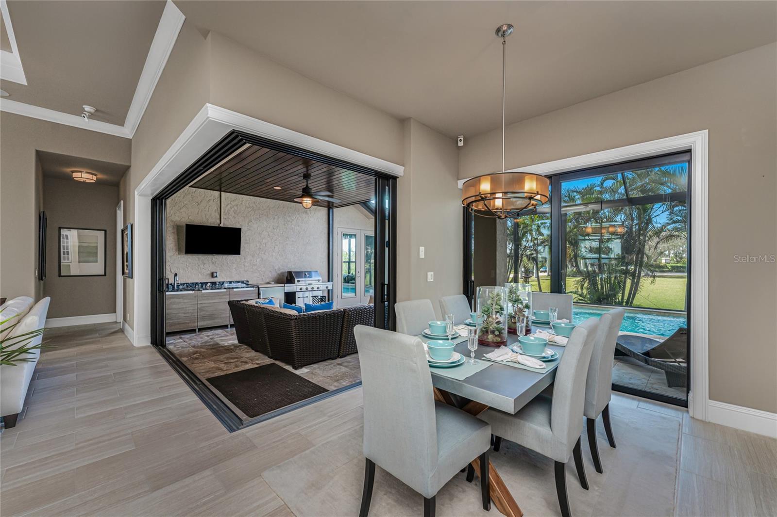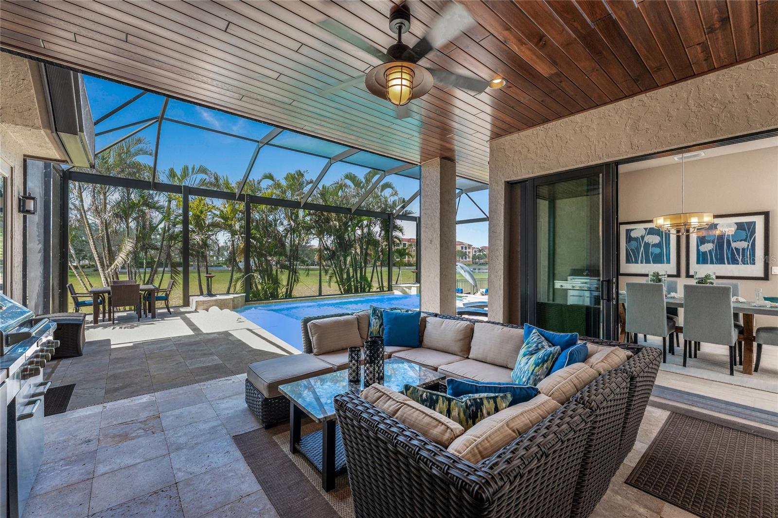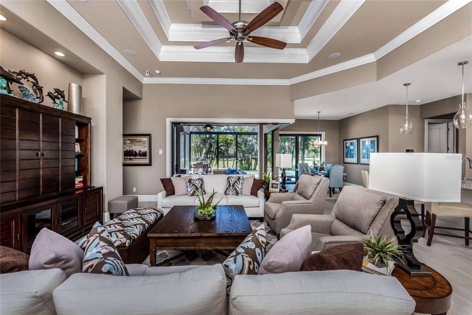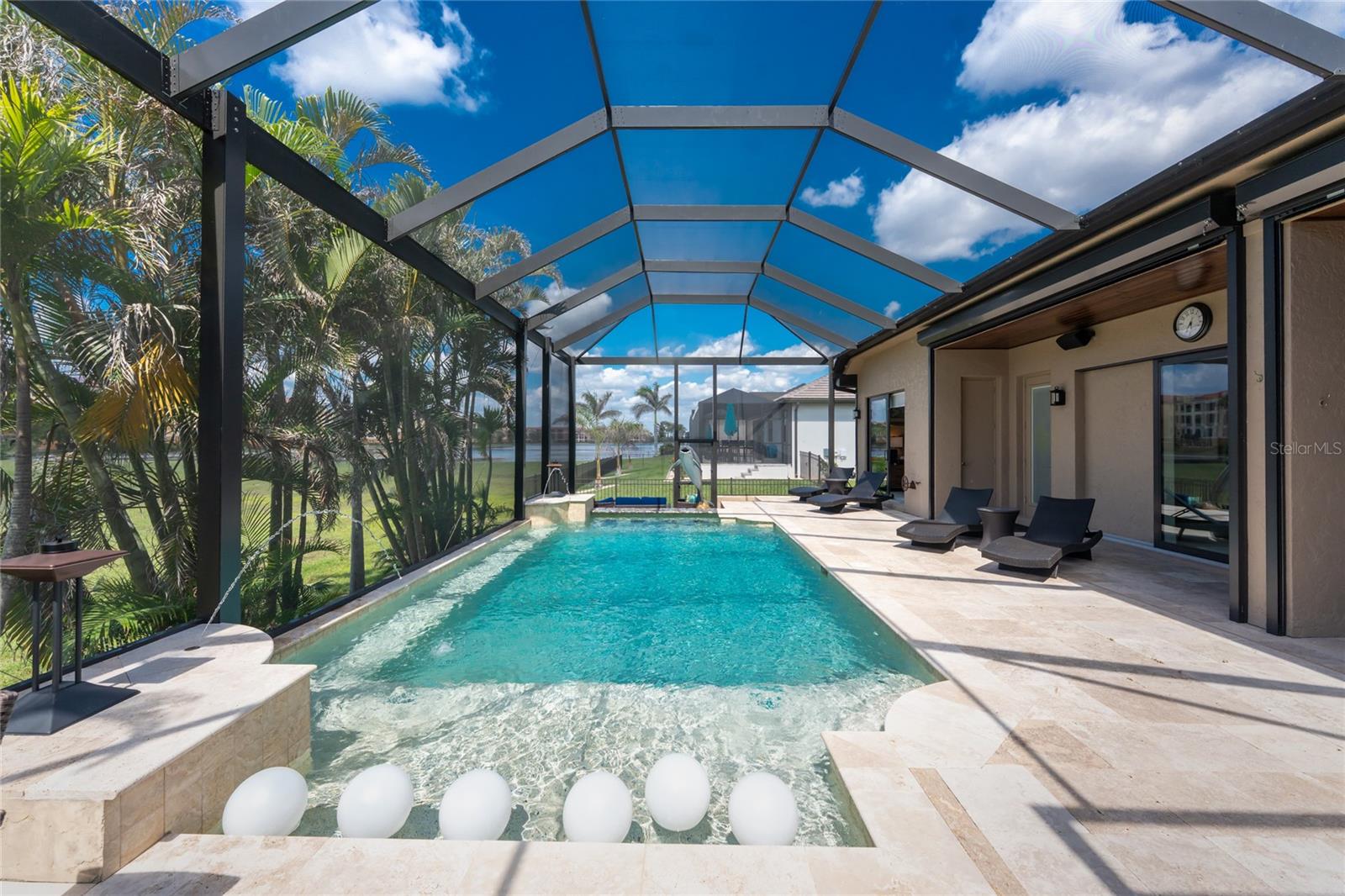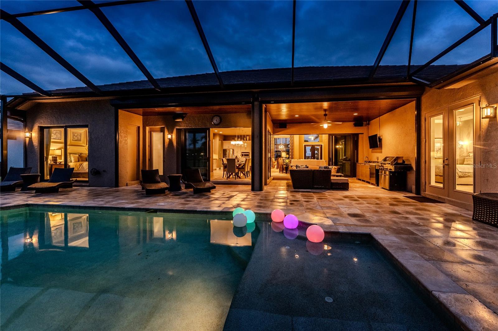 BACK ON THE MARKET DUE TO BUYER DEFAULT - NOW AN OPPORTUNITY FOR YOU! Welcome to your dream home! This former builder's model, crafted by award-winning PGI Homes in 2014, blends comfort, style, & luxury. Offered turnkey furnished including items in the garage, this 3-bedroom, 2-bath home with an office spans 2,680 sq. ft. features an oversized lanai and pool area. A circular paver driveway with lush landscaping leads to an elegant double-door entry. Inside, soaring ceilings with crown molding, an open-concept design and abundant natural light highlight the beautifully furnished space. The great room features a coffered ceiling, while the dining room showcases a unique architectural ceiling. The gourmet kitchen boasts a large 3" edge Silestone quartz countertop with the center island seating for four, a striking tile backsplash, KitchenAid stainless steel appliances, an induction cooktop with a sleek hood, and ample storage in classic white cabinetry. The luxurious primary suite includes a sitting area, French doors to the pool, a tray ceiling, and elegant lighting. Two walk-in closets lead to a spa-like bath with a crystal chandelier, soaking tub, Roman shower with dual heads, and dual vanities with Silestone quartz counters. The guest wing offers two spacious bedrooms and a pool-access bath with custom tile and a glass-walled shower. A standout 3-car garage features wood flooring, crown molding, recessed lighting, and newly installed independent climate control ideal for vehicles or a home gym. BRAND NEW York 5 ton, 16.2 seer AC installed August 2025. Smart home features include a Z-Wave system, security cameras, & a Nuvo sound system with built-in speakers. Additional peace of mind comes with all impact windows and doors, plus electric Kevlar protection across the back lanai and a 2023 stone-coated metal roof. Disappearing sliders open to a wood-ceilinged lanai, summer kitchen, and wall-mounted TV. The expansive travertine pool deck boasts a heated pool with fountains, a sun platform, a submerged granite bar, and multiple lounging area all overlooking a gorgeous lake view. Close to Ponce de Leon Park and minutes to Fishermen's Village - THIS IS YOUR DREAM HOME!