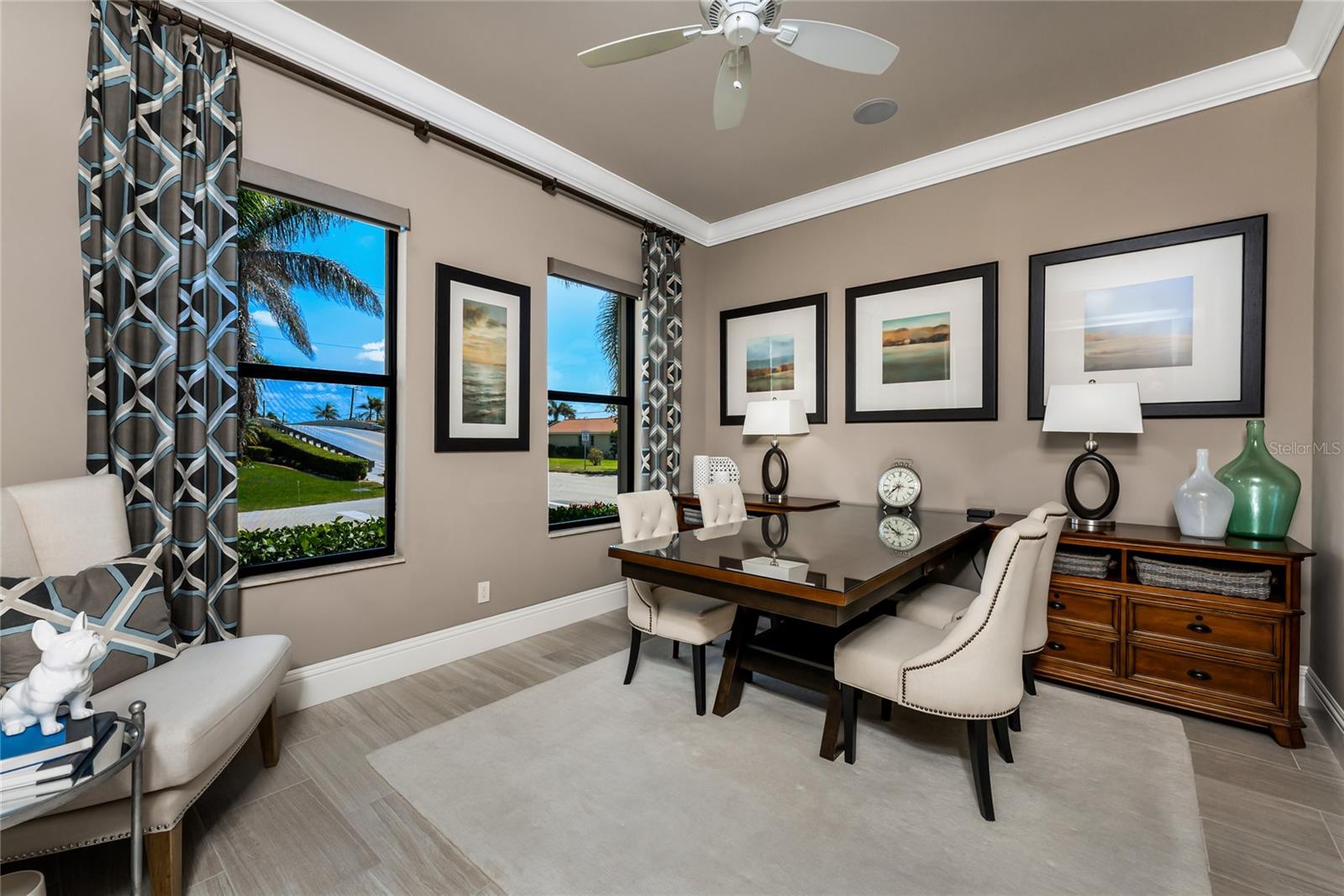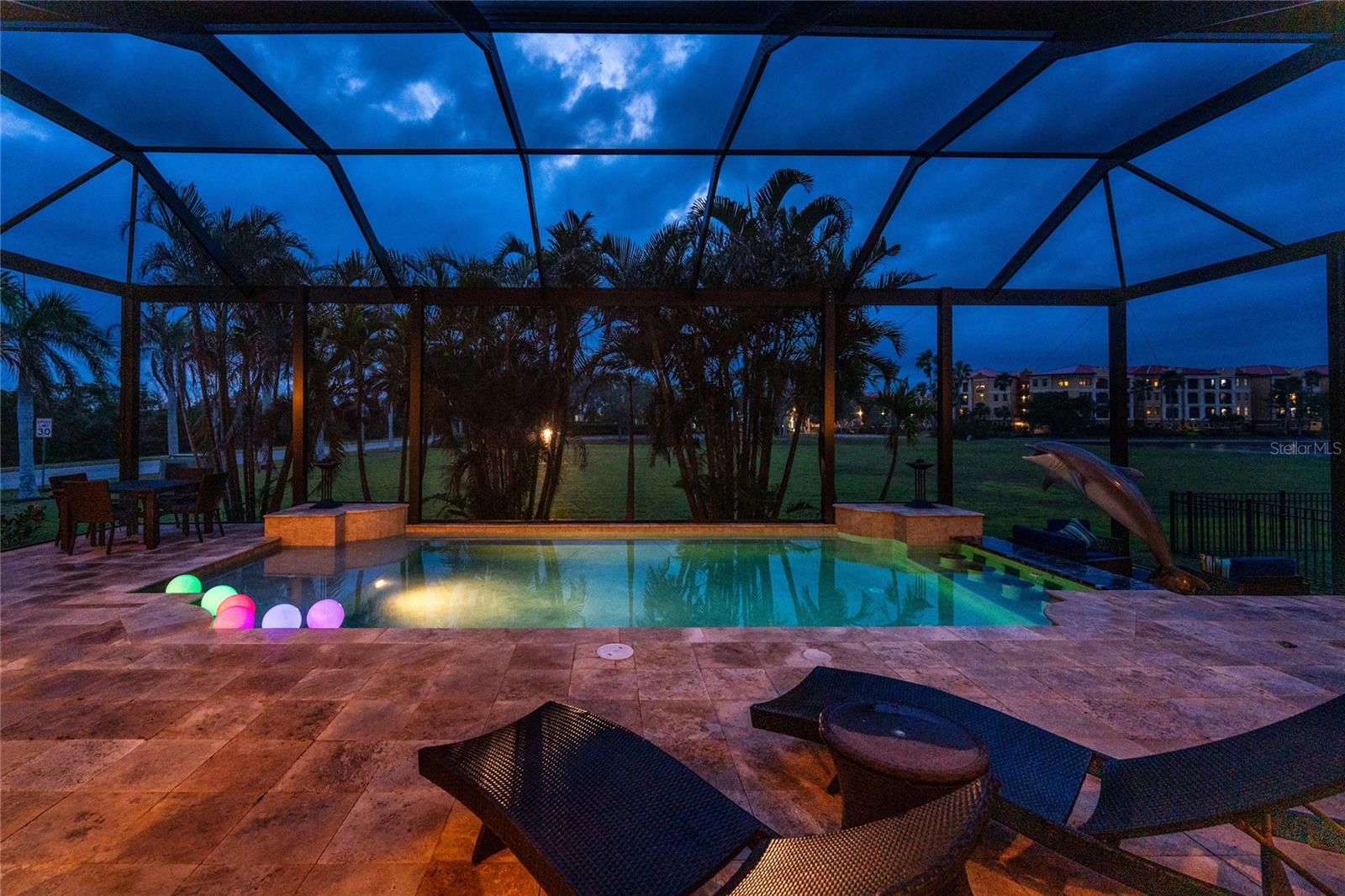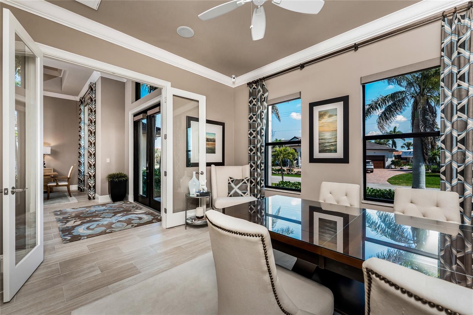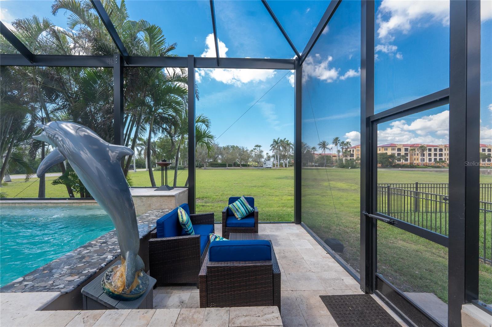 BACK ON THE MARKET DUE TO BUYER DEFAULT - NOW AN OPPORTUNITY FOR YOU! Welcome to your dream home! This former builder's model, crafted by award-winning PGI Homes in 2014, blends comfort, style, & luxury. Offered turnkey furnished including items in the garage, this 3-bedroom, 2-bath home with an office spans 2,680 sq. ft. features an oversized lanai and pool area. A circular paver driveway with lush landscaping leads to an elegant double-door entry. Inside, soaring ceilings with crown molding, an open-concept design and abundant natural light highlight the beautifully furnished space. The great room features a coffered ceiling, while the dining room showcases a unique architectural ceiling. The gourmet kitchen boasts a large 3" edge Silestone quartz countertop with the center island seating for four, a striking tile backsplash, KitchenAid stainless steel appliances, an induction cooktop with a sleek hood, and ample storage in classic white cabinetry. The luxurious primary suite includes a sitting area, French doors to the pool, a tray ceiling, and elegant lighting. Two walk-in closets lead to a spa-like bath with a crystal chandelier, soaking tub, Roman shower with dual heads, and dual vanities with Silestone quartz counters. The guest wing offers two spacious bedrooms and a pool-access bath with custom tile and a glass-walled shower. A standout 3-car garage features wood flooring, crown molding, recessed lighting, and newly installed independent climate control ideal for vehicles or a home gym. BRAND NEW York 5 ton, 16.2 seer AC installed August 2025. Smart home features include a Z-Wave system, security cameras, & a Nuvo sound system with built-in speakers. Additional peace of mind comes with all impact windows and doors, plus electric Kevlar protection across the back lanai and a 2023 stone-coated metal roof. Disappearing sliders open to a wood-ceilinged lanai, summer kitchen, and wall-mounted TV. The expansive travertine pool deck boasts a heated pool with fountains, a sun platform, a submerged granite bar, and multiple lounging area all overlooking a gorgeous lake view. Close to Ponce de Leon Park and minutes to Fishermen's Village - THIS IS YOUR DREAM HOME!
