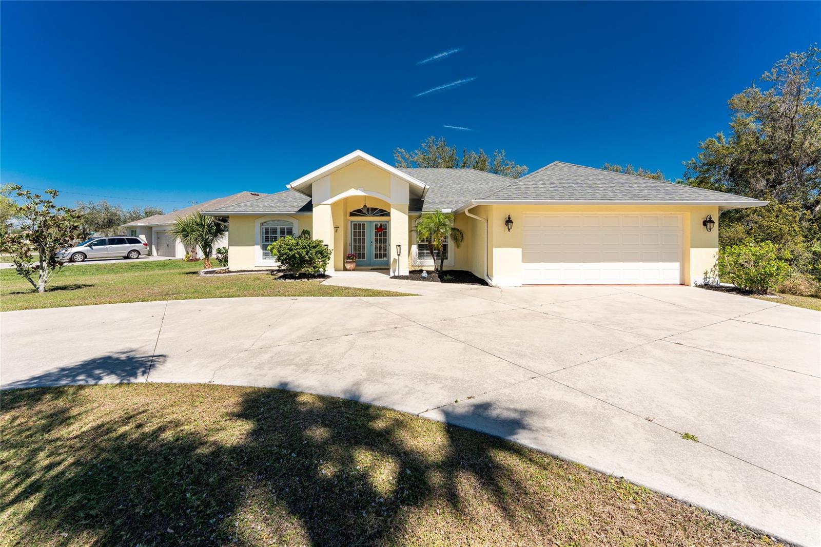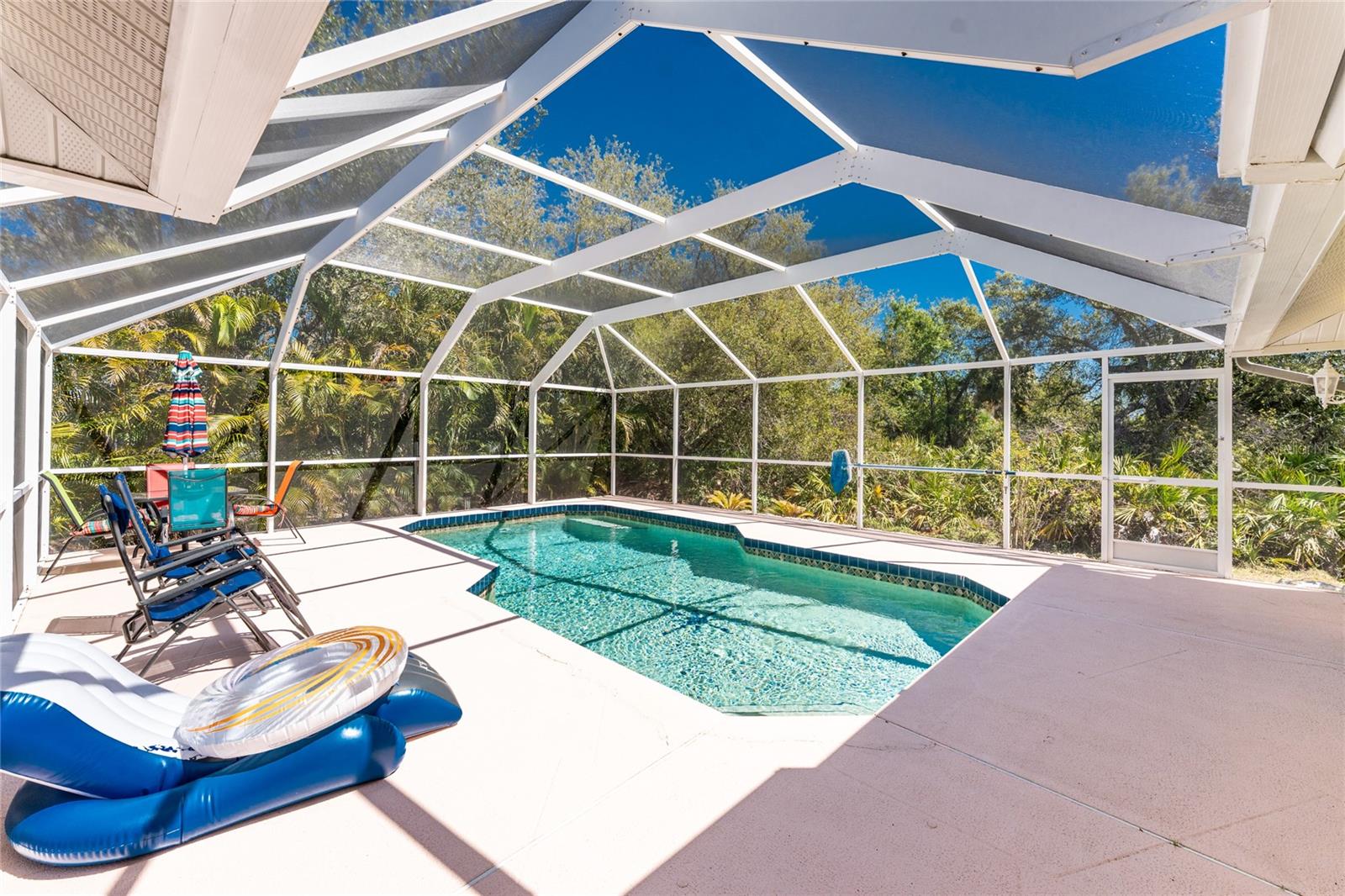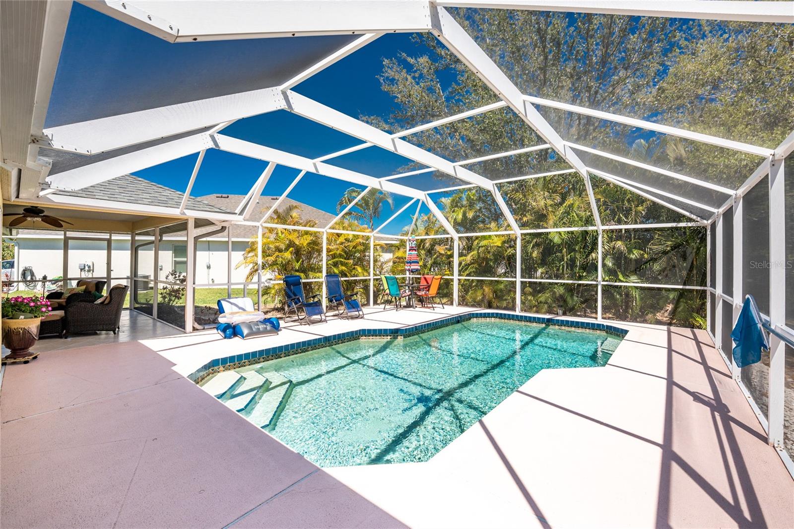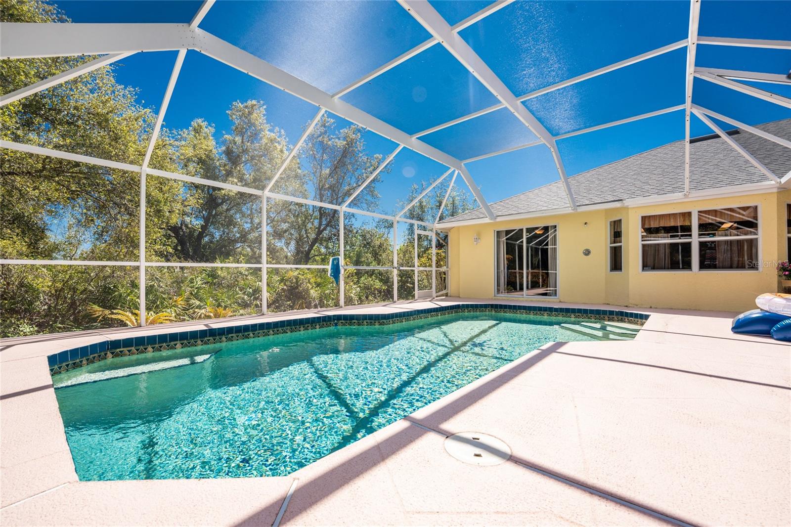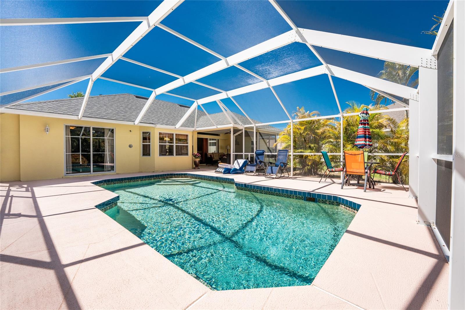 Impressive 3 Bedroom, 2 Bathroom home with attached 2 Car Garage located in the desirable deed restricted community of DEEP CREEK. This light and bright home offers a Foyer with coat closet, Great Room, Den/Office with wood floor off the Great Room, well equipped Kitchen, Inside Laundry Room and screened Lanai. The spacious Great Room features a cathedral ceiling, diagonal lay tile floor, plant shelves and sliding glass doors to the Lanai. The Kitchen offers a breakfast bar, built in desk, dining area overlooking the pool and pantry closet. Appliances include refrigerator, dishwasher, built in microwave, oven/range. Good cabinet and counter space. The Inside Laundry has a washer and dryer, laundry tub, wall cabinet and two closets. The Master Bedroom suite features tile flooring, walk in closet, plant shelves, Lanai access via sliding glass doors and private bathroom. The Bathroom offers a large walk in shower, dual sinks and Corian counters. There are two generous sized guest bedrooms, both with carpet and double closets. The guest bathroom has Corian counters and a tub/shower combination. Your living space extends via sliding glass doors to the screened Lanai with large covered area, 12x24 inground pool and plenty of deck for sunbathing. Other features include: circular driveway, hurricane shutters, double glass door entry with transom window. Utilities are county water and sewer. This home is minutes from Golf, shopping, dining, entertainment, I-75- and is a short drive to medical care and waterfront parks. This home is perfect for a family, winter retreat or investment property, It is a beautiful home in a great community!