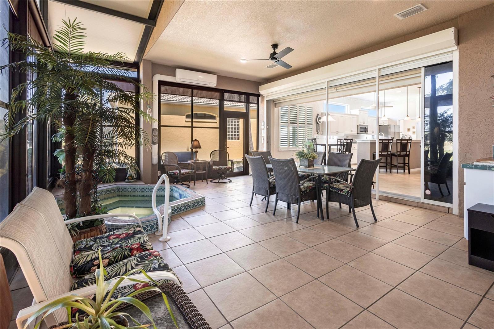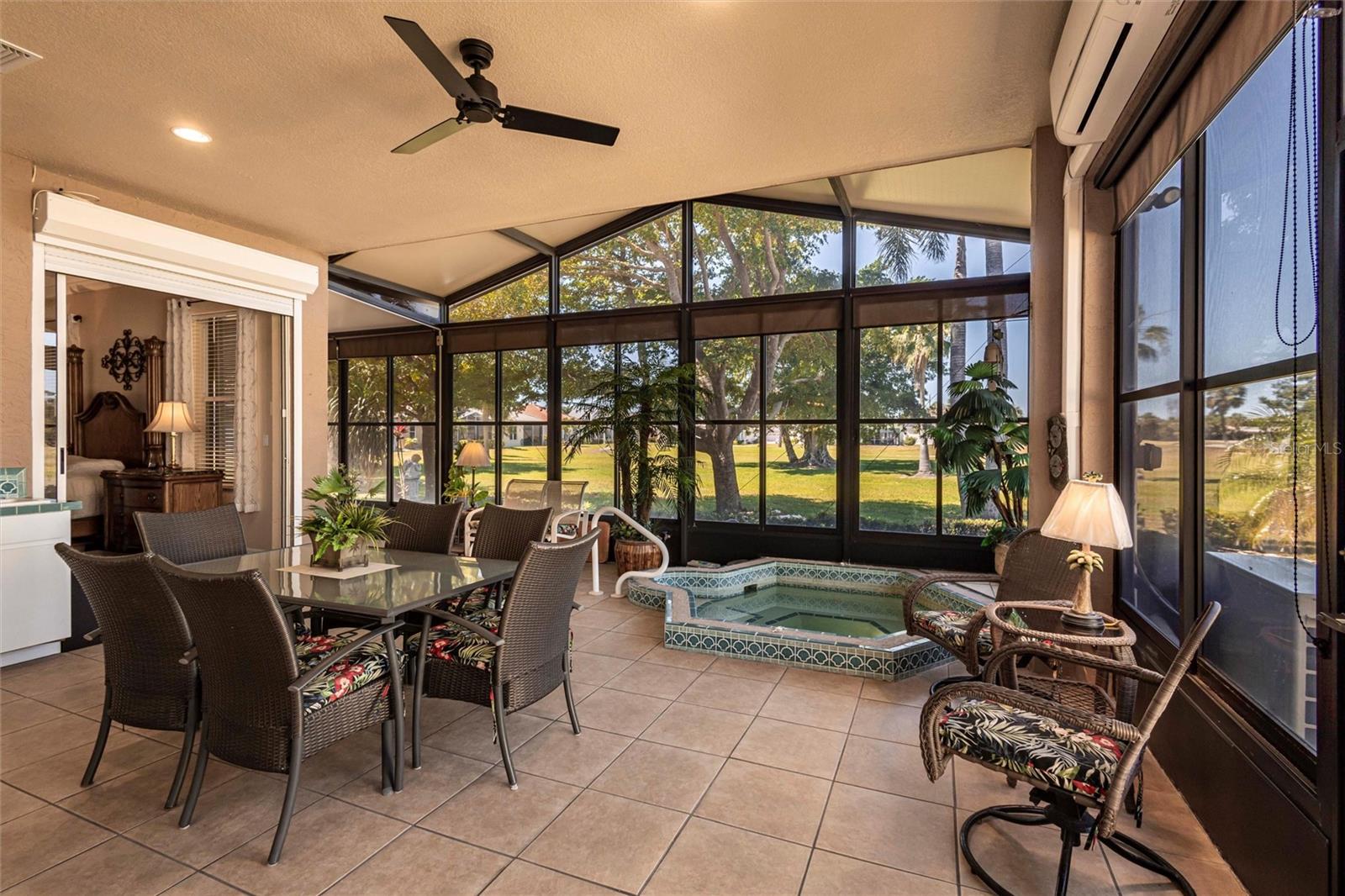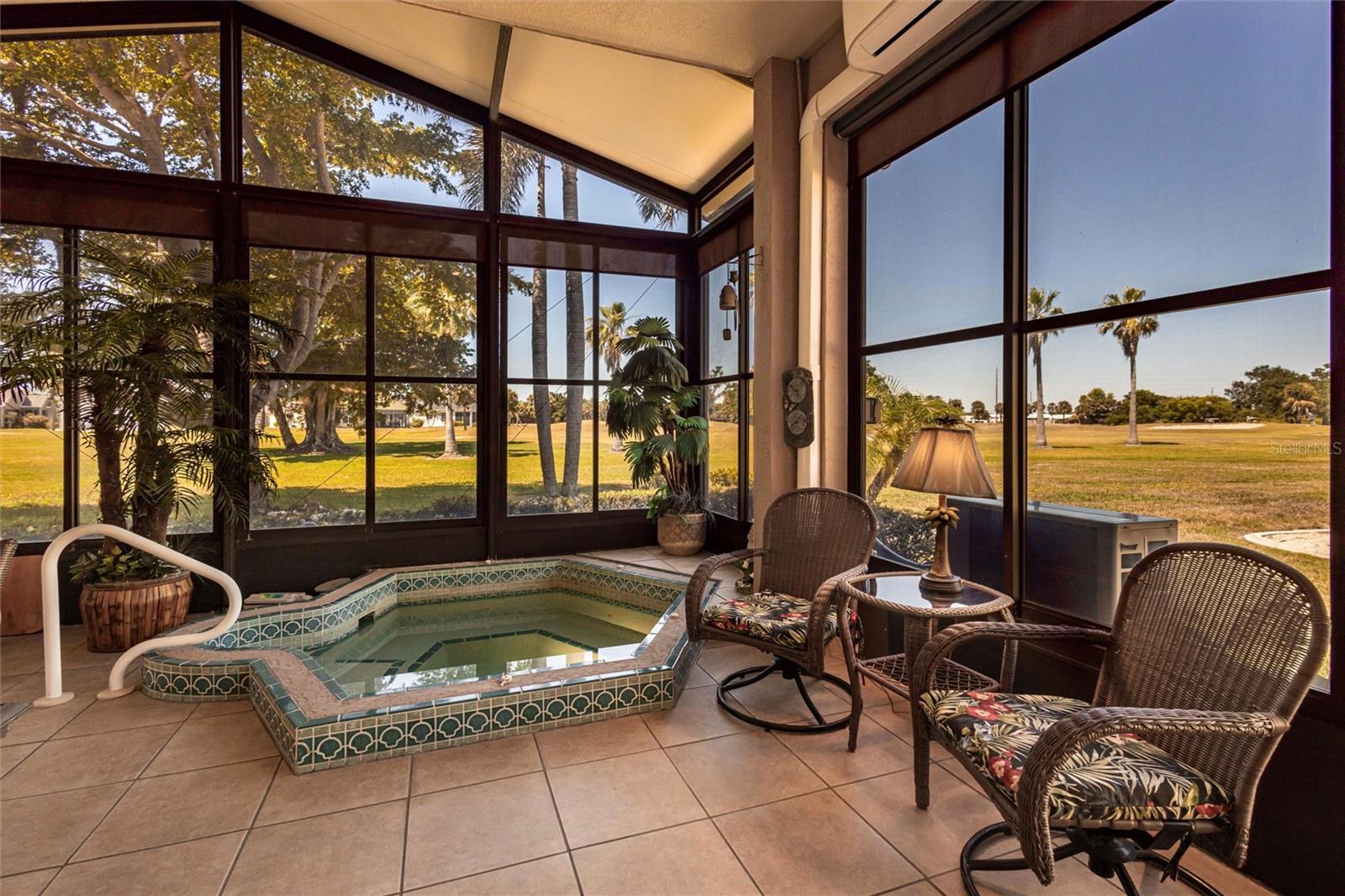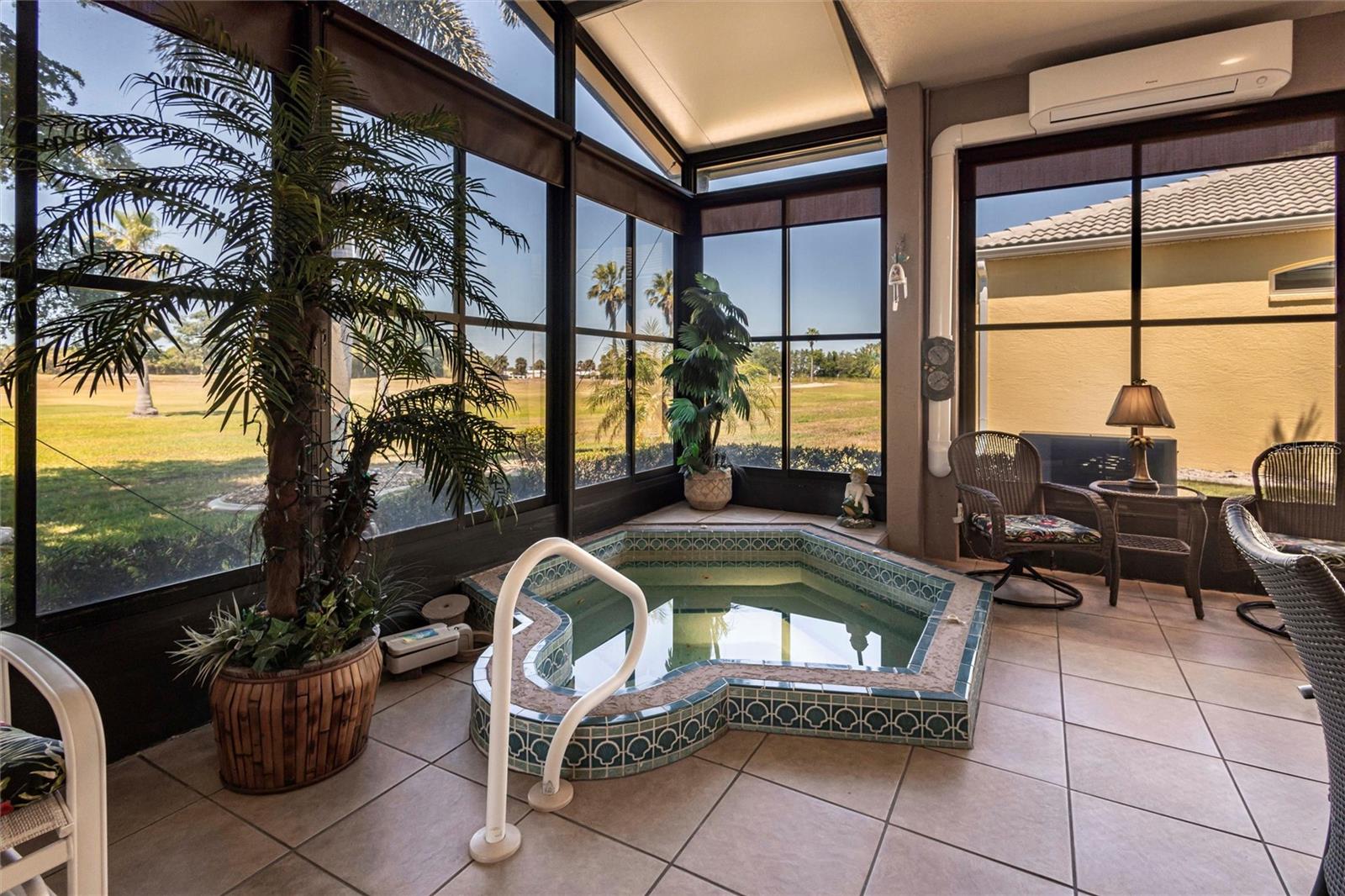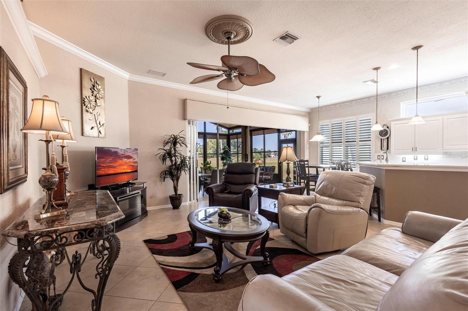 SEMINOLE LAKES:Gorgeous Furnished Golf Course Home with Spa & All Seasons RoomThis meticulously maintained 3-bedroom, 2-bath home is perfectly positioned with expansive views of the 14th Fairway and offers the ultimate in Florida living. Featuring a new tile roof (2025), accordion hurricane shutters, Bahama shutters, and a stamped concrete driveway, this property is as durable as it is beautiful.Inside, you'll find an open floor plan with volume ceilings accented by elegant crown molding, wood and tile flooring throughout, and thoughtfully designed spaces. The kitchen boasts quartz countertops, stainless steel appliances, a butler's pantry, and plantation shutters. The spacious primary suite includes his and hers custom walk-in closets and a luxurious bath with separate vanities, a garden tub, and a walk-in shower.Enjoy the comfort of the All Seasons Room complete with a hot tub, wet bar, and mini-split A/C system--ideal for relaxing or entertaining year-round. Pocket sliders open to the enclosed lanai, blending indoor and outdoor living effortlessly. Additional features include a HALO whole house water system...no maintenance, interior laundry room with utility sink, built-in garage cabinets, and an epoxy-finished garage floor.This beautifully furnished home is located in a semi-private, guard-gated golf course community with amenities such as tennis, pickleball, a community pool, and scenic nature surroundings--all with low monthly fees. Conveniently close to shopping, dining, and easy access to US 41 and I-75.Move-in ready and waiting for you to enjoy the Florida lifestyle at its best!