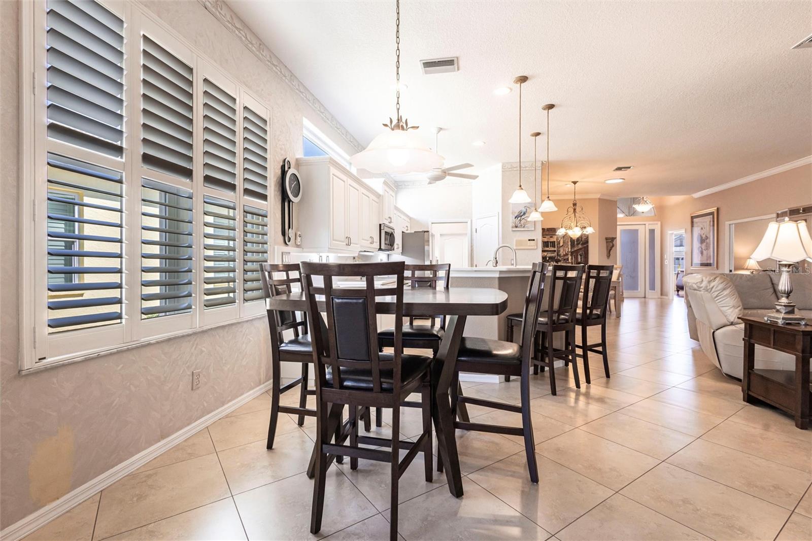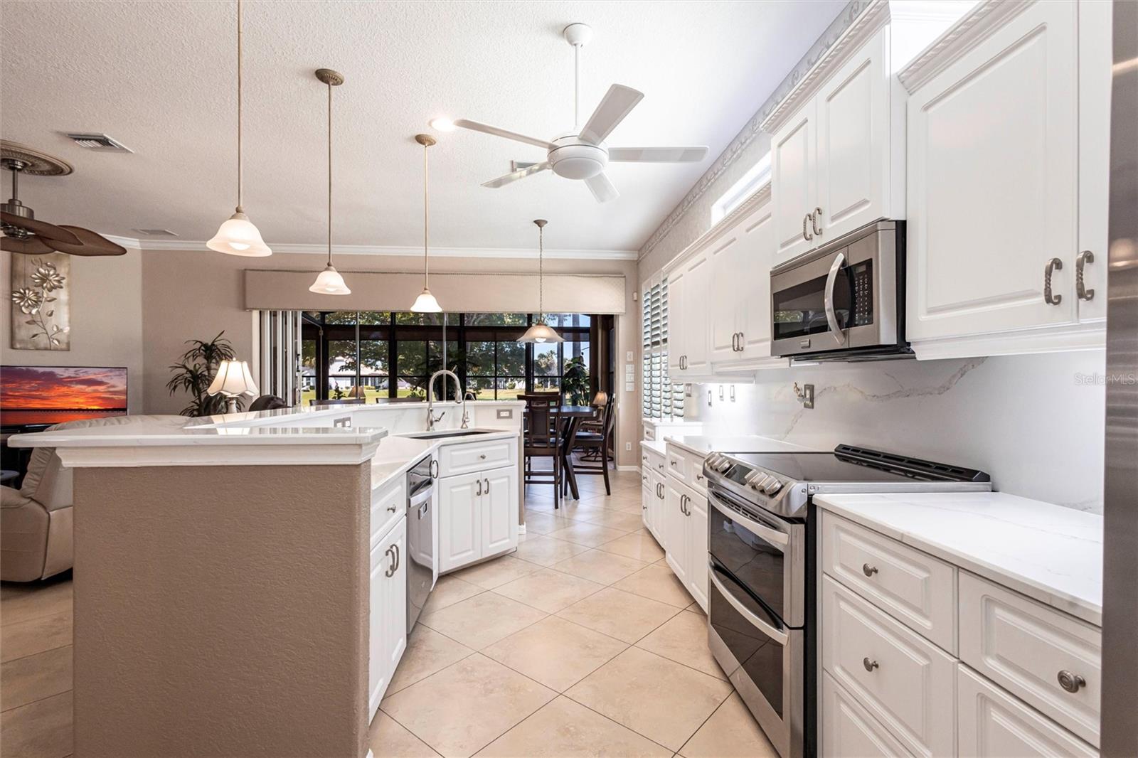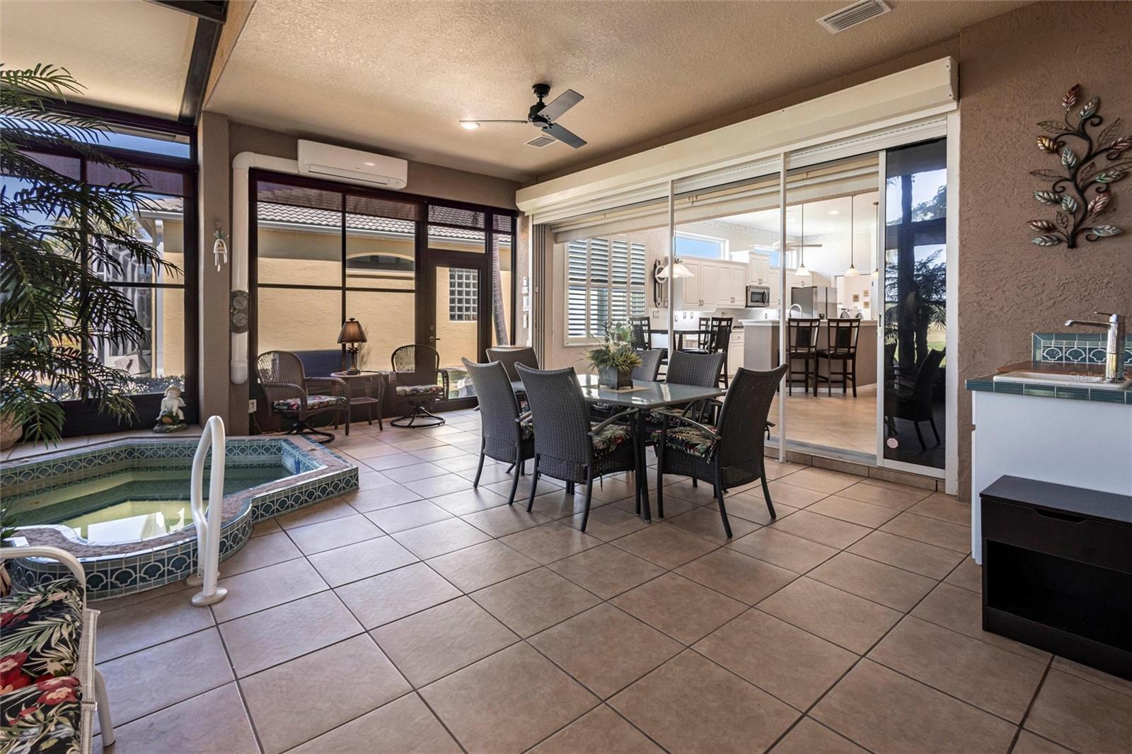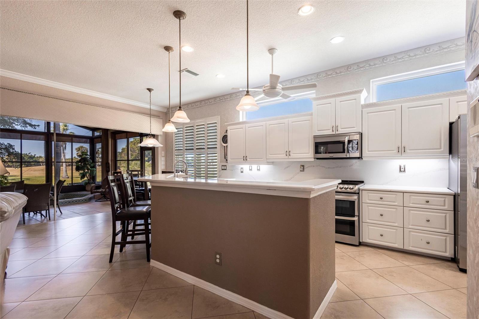 SEMINOLE LAKES:Gorgeous Furnished Golf Course Home with Spa & All Seasons RoomThis meticulously maintained 3-bedroom, 2-bath home is perfectly positioned with expansive views of the 14th Fairway and offers the ultimate in Florida living. Featuring a new tile roof (2025), accordion hurricane shutters, Bahama shutters, and a stamped concrete driveway, this property is as durable as it is beautiful.Inside, you'll find an open floor plan with volume ceilings accented by elegant crown molding, wood and tile flooring throughout, and thoughtfully designed spaces. The kitchen boasts quartz countertops, stainless steel appliances, a butler's pantry, and plantation shutters. The spacious primary suite includes his and hers custom walk-in closets and a luxurious bath with separate vanities, a garden tub, and a walk-in shower.Enjoy the comfort of the All Seasons Room complete with a hot tub, wet bar, and mini-split A/C system--ideal for relaxing or entertaining year-round. Pocket sliders open to the enclosed lanai, blending indoor and outdoor living effortlessly. Additional features include a HALO whole house water system...no maintenance, interior laundry room with utility sink, built-in garage cabinets, and an epoxy-finished garage floor.This beautifully furnished home is located in a semi-private, guard-gated golf course community with amenities such as tennis, pickleball, a community pool, and scenic nature surroundings--all with low monthly fees. Conveniently close to shopping, dining, and easy access to US 41 and I-75.Move-in ready and waiting for you to enjoy the Florida lifestyle at its best!