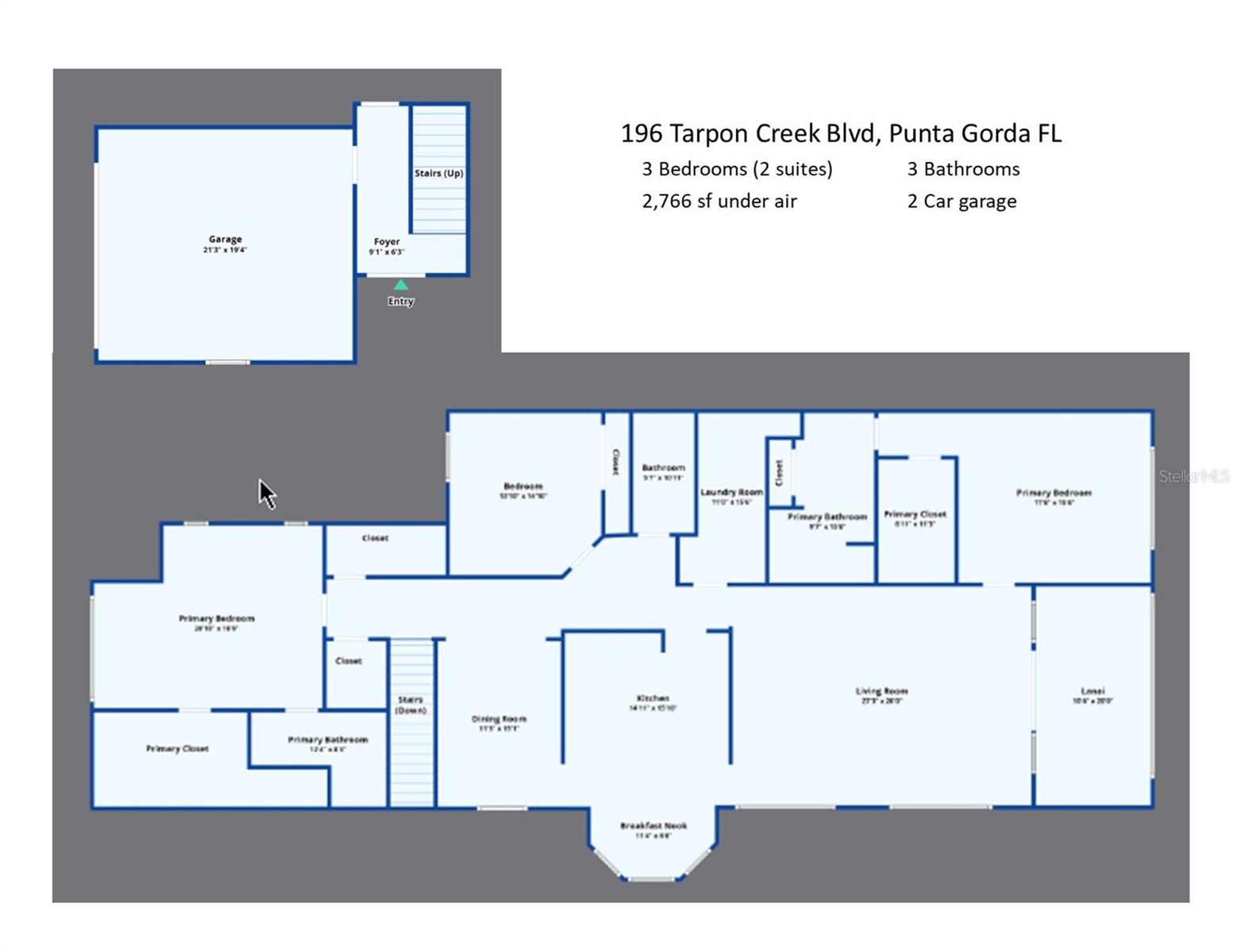 Welcome to the most spacious maintenance free home in all of Punta Gorda. This nearly 2,800 square foot luxurious condominium boasts 2 primary en suite bedrooms, a third bedroom or office, formal dining room, gourmet kitchen and a large great room with a wall of sliders opening to a roomy screened balcony with outdoor kitchen and a tranquil pond view. The home also features stainless appliances, two HVAC units and impact windows. The second-floor location safeguards against flooding in the event of a storm. Your private entrance opens to stairs as well as your own private elevator. There's plenty of room for cars or toys in the attached 2 car garage. And at a time when many condos are experiencing increased fees, Tarpon Cove's have gone down. You can also take comfort in Tarpon Cove's solid construction. While many area condos were damaged in last year's storms, Tarpon Cove stood strong. This unit experienced no damage at all. Let the pictures and video do the talking now. Be sure to explore with the 3-D Virtual Open House. This home is larger than nearly all of Punta Gorda's single family homes so if you want luxury and space in a maintenance free package, this is your place. Personal visits are easy to arrange.