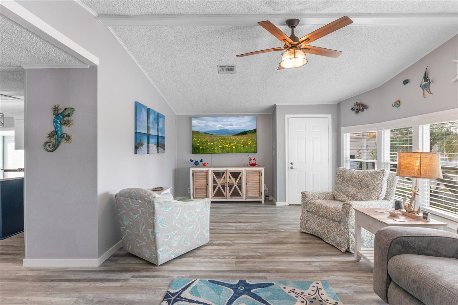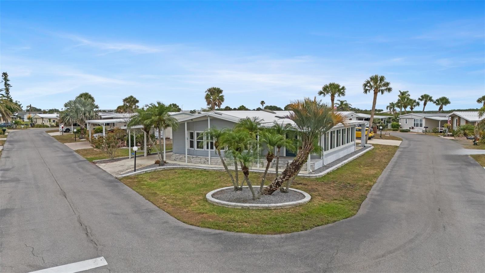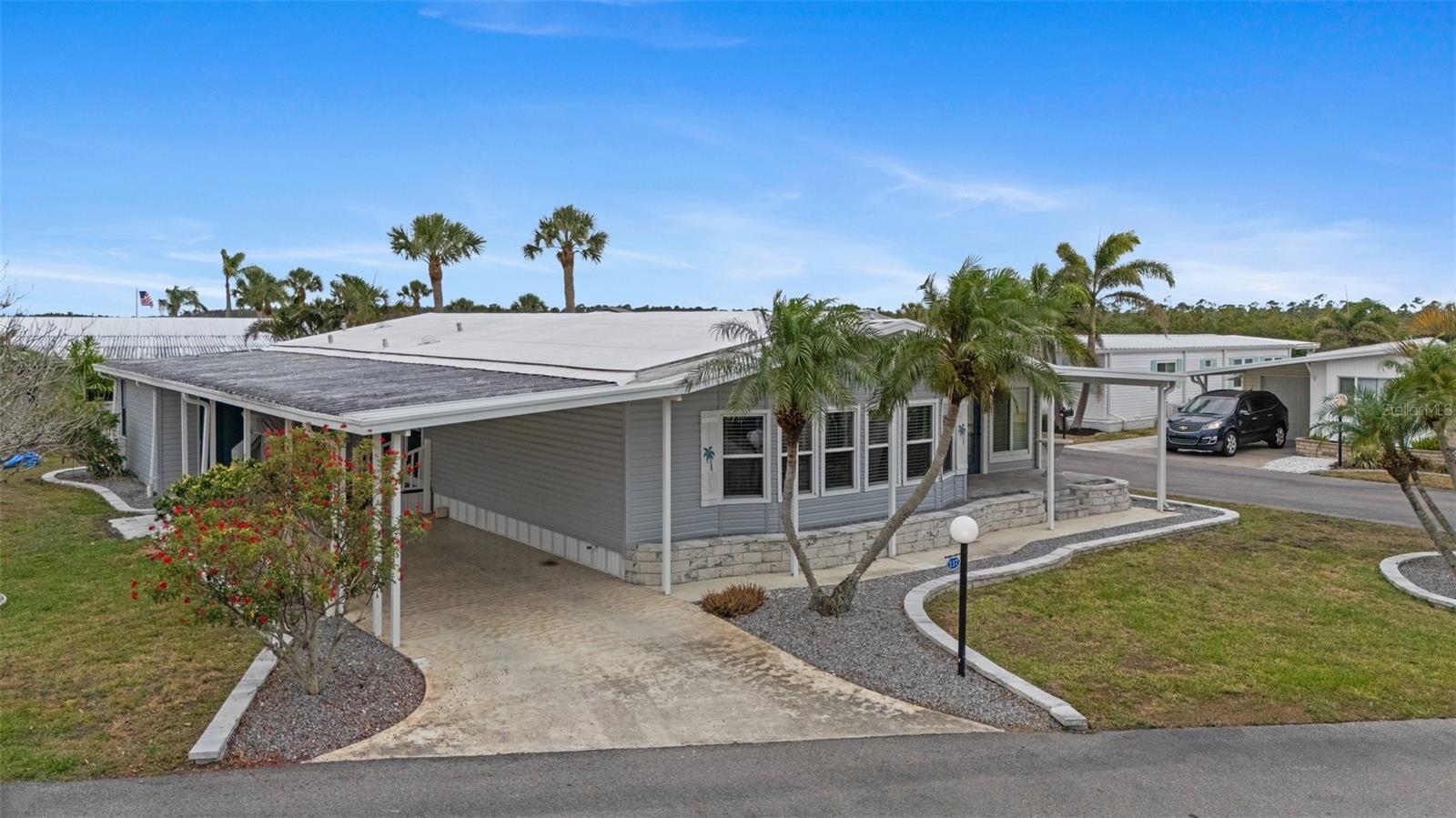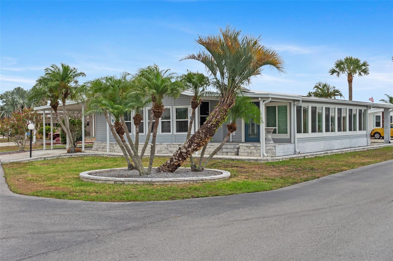Welcome to Lazy River Village! One of the premiere 55+ waterfront manufactured park in all of Sarasota and Charlotte counties! Lazy River is located on the banks of the beautiful Myakka River. This 2 bed/2 bath home is a REAL STANDOUT. The open kitchen features GORGEOUS QUARTZ counters and solid wood cabinets to provide plenty of cooking and storage space, as well as an upgraded tile backsplash. The star of the show is a STUNNING blue island with built-in eating area. Custom details abound with a hand-painted SKYLIGHT above the island and a hand-painted panel over the refrigerator. In the dining area, wood-panel walls are unique and inviting, and the built-in bar is perfect for coffee or drinks. Head through the double doors to access the large, bright sunroom, which is perfect for relaxing on your own OR hosting company. The sun room has been upgraded with HURRICANE-RESISTANT WINDOWS & DOORS, rated to be compliant with building codes in Miami-Dade! The beachy color theme used throughout the home immerses you in that quintessential "Florida" feeling, with chic, easy-to-maintain laminate flooring and charming overhead lights. The primary bedroom has direct access to the primary bathroom, along with a walk-in closet. You'll feel like you're in your very own PERSONAL SPA with this OUTSTANDING, CUSTOM-TILED walk-in shower! This bathroom offers the epitome of spa-like living with dual sinks, a built-in shower bench, and not one, not two, but THREE shower heads-two overhead, and a detachable one near the bench! Niches provide room for your toiletries. NEW subfloor, NEW floor, NEW vapor barrier. The unique characteristics and ideal location of this home make it the perfect seasonal place to enjoy Florida's coveted gorgeous winters and a perfect year-round home for those who love all 4 seasons of Florida. If you enjoy an abundance of activities, you will have plenty to choose from in Lazy River Village: Pickleball, tennis, bike clubs, card clubs, and pontoon boating. They even have a professional woodworking shop. A low monthly fee of $276 includes all the amenities. One of the things that makes Lazy River Village so great is its proximity to...well...everything! Be prepared to enjoy Florida's wildlife at its finest, both inside the Lazy River Village complex and at abundant state parks and nature preserves. Shopping and dining surround you in all directions. The spring training homes of both the Atlanta Braves & the Tampa Bay Rays are just a minutes away. The world-renowned Gulf of Mexico beaches are all within 30 minutes or less! 1) Englewood beach, 2) Casperson Beach (GREAT for shelling), 3) Venice Beach (shark tooth capital of the world), 4) Brohard Paw Park, 5) Nokomis beach, 6) the island gem of southwest Florida: Boca Grande... And finally: 7) Siesta Key in Sarasota has been ranked multiple times as the number one beach in the nation and is a mere 35 minutes away. Lazy River Village offers a lifestyle that every retiree dreams of. You have the quaint downtowns of Venice and Punta Gorda--both cities are often ranked as Top 10 destinations in the country for retirement. Another local favorite, Englewood, is a cozy, fun beach town on the Gulf of Mexico.The residents of Lazy River Village agree: Lazy River is a community that offers it all. Don't miss your chance to see this unique home!