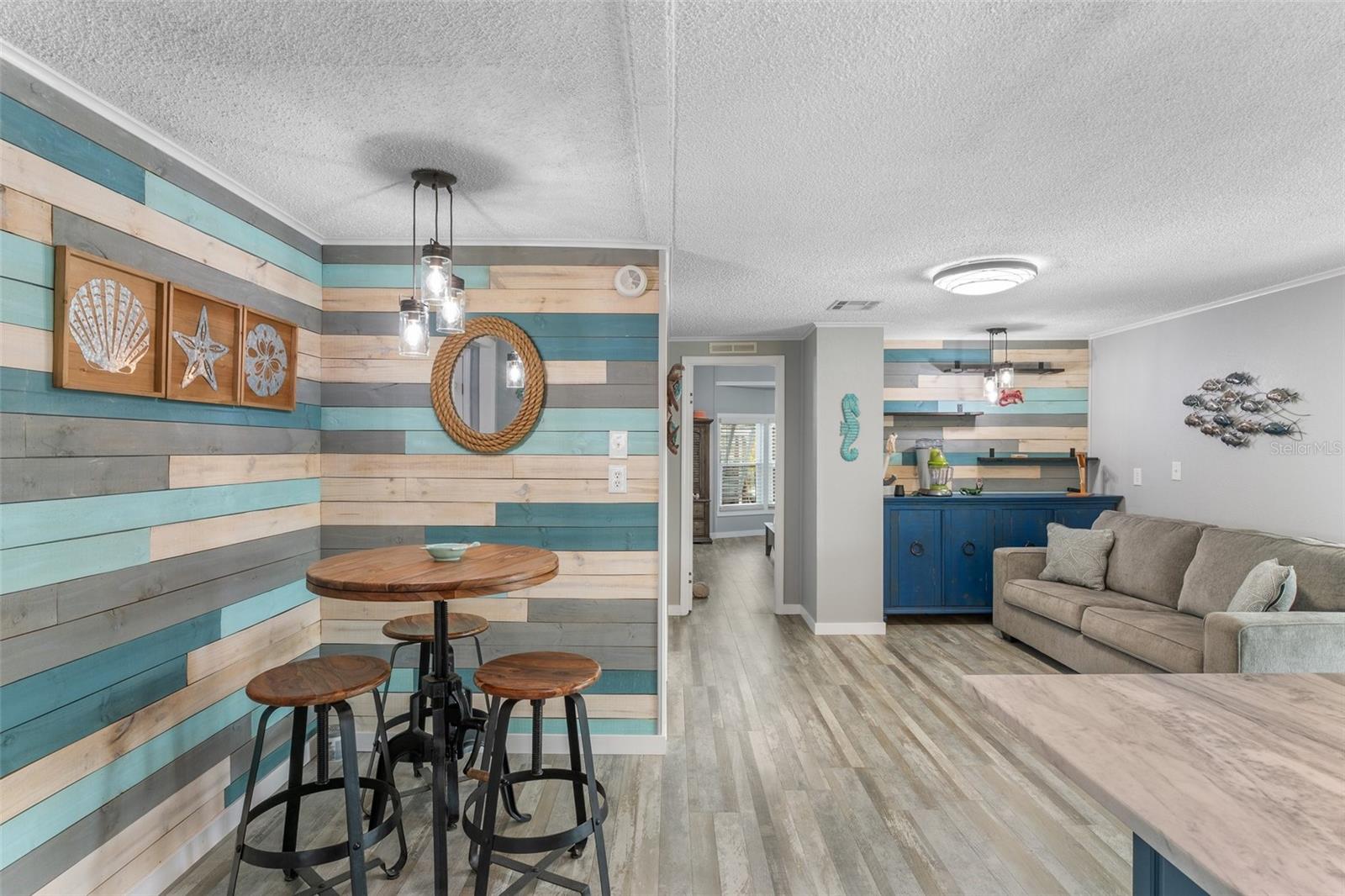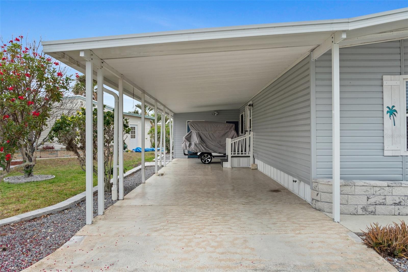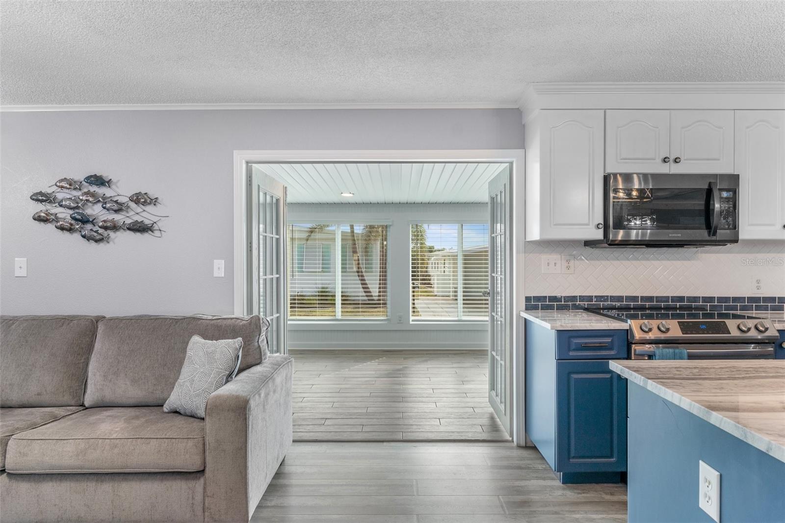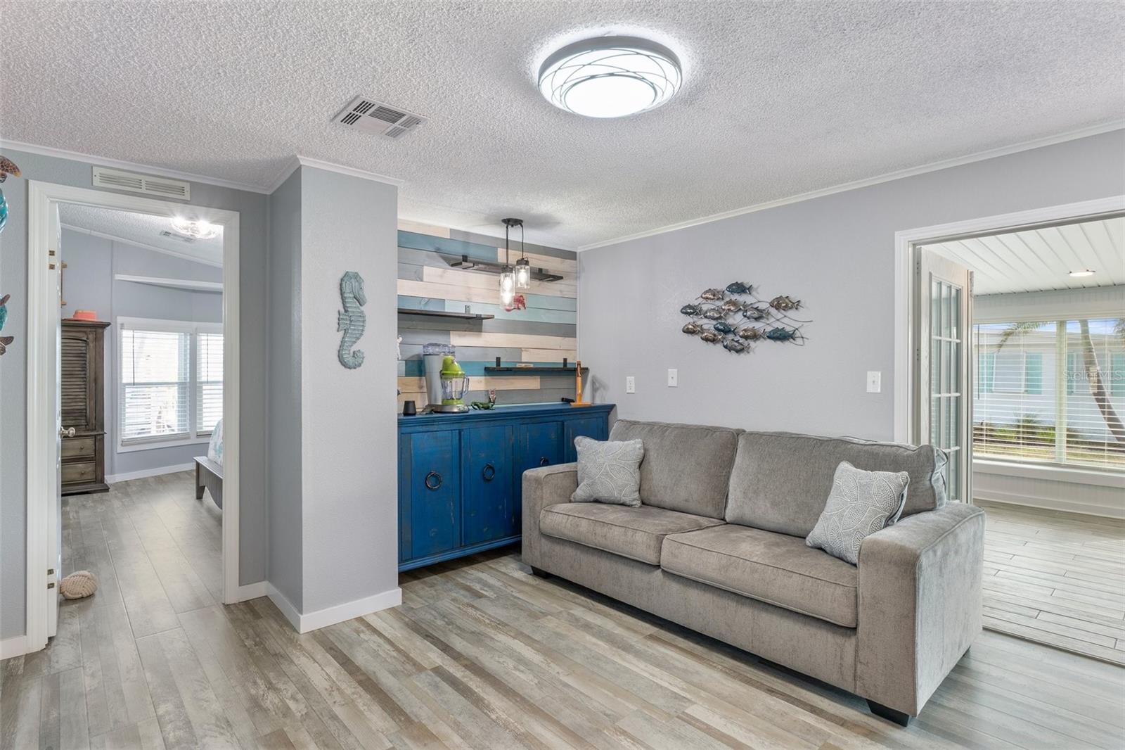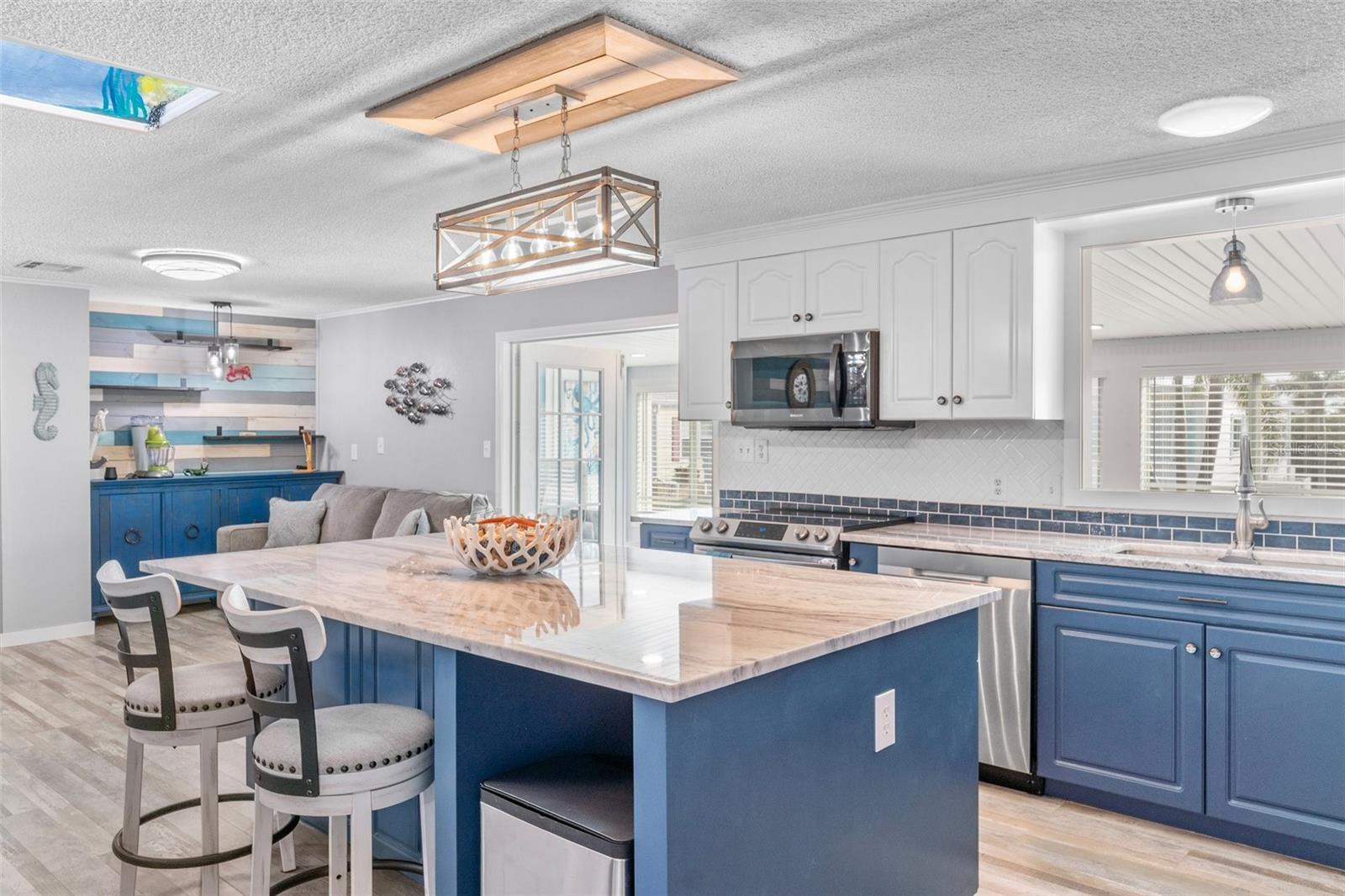 Welcome to Lazy River Village! One of the premiere 55+ waterfront manufactured park in all of Sarasota and Charlotte counties! Lazy River is located on the banks of the beautiful Myakka River. This 2 bed/2 bath home is a REAL STANDOUT. The open kitchen features GORGEOUS QUARTZ counters and solid wood cabinets to provide plenty of cooking and storage space, as well as an upgraded tile backsplash. The star of the show is a STUNNING blue island with built-in eating area. Custom details abound with a hand-painted SKYLIGHT above the island and a hand-painted panel over the refrigerator. In the dining area, wood-panel walls are unique and inviting, and the built-in bar is perfect for coffee or drinks. Head through the double doors to access the large, bright sunroom, which is perfect for relaxing on your own OR hosting company. The sun room has been upgraded with HURRICANE-RESISTANT WINDOWS & DOORS, rated to be compliant with building codes in Miami-Dade! The beachy color theme used throughout the home immerses you in that quintessential "Florida" feeling, with chic, easy-to-maintain laminate flooring and charming overhead lights. The primary bedroom has direct access to the primary bathroom, along with a walk-in closet. You'll feel like you're in your very own PERSONAL SPA with this OUTSTANDING, CUSTOM-TILED walk-in shower! This bathroom offers the epitome of spa-like living with dual sinks, a built-in shower bench, and not one, not two, but THREE shower heads-two overhead, and a detachable one near the bench! Niches provide room for your toiletries. NEW subfloor, NEW floor, NEW vapor barrier. The unique characteristics and ideal location of this home make it the perfect seasonal place to enjoy Florida's coveted gorgeous winters and a perfect year-round home for those who love all 4 seasons of Florida. If you enjoy an abundance of activities, you will have plenty to choose from in Lazy River Village: Pickleball, tennis, bike clubs, card clubs, and pontoon boating. They even have a professional woodworking shop. A low monthly fee of $276 includes all the amenities. One of the things that makes Lazy River Village so great is its proximity to...well...everything! Be prepared to enjoy Florida's wildlife at its finest, both inside the Lazy River Village complex and at abundant state parks and nature preserves. Shopping and dining surround you in all directions. The spring training homes of both the Atlanta Braves & the Tampa Bay Rays are just a minutes away. The world-renowned Gulf of Mexico beaches are all within 30 minutes or less! 1) Englewood beach, 2) Casperson Beach (GREAT for shelling), 3) Venice Beach (shark tooth capital of the world), 4) Brohard Paw Park, 5) Nokomis beach, 6) the island gem of southwest Florida: Boca Grande... And finally: 7) Siesta Key in Sarasota has been ranked multiple times as the number one beach in the nation and is a mere 35 minutes away. Lazy River Village offers a lifestyle that every retiree dreams of. You have the quaint downtowns of Venice and Punta Gorda--both cities are often ranked as Top 10 destinations in the country for retirement. Another local favorite, Englewood, is a cozy, fun beach town on the Gulf of Mexico.The residents of Lazy River Village agree: Lazy River is a community that offers it all. Don't miss your chance to see this unique home!