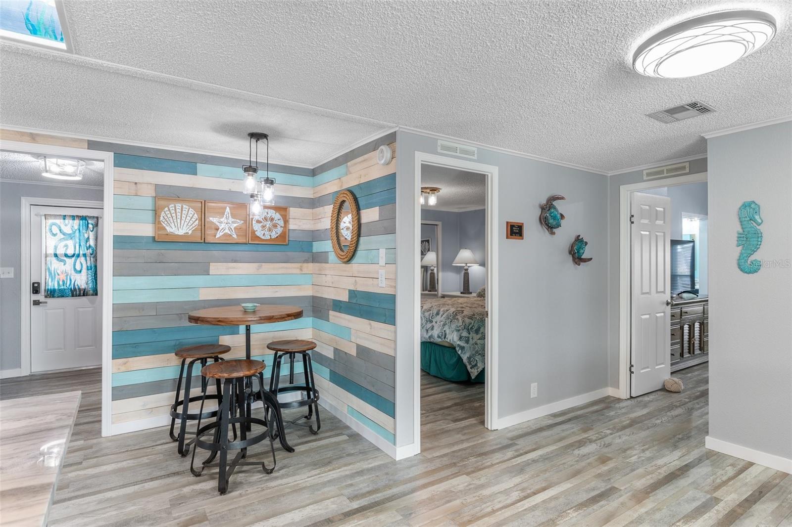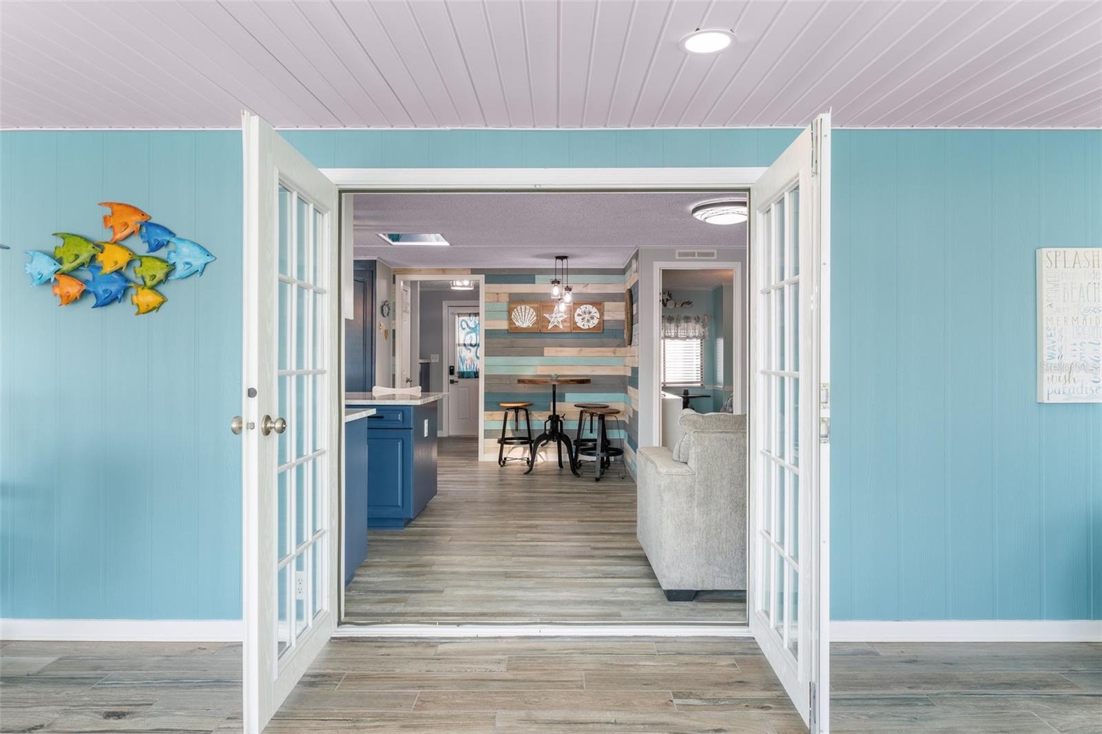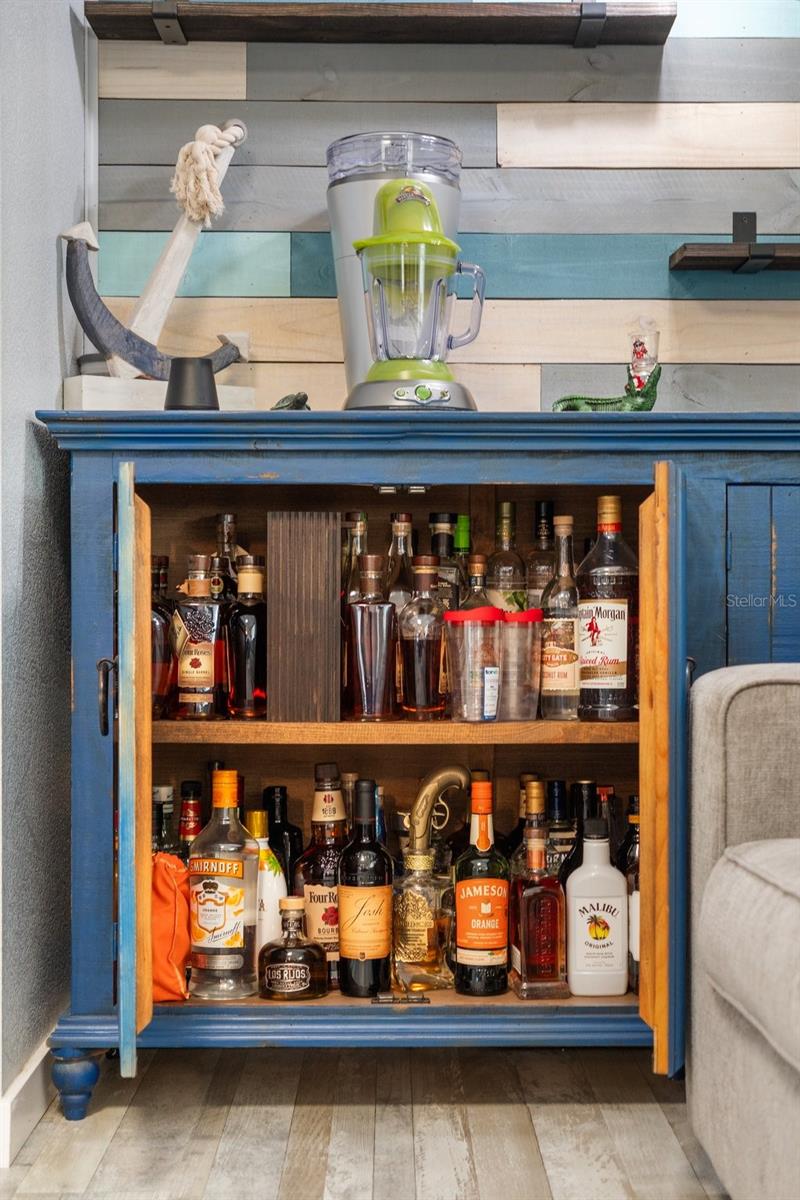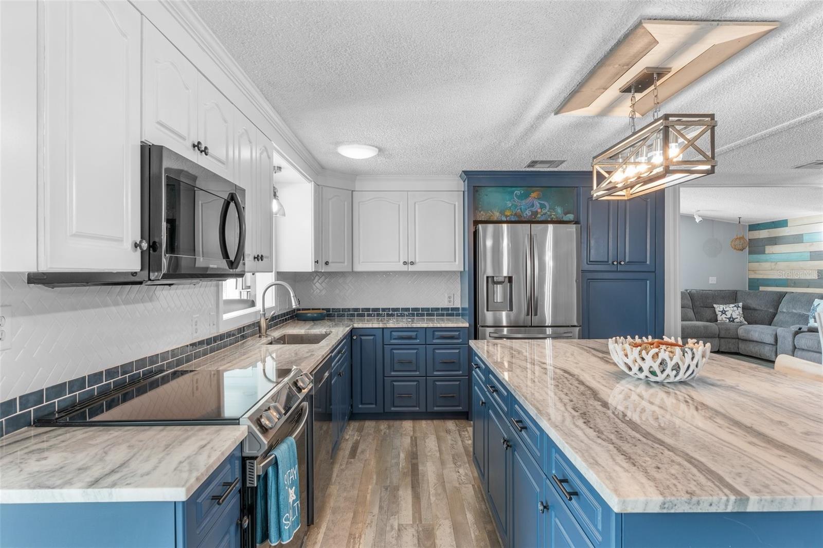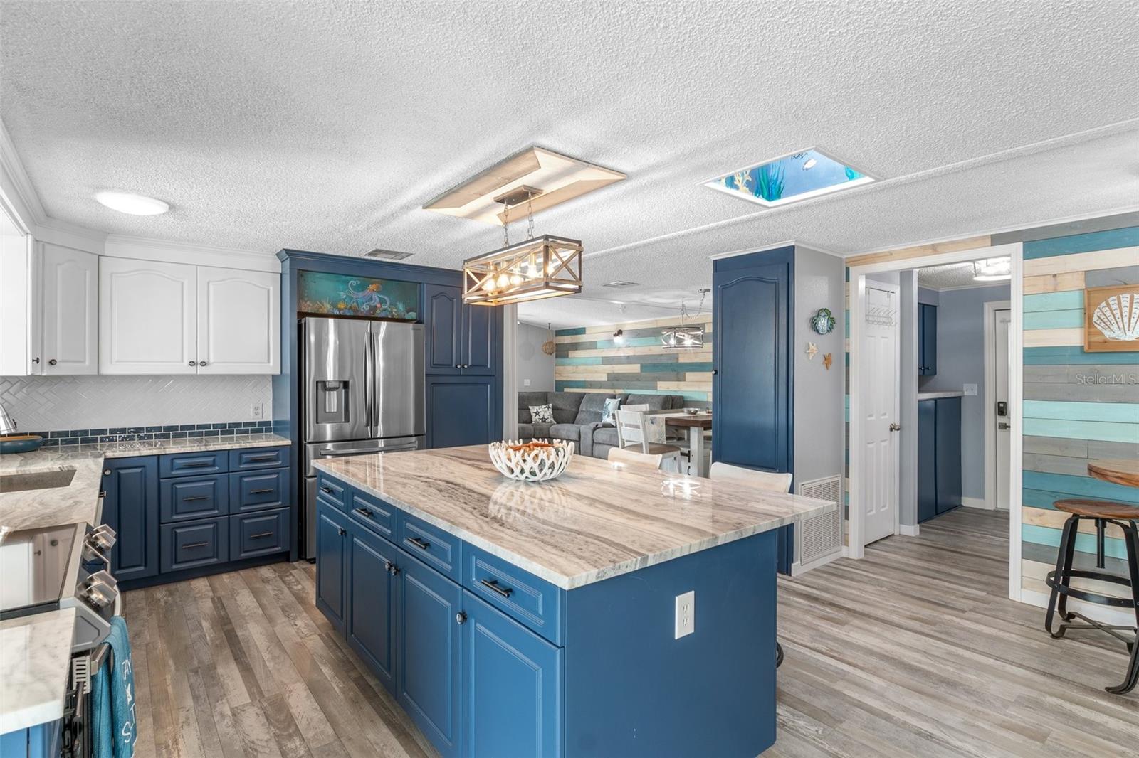 Welcome to Lazy River Village! One of the premiere 55+ waterfront manufactured park in all of Sarasota and Charlotte counties! Lazy River is located on the banks of the beautiful Myakka River. This 2 bed/2 bath home is a REAL STANDOUT. The open kitchen features GORGEOUS QUARTZ counters and solid wood cabinets to provide plenty of cooking and storage space, as well as an upgraded tile backsplash. The star of the show is a STUNNING blue island with built-in eating area. Custom details abound with a hand-painted SKYLIGHT above the island and a hand-painted panel over the refrigerator. In the dining area, wood-panel walls are unique and inviting, and the built-in bar is perfect for coffee or drinks. Head through the double doors to access the large, bright sunroom, which is perfect for relaxing on your own OR hosting company. The sun room has been upgraded with HURRICANE-RESISTANT WINDOWS & DOORS, rated to be compliant with building codes in Miami-Dade! The beachy color theme used throughout the home immerses you in that quintessential "Florida" feeling, with chic, easy-to-maintain laminate flooring and charming overhead lights. The primary bedroom has direct access to the primary bathroom, along with a walk-in closet. You'll feel like you're in your very own PERSONAL SPA with this OUTSTANDING, CUSTOM-TILED walk-in shower! This bathroom offers the epitome of spa-like living with dual sinks, a built-in shower bench, and not one, not two, but THREE shower heads-two overhead, and a detachable one near the bench! Niches provide room for your toiletries. NEW subfloor, NEW floor, NEW vapor barrier. The unique characteristics and ideal location of this home make it the perfect seasonal place to enjoy Florida's coveted gorgeous winters and a perfect year-round home for those who love all 4 seasons of Florida. If you enjoy an abundance of activities, you will have plenty to choose from in Lazy River Village: Pickleball, tennis, bike clubs, card clubs, and pontoon boating. They even have a professional woodworking shop. A low monthly fee of $276 includes all the amenities. One of the things that makes Lazy River Village so great is its proximity to...well...everything! Be prepared to enjoy Florida's wildlife at its finest, both inside the Lazy River Village complex and at abundant state parks and nature preserves. Shopping and dining surround you in all directions. The spring training homes of both the Atlanta Braves & the Tampa Bay Rays are just a minutes away. The world-renowned Gulf of Mexico beaches are all within 30 minutes or less! 1) Englewood beach, 2) Casperson Beach (GREAT for shelling), 3) Venice Beach (shark tooth capital of the world), 4) Brohard Paw Park, 5) Nokomis beach, 6) the island gem of southwest Florida: Boca Grande... And finally: 7) Siesta Key in Sarasota has been ranked multiple times as the number one beach in the nation and is a mere 35 minutes away. Lazy River Village offers a lifestyle that every retiree dreams of. You have the quaint downtowns of Venice and Punta Gorda--both cities are often ranked as Top 10 destinations in the country for retirement. Another local favorite, Englewood, is a cozy, fun beach town on the Gulf of Mexico.The residents of Lazy River Village agree: Lazy River is a community that offers it all. Don't miss your chance to see this unique home!