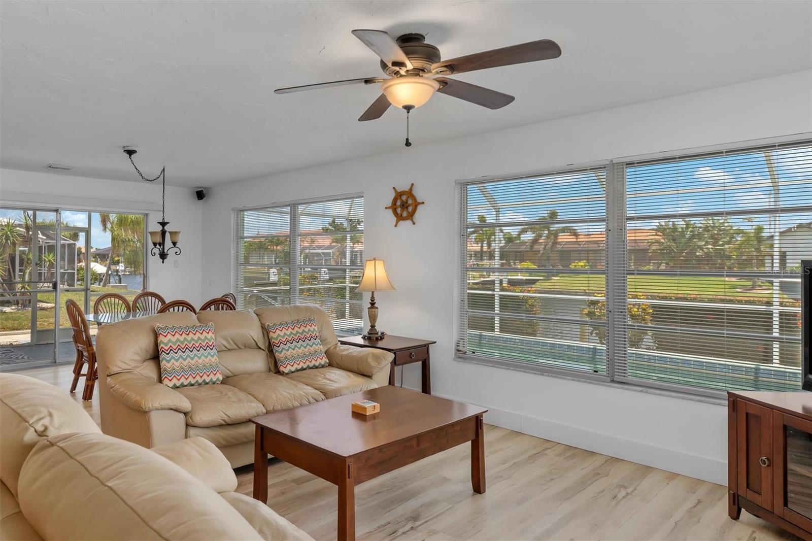 BOATER'S DREAM WITH QUICK OUT TO CHARLOTTE HARBOR AND BEYOND. This 3/2/2 waterfront pool home located on the Remora Lagoon Canal in Punta Gorda Isles provides a quick and scenic 10-minute out to the open waters of Charlotte Harbor, the Peace River and Myakka Rivers, and the Gulf of Mexico. Upon entering the etched glass door, an open floor plan with over 2,000 sq. ft. and a spacious living room welcomes you. Extending beyond the living room is the dining area, a huge family room, and fully equipped kitchen with stainless-steel appliances. Move right into this fully furnished, turn-key home (including a well-stocked garage). The split floor plan includes the primary suite with ensuite bath, and an oversized 16x16-ft guest bedroom on the family room side of the home and the third bedroom on the other side of the kitchen. Enjoy your private pool while overlooking 78-ft of waterfront with concrete seawall maintained by the City of Punta Gorda. The screened lanai provides a covered sitting area as well as plenty of room to catch the rays! This property has an oversized garage, measuring 527 sq. ft. This friendly neighborhood features a variety of established and new construction homes, and the location is ideal for accessing everything Punta Gorda has to offer. Enjoy walking or biking to Fisherman's Village and the historic downtown area complete with waterfront dining, boutique shops, entertainment and so much do to. The Isles Yacht Club and St. Andrews Golf Club are less than five minutes away and Ponce Park and Gilchrist Parks are nearby as well. Enjoy over 18 miles of biking and walking paths, world-class boating, fishing, golfing, and watersports all at your fingertips with the average winter temperatures in the mid-70s. Enjoy easy access to I-75, US-41 and the Punta Gorda Airport (PGD), just 15 minutes away, serving over 60 destinations, adding to this property's appeal. ** CHECK OUT VIRTUAL TOUR 1 FOR PROPERTY WALK-THROUGH AND VIRTUAL TOUR 2 FOR 3-D FLOOR PLAM.** This home is priced to sell, so call today for your private showing!