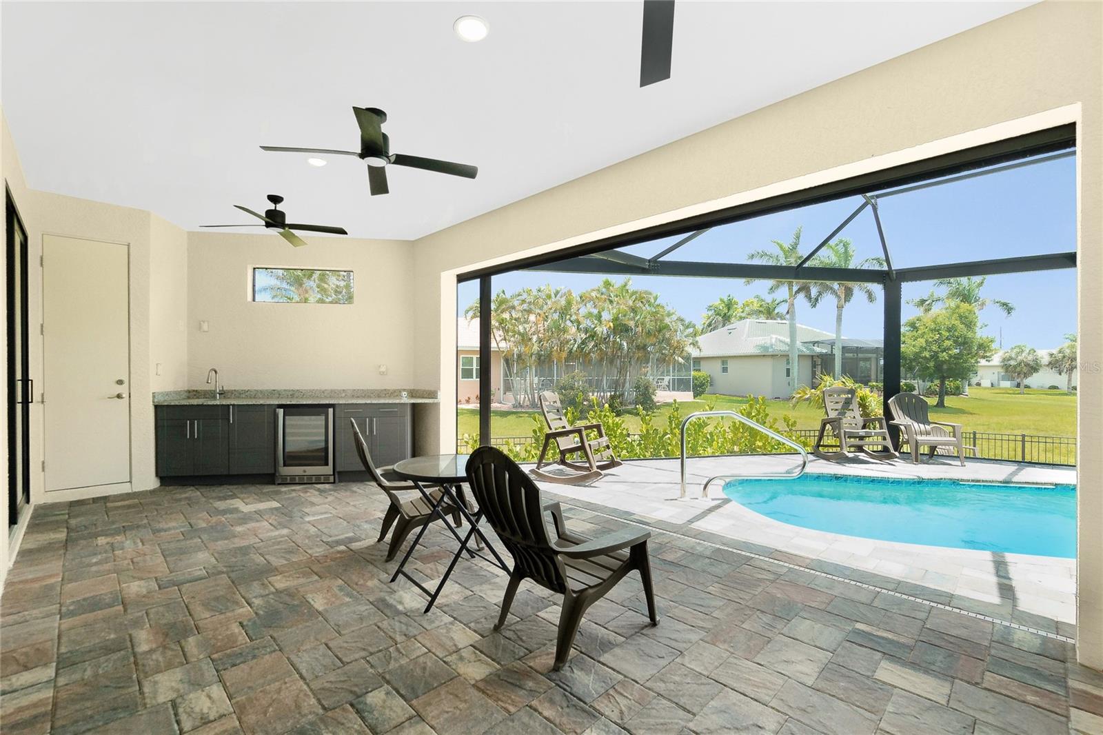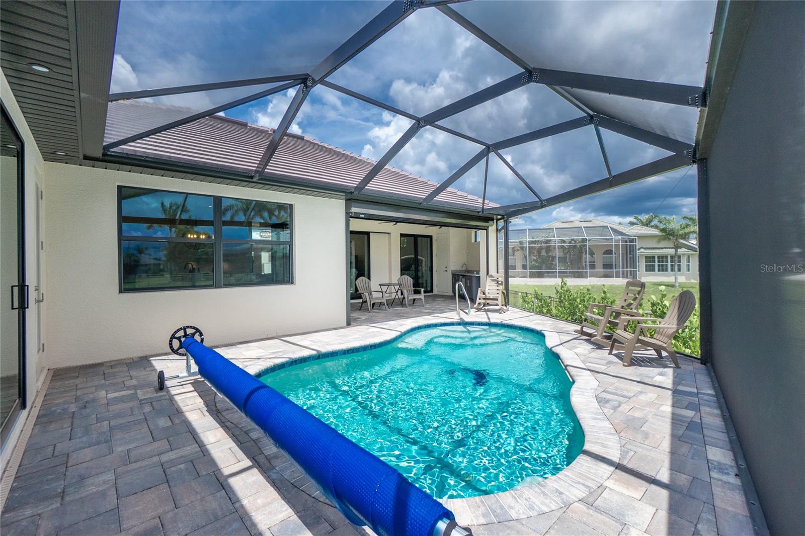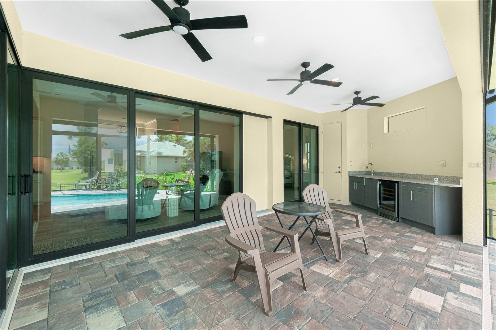 Exterior: Hurricane Shutters, Lighting, Outdoor Kitchen, Rain Gutters, Sidewalk, Sliding Doors