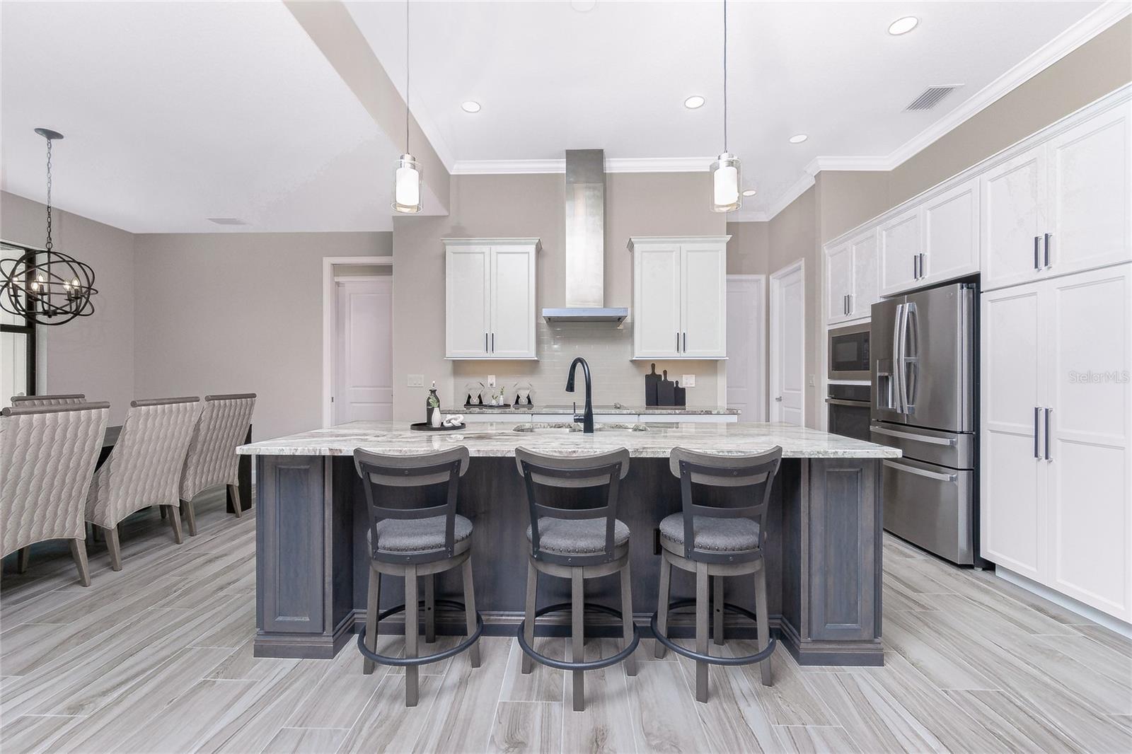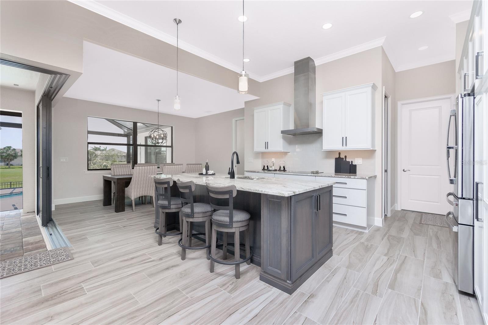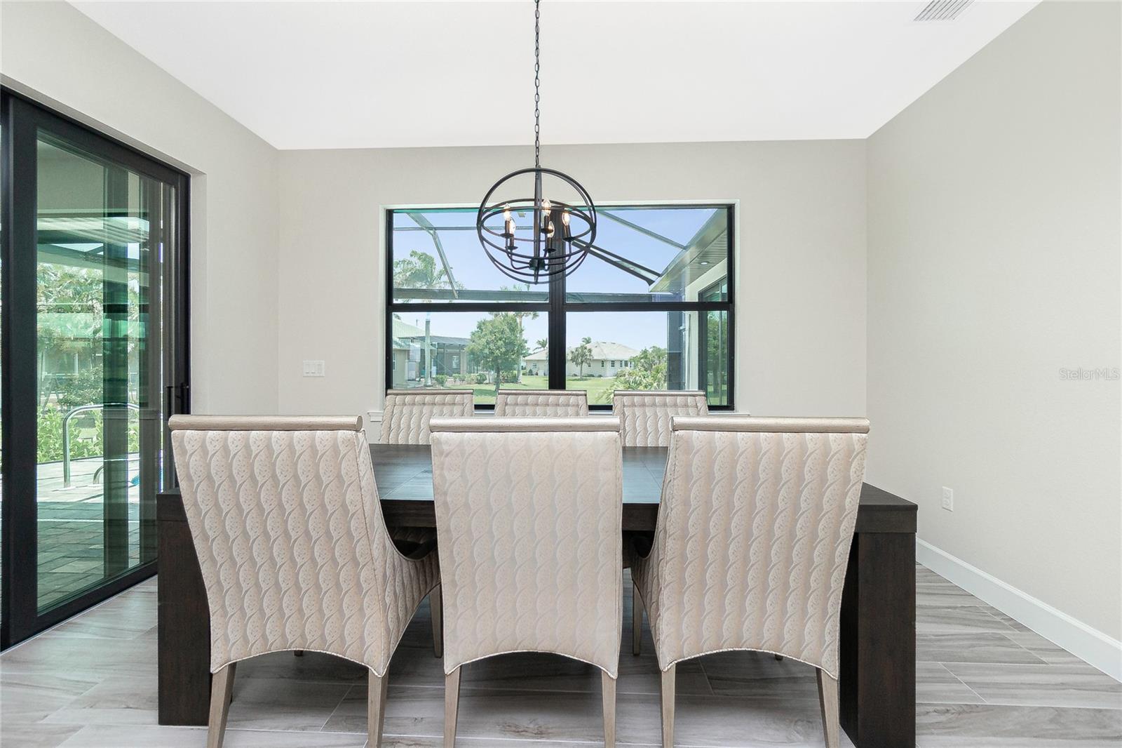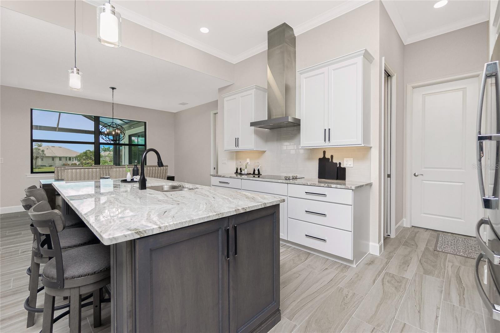 Exterior: Hurricane Shutters, Lighting, Outdoor Kitchen, Rain Gutters, Sidewalk, Sliding Doors