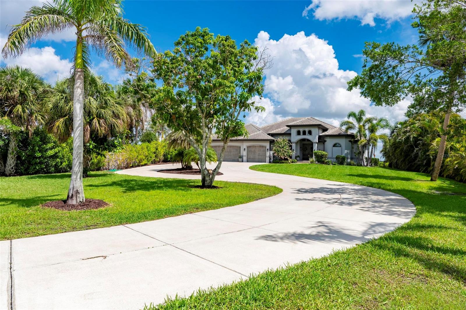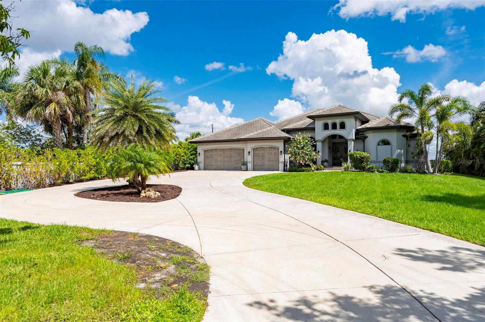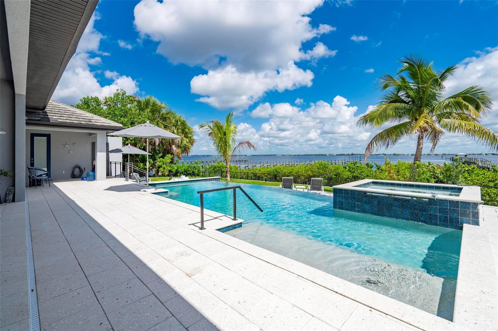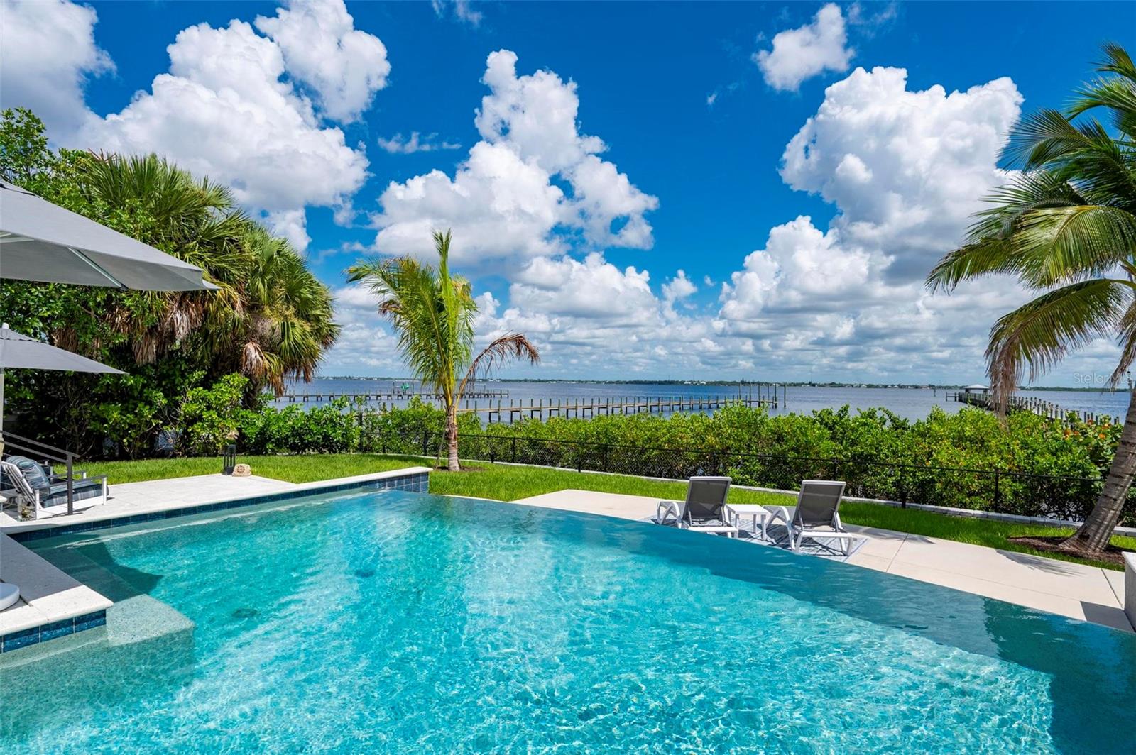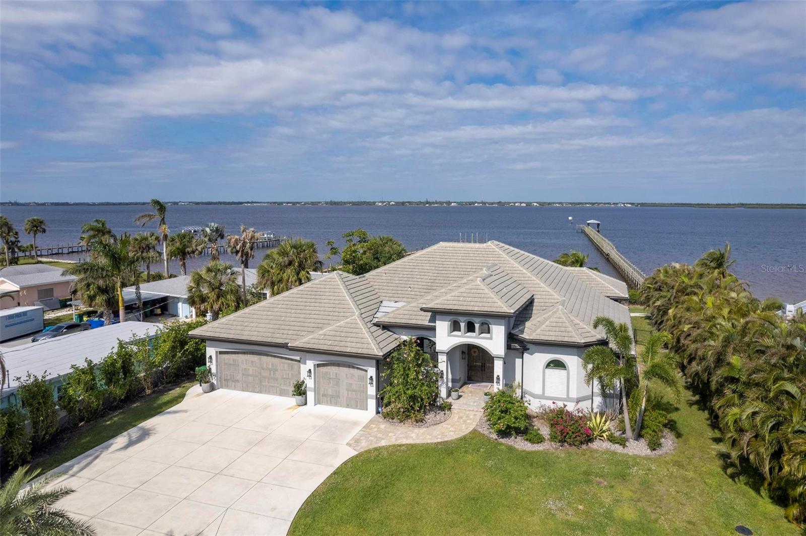 Stunning custom designed, gulf access pool home with unobstructed waterfront views of Charlotte Harbor on a large 1 acre lot. This gorgeous 2019 built home boast 3 bedrooms + den, 3.5 baths and an oversized 3 car garage. As you arrive, the winding concrete circular driveway welcomes you to a raised entry with custom 10ft doors. Step inside and your eyes will be immediately drawn to the expansive water view of Charlotte Harbor. Interior features include 14ft coffered ceiling in the great room with full pocket sliders to the huge 35x15 covered lanai with outdoor kitchen, outdoor shower, infinity edge pool and attached hot tub placed perfectly to view the open water. The kitchen offers high quality cabinets with quartz counter tops, center island, cook top, oven and microwave. The Primary Bedroom boasts open water views, double walk in closets and a dream 19x15 en suite with double vanities and roman style shower. Guest bedroom 2 also has open water views and an en suite that doubles as the pool bath. The large indoor laundry room has attached 16x11 bonus/craft room. The large 33ft wide and 23ft deep 3 car garage provides ample space for large SUV's or workshop. For boating access to Charlotte Harbor and the Gulf there is a deeded 600ft dock extending out into the Peace River.