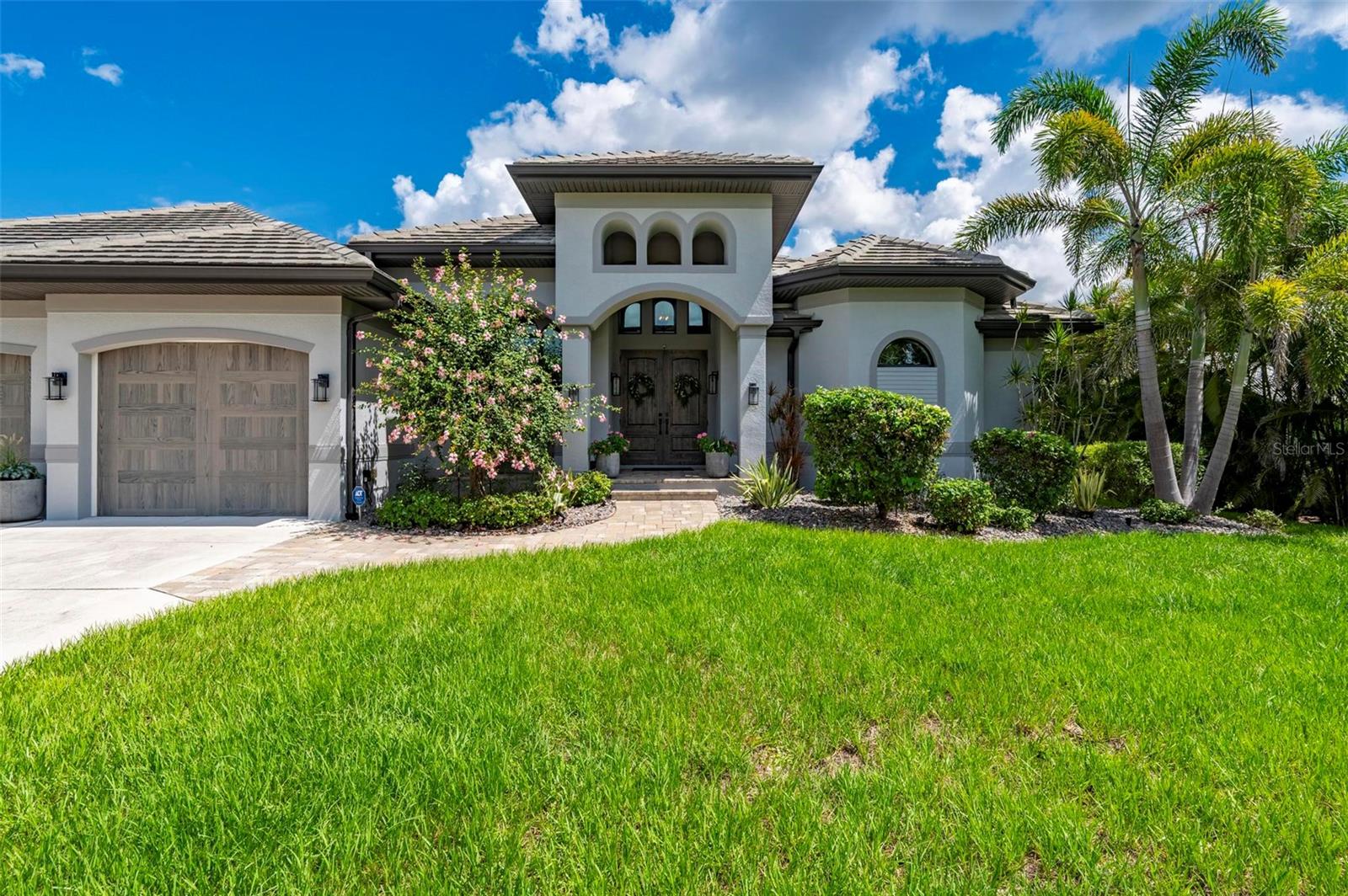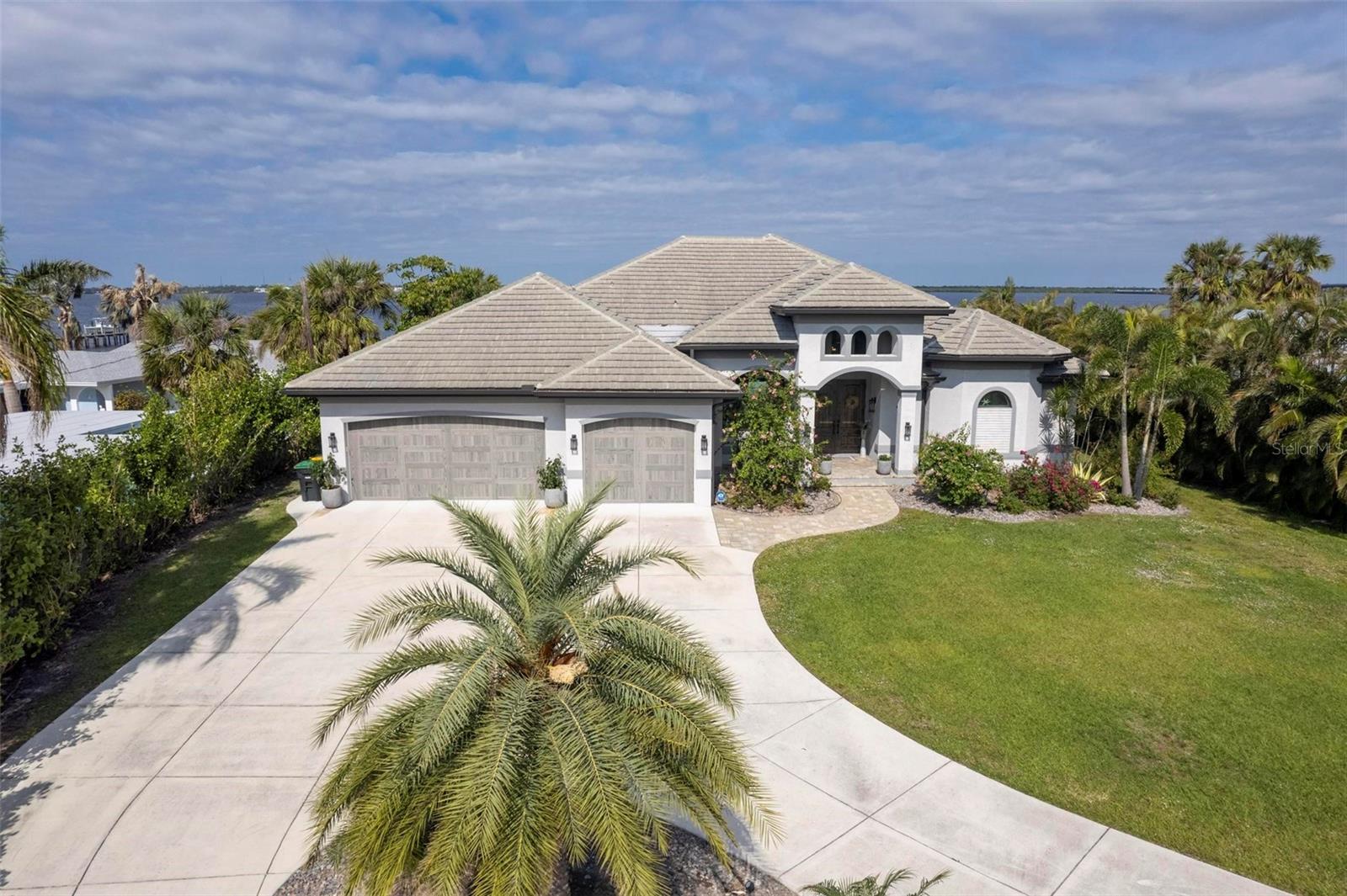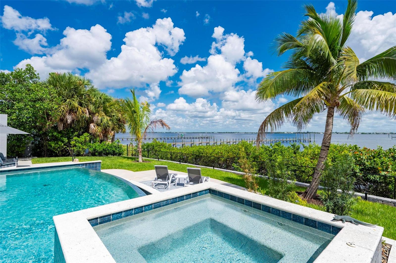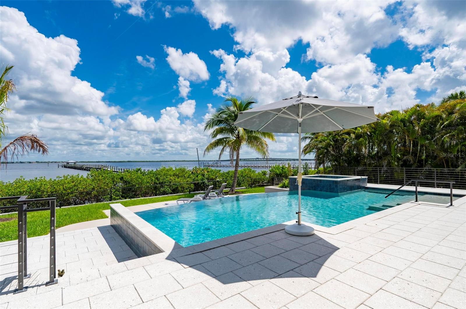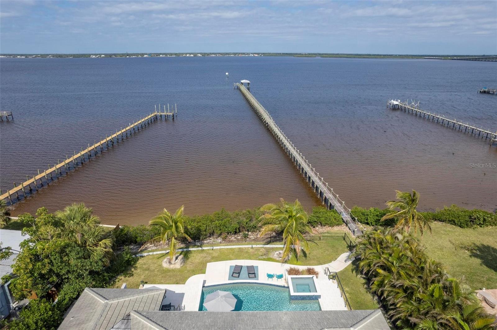 Stunning custom designed, gulf access pool home with unobstructed waterfront views of Charlotte Harbor on a large 1 acre lot. This gorgeous 2019 built home boast 3 bedrooms + den, 3.5 baths and an oversized 3 car garage. As you arrive, the winding concrete circular driveway welcomes you to a raised entry with custom 10ft doors. Step inside and your eyes will be immediately drawn to the expansive water view of Charlotte Harbor. Interior features include 14ft coffered ceiling in the great room with full pocket sliders to the huge 35x15 covered lanai with outdoor kitchen, outdoor shower, infinity edge pool and attached hot tub placed perfectly to view the open water. The kitchen offers high quality cabinets with quartz counter tops, center island, cook top, oven and microwave. The Primary Bedroom boasts open water views, double walk in closets and a dream 19x15 en suite with double vanities and roman style shower. Guest bedroom 2 also has open water views and an en suite that doubles as the pool bath. The large indoor laundry room has attached 16x11 bonus/craft room. The large 33ft wide and 23ft deep 3 car garage provides ample space for large SUV's or workshop. For boating access to Charlotte Harbor and the Gulf there is a deeded 600ft dock extending out into the Peace River.