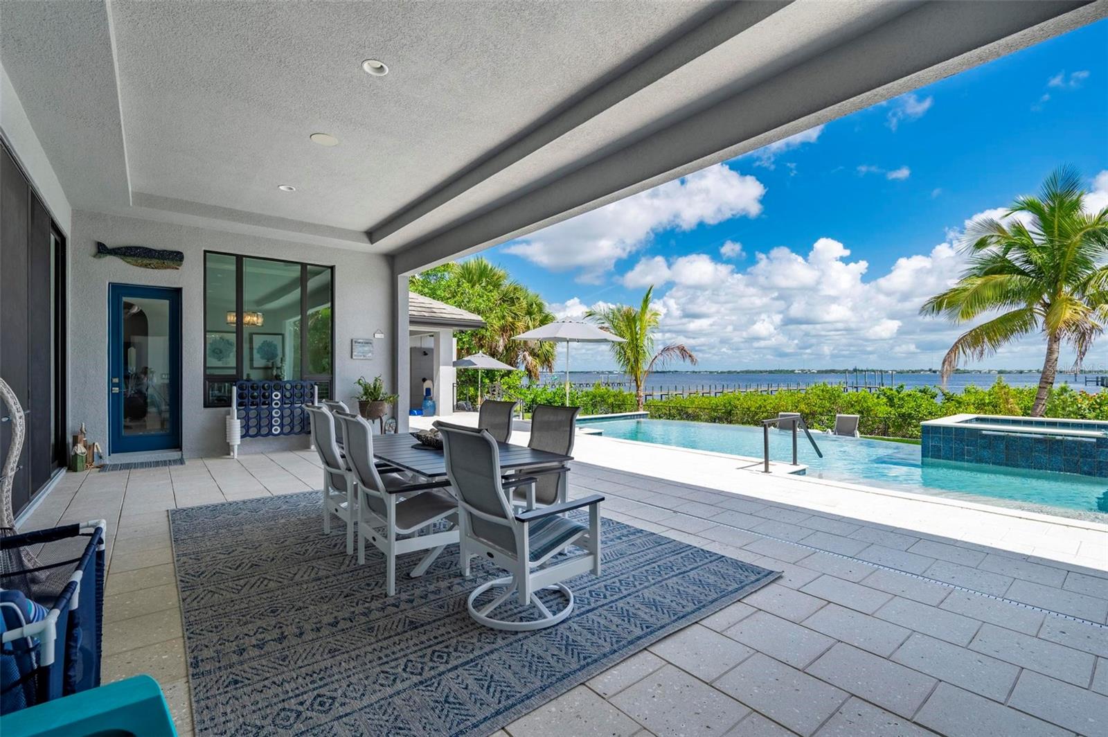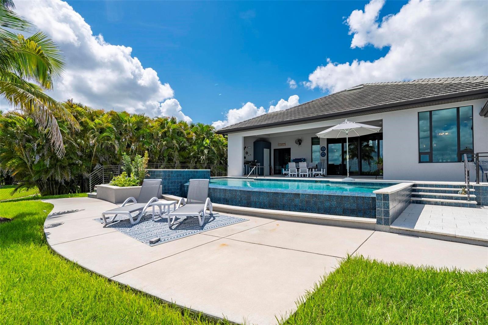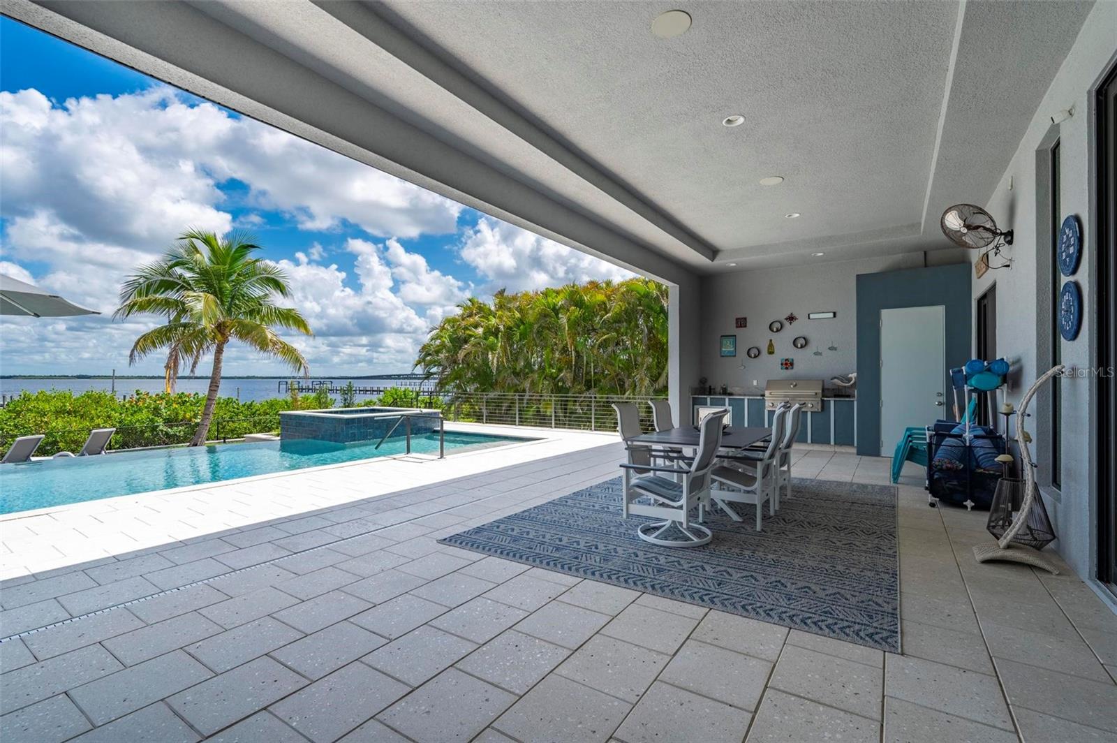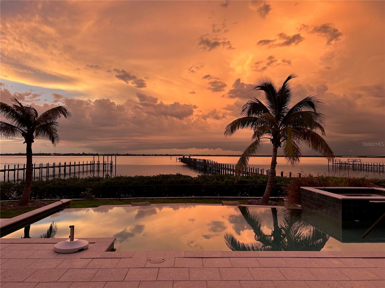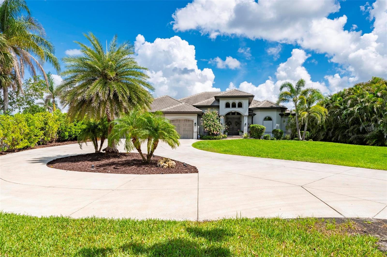 Stunning custom designed, gulf access pool home with unobstructed waterfront views of Charlotte Harbor on a large 1 acre lot. This gorgeous 2019 built home boast 3 bedrooms + den, 3.5 baths and an oversized 3 car garage. As you arrive, the winding concrete circular driveway welcomes you to a raised entry with custom 10ft doors. Step inside and your eyes will be immediately drawn to the expansive water view of Charlotte Harbor. Interior features include 14ft coffered ceiling in the great room with full pocket sliders to the huge 35x15 covered lanai with outdoor kitchen, outdoor shower, infinity edge pool and attached hot tub placed perfectly to view the open water. The kitchen offers high quality cabinets with quartz counter tops, center island, cook top, oven and microwave. The Primary Bedroom boasts open water views, double walk in closets and a dream 19x15 en suite with double vanities and roman style shower. Guest bedroom 2 also has open water views and an en suite that doubles as the pool bath. The large indoor laundry room has attached 16x11 bonus/craft room. The large 33ft wide and 23ft deep 3 car garage provides ample space for large SUV's or workshop. For boating access to Charlotte Harbor and the Gulf there is a deeded 600ft dock extending out into the Peace River.