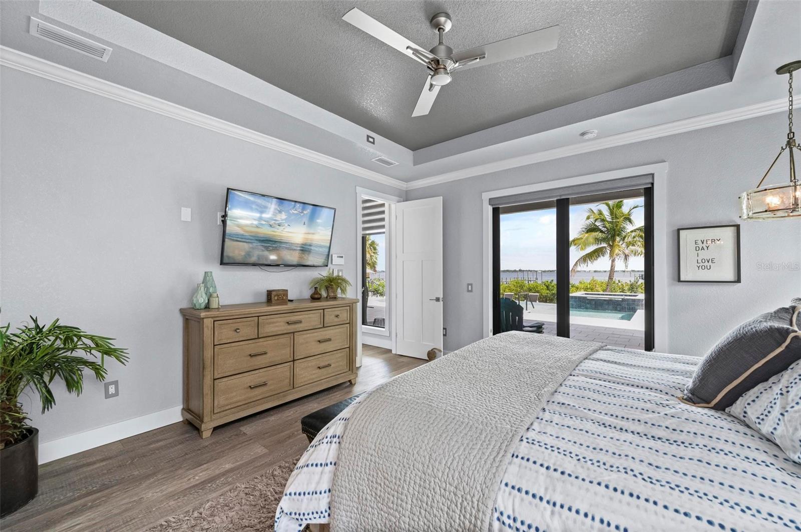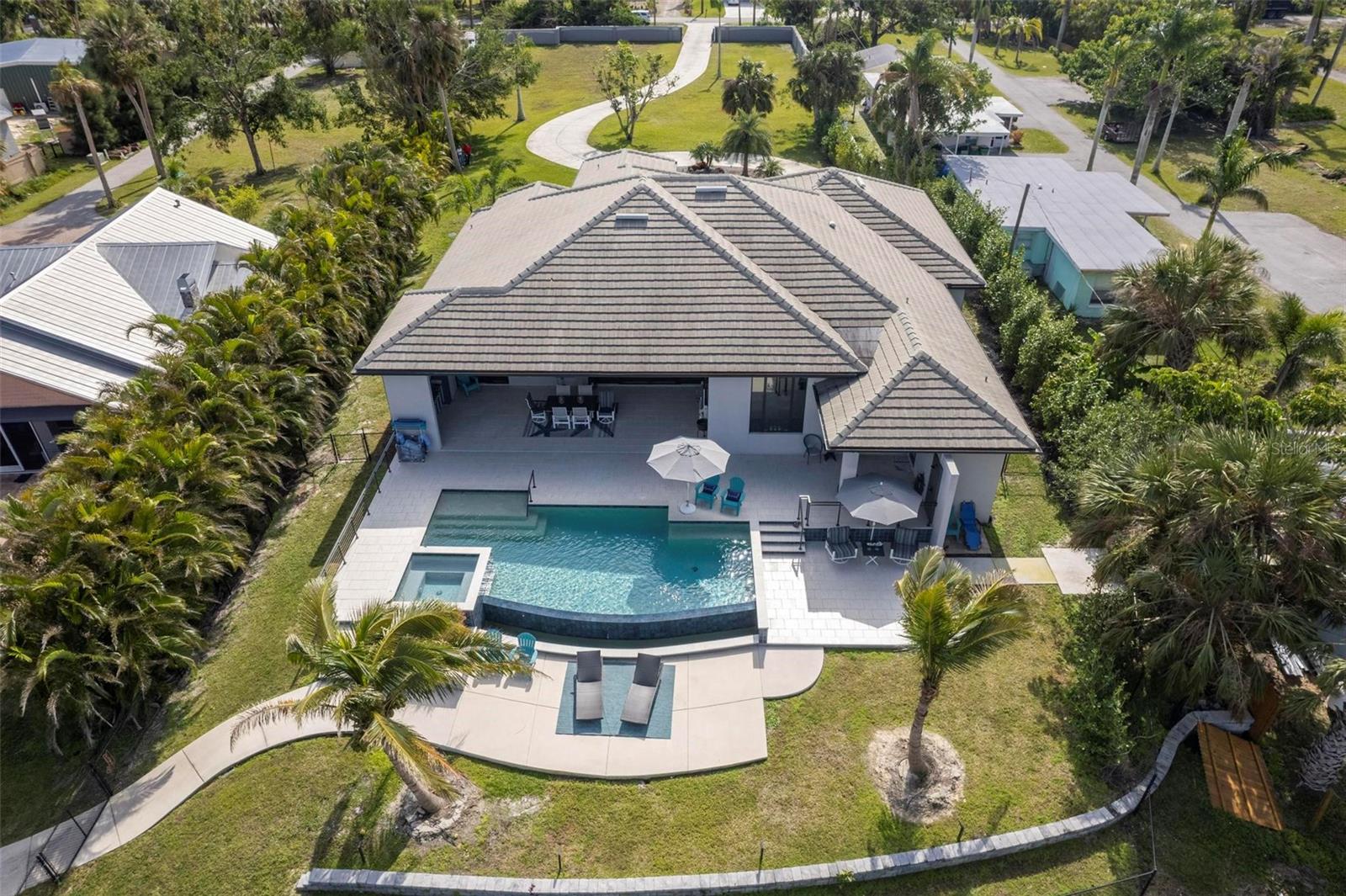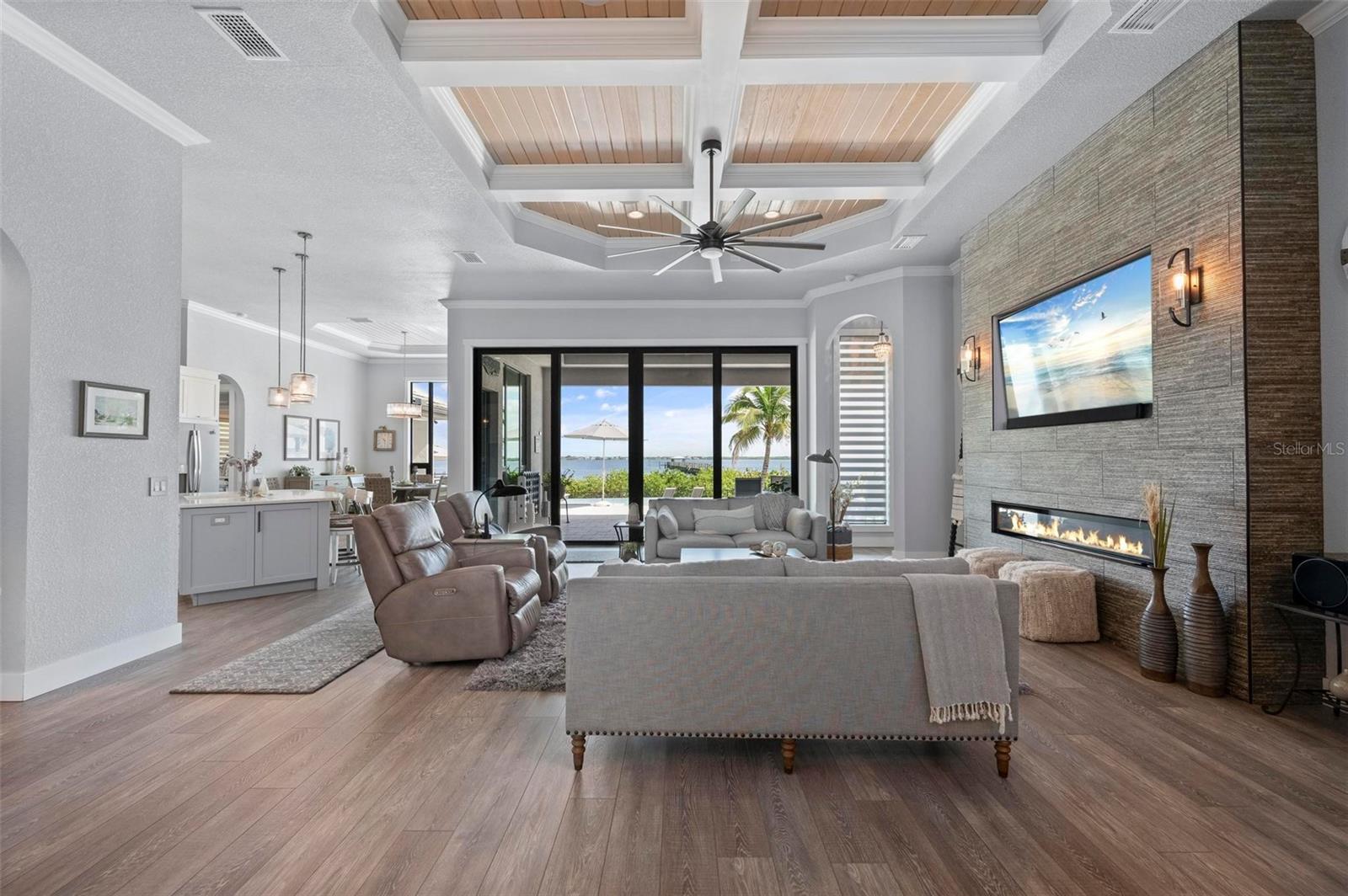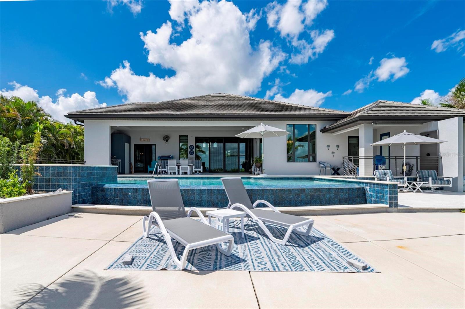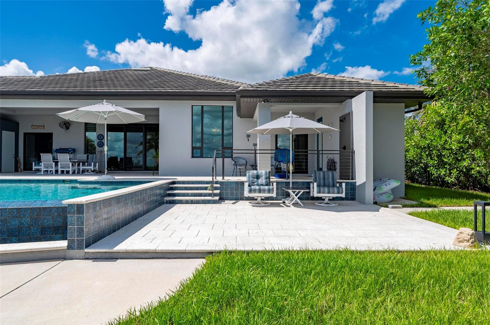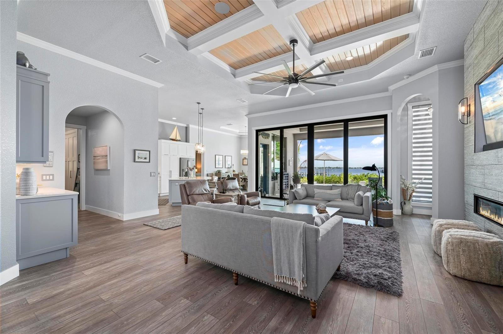 Stunning custom designed, gulf access pool home with unobstructed waterfront views of Charlotte Harbor on a large 1 acre lot. This gorgeous 2019 built home boast 3 bedrooms + den, 3.5 baths and an oversized 3 car garage. As you arrive, the winding concrete circular driveway welcomes you to a raised entry with custom 10ft doors. Step inside and your eyes will be immediately drawn to the expansive water view of Charlotte Harbor. Interior features include 14ft coffered ceiling in the great room with full pocket sliders to the huge 35x15 covered lanai with outdoor kitchen, outdoor shower, infinity edge pool and attached hot tub placed perfectly to view the open water. The kitchen offers high quality cabinets with quartz counter tops, center island, cook top, oven and microwave. The Primary Bedroom boasts open water views, double walk in closets and a dream 19x15 en suite with double vanities and roman style shower. Guest bedroom 2 also has open water views and an en suite that doubles as the pool bath. The large indoor laundry room has attached 16x11 bonus/craft room. The large 33ft wide and 23ft deep 3 car garage provides ample space for large SUV's or workshop. For boating access to Charlotte Harbor and the Gulf there is a deeded 600ft dock extending out into the Peace River.
