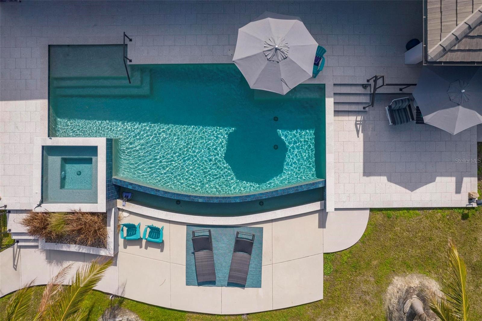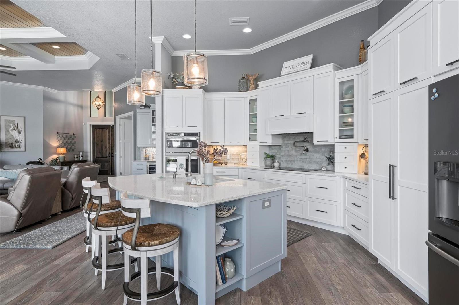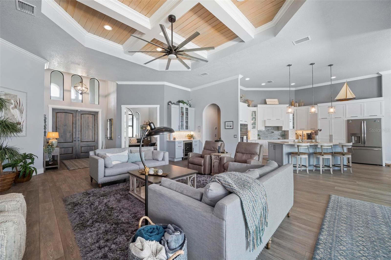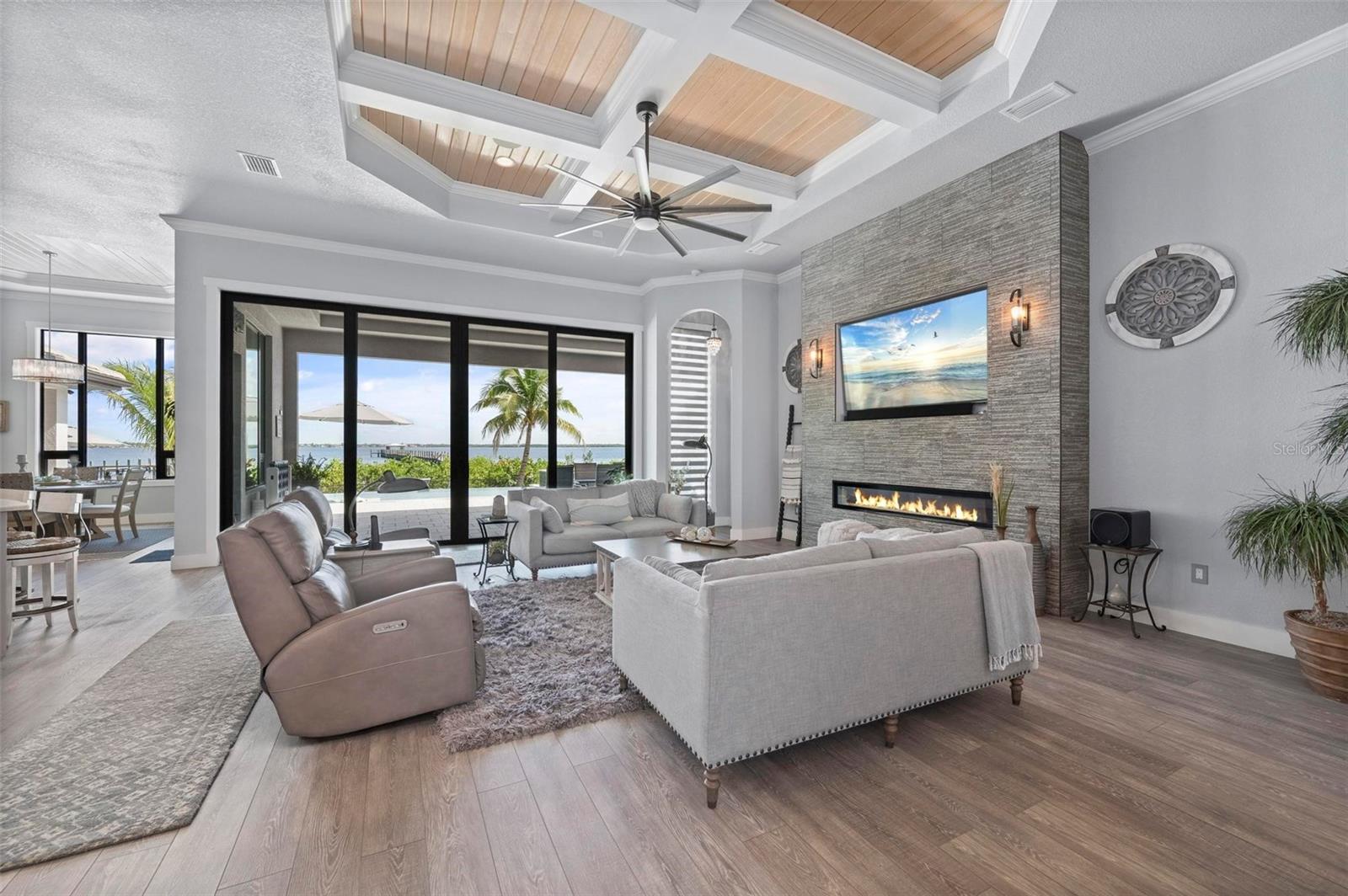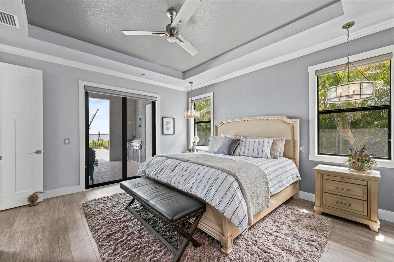 Stunning custom designed, gulf access pool home with unobstructed waterfront views of Charlotte Harbor on a large 1 acre lot. This gorgeous 2019 built home boast 3 bedrooms + den, 3.5 baths and an oversized 3 car garage. As you arrive, the winding concrete circular driveway welcomes you to a raised entry with custom 10ft doors. Step inside and your eyes will be immediately drawn to the expansive water view of Charlotte Harbor. Interior features include 14ft coffered ceiling in the great room with full pocket sliders to the huge 35x15 covered lanai with outdoor kitchen, outdoor shower, infinity edge pool and attached hot tub placed perfectly to view the open water. The kitchen offers high quality cabinets with quartz counter tops, center island, cook top, oven and microwave. The Primary Bedroom boasts open water views, double walk in closets and a dream 19x15 en suite with double vanities and roman style shower. Guest bedroom 2 also has open water views and an en suite that doubles as the pool bath. The large indoor laundry room has attached 16x11 bonus/craft room. The large 33ft wide and 23ft deep 3 car garage provides ample space for large SUV's or workshop. For boating access to Charlotte Harbor and the Gulf there is a deeded 600ft dock extending out into the Peace River.