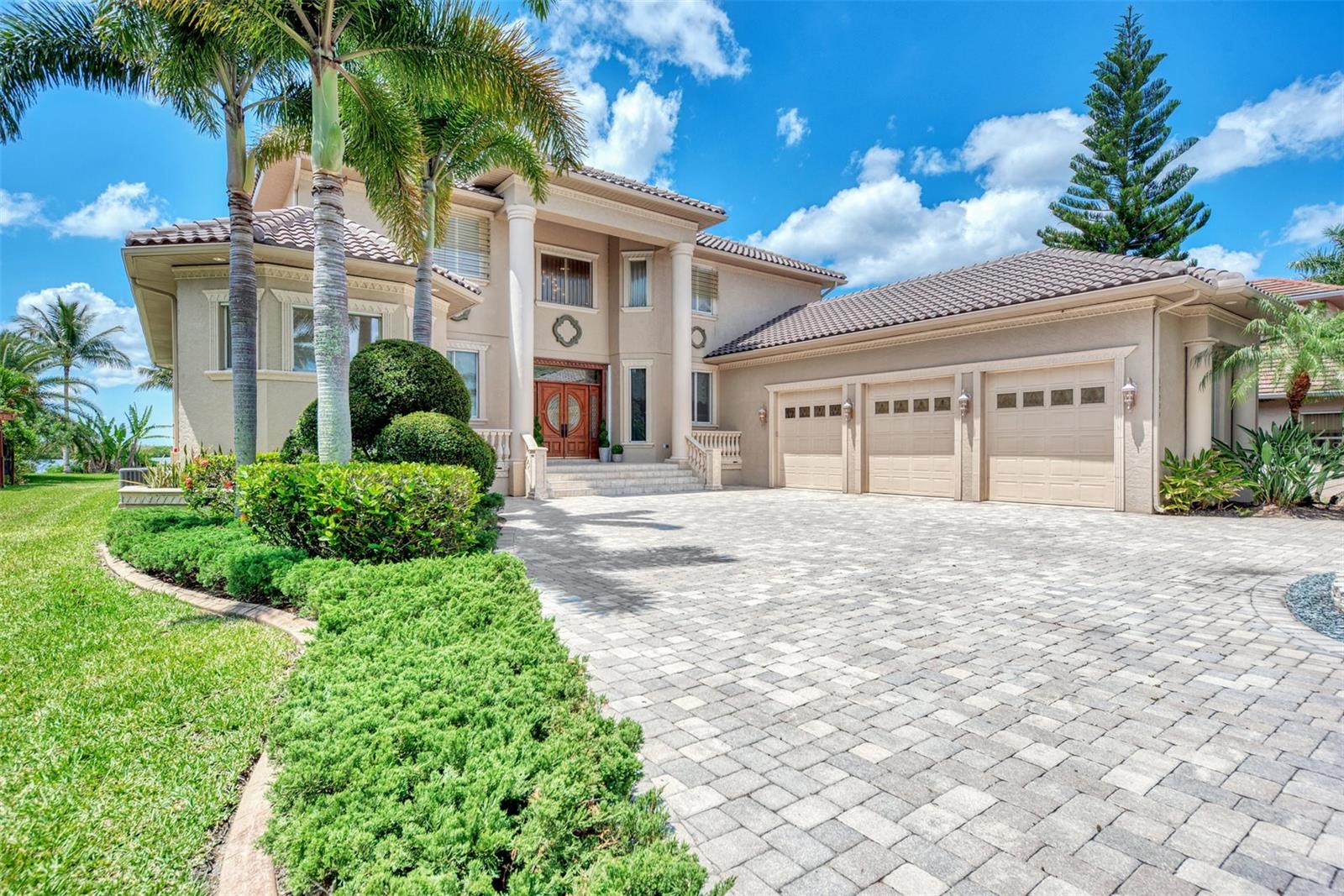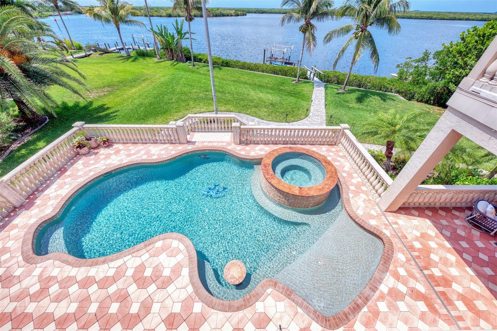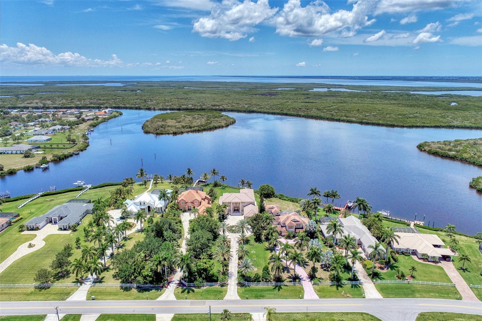 Most Elegant & Sophisticated SAILBOAT ACCESS 2-story Mediterranean style estate pool & spa home offering 4 bds., 3.5 baths, and 3 car garage (Tesla hook-up) & over 5300 sq.ft. of luxury living! This home is located on almost 1 acre, directly on the Manchester waterway with a private NEW boat dock, 10,000 pound boat lift & concrete seawall that leads out to the Gulf of Mexico. NEW soffits and fascia all around the home! Once through the iron gate (NEW keypad), you'll drive down the beautifully landscaped circular driveway to the gorgeous fountain in the center. Tall mature palms and lush green landscaping take you to the elevated front entrance. This home is in South Bayview estates, an area of upscale waterfront homes w/ a fee of only $60/yr. You'll love the expansive view of blue waters from everywhere in the home! On the 1st floor you'll find travertine marble flooring, marble columns, crown molding, soaring ceilings & a beautiful marble fireplace. The pool has been newly surfaced with coral reef & dolphin design and features a spa, swim up table & sun shelf area. The patio also features an outside summer kitchen! The chef's kitchen is equipped with a center island w/built-in sink & wine refrigerator. Enjoy granite countertops & large breakfast bar, 42' cherry wood cabinetry, tumbled marble backsplash, sub zero refrigerator, wolf stove top with pot filler & Cafe stainless steel appliances. The kitchen overlooks the family room w/wood accent lighted tray ceiling! The master bd. is 14x29 w/double tray ceilings, sitting area, his & hers closets, plenty of storage w/built-in cabinetry & shelving, double French doors leading out to the pool patio w/ peaceful waterfront & swaying palm trees! The master bath comes w/ jacuzzi tub with jets, dual granite vanities & two sided entry to the walk in shower with dual shower heads & seat. Right down the hall is a guest bath w/ granite countertops, sink w/dolphin head faucet, cherry wood cabinet, seascape mural, walk-in shower & frosted glass door leading to the pool! Enjoy working in the upgraded office w/built in oak desk, bookshelves & upgraded octagon ceiling w/wood design & upgraded paddle fan. On the 1st floor you'll find a large inside utility rm w/granite countertop, built-in cabinetry & sink, crown molding & front load washer/dryer. The oak & wrought iron staircase will lead you to the 2nd floor where you'll find a 2nd master suite w/ private bath & entry to the 2nd patio. Upstairs you'll also find the 3rd & 4th bedroom, a large game rm, exercise rm & best of all the movie rm with 7 leather reclining movie chairs, granite serving station w/ built-in sink, large movie projection screen, speakers, projector & half bath! The great rm & exercise rm both lead to the 2nd floor balcony patio w/built-in fireplace & wood ceiling! The great room is being used as a recreation room & offers a built-in wet sink, beverage cooler & cabinetry. Top & bottom patios have concrete spindles (balustrades) bordering both outside patios! Extra upgrades include: new pool heater, central vacuum, intercom & security system, in wall pest control, 2 mana bloc systems, mosquito mist around exterior, 3 air conditioning units (1 newer), 5 cat wiring w/separate unit, Sonos sound system wired throughout, water softener, new tile slate roof (2021), accordion & clear hurricane shutters & more! Per seller, home has never flooded or had any leaks from hurricanes! Location is minutes to downtown Punta Gorda shops & restaurants!