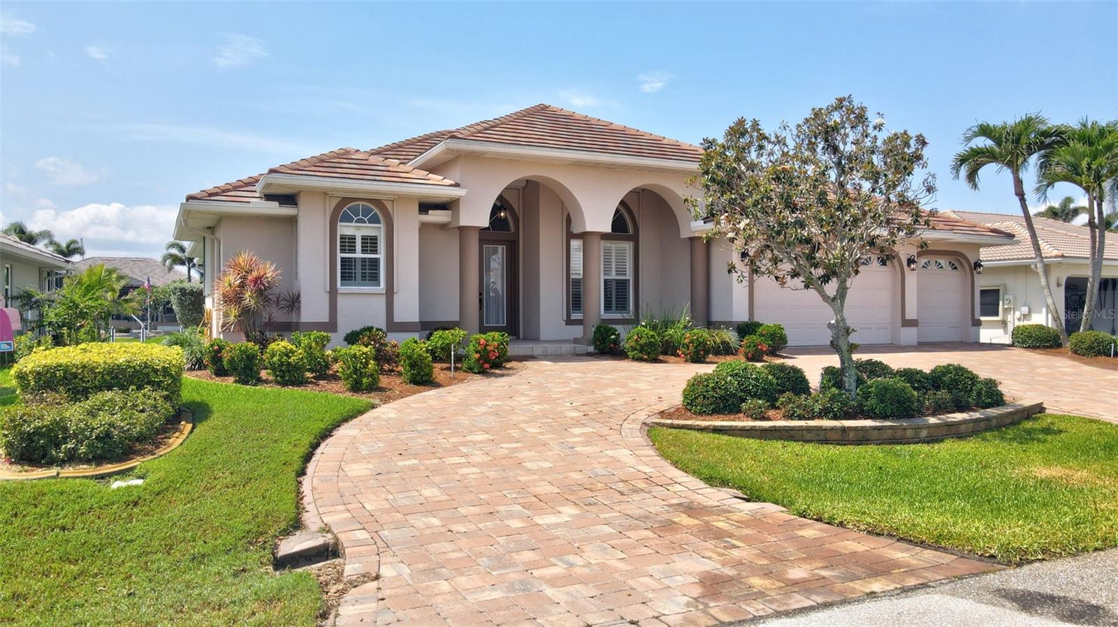 WATERFRONT HOME IN PGI W/INTERSECTING CANAL VIEWS & QUICK SAILBOAT ACCESS - Here's a home that makes every day feel like vacation. Located in Punta Gorda Isles, this 3 bed/2 bath waterfront gem w/***NEW TILE ROOF*** features a view of intersecting canals and offers quick sailboat access via Ponce Inlet. With 72 feet of seawall (replaced by the city in 2019), an extended dock & boat lift, it's made for boaters who want to get out and go. The home impresses from first glance with a circular brick-paver drive & well-maintained, tropical landscaping. Inside, the vibe is light, open, and welcoming. The kitchen's been beautifully updated with white cabinetry, gorgeous quartz counters, stainless appliances, and a center island that's just begging for casual breakfasts or evening appetizers with friends. A textured tray ceiling with recessed lights adds a bit of flair, and the pass-through window to the lanai makes outdoor entertaining a breeze. The stainless-steel appliances are top-of-the-line including a Dacor double wall oven, French door refrigerator & Bosch dishwasher. Architectural details include tile flooring throughout, updated ceiling fans, updated LED lighting, crown molding in foyer, living room & dining room plus a cathedral ceiling in the family room. The family room boasts a beautiful, wood-burning fireplace, walk-out access to the lanai & pool/canal views. The open layout gives everyone their own space and sense of privacy. The master suite is located just off the living room and opens directly to the lanai w/NEW impact-resistant French doors. It features two walk-in closets and an en-suite bath w/double sinks and glass-enclosed shower. Tucked quietly at the back of the home, one guest bedroom offers a peaceful retreat for visitors with easy access to a beautifully renovated full bath. Up front, just off the foyer, the third bedroom is ideally placed for a home office, den, or creative space--flooded with natural light and flexible to suit your needs. Step outside to your private backyard oasis: the screened lanai includes an in-ground, heated pool, & covered seating area. Accordion shutters protect the covered lanai area with just a pull meanwhile hurricane fabric covering available for family room folding doors. Beyond the lanai, a beautiful brick paver patio with seating awaits. The space is perfect for watching dolphins play in the canal or simply kicking back & enjoying the view. The extended concrete dock offers a 10,000 lb lift, water & electric hook-ups plus quick access to open water for world-class fishing and boating. With recent updates including ALL NEW impact-resistant windows (2023), NEW impact-resistant doors, NEW Bahama shutter covering front windows, replaced sliding glass doors w/modern folding-style doors, and smart, thoughtful touches throughout, this home checks all the boxes for relaxed Florida living. Other amenities include oversized 2-car garage w/epoxy flooring, whole-house sediment filter, fenced backyard, underwater fish light, & new electrical panel. Enjoy the tranquil location near the end of a quiet cul-de-sac. And with downtown Punta Gorda, Ponce Park, the Isles Yacht Club, and Fishermen's Village just minutes away, you're right where you want to be. Make an appointment today!
