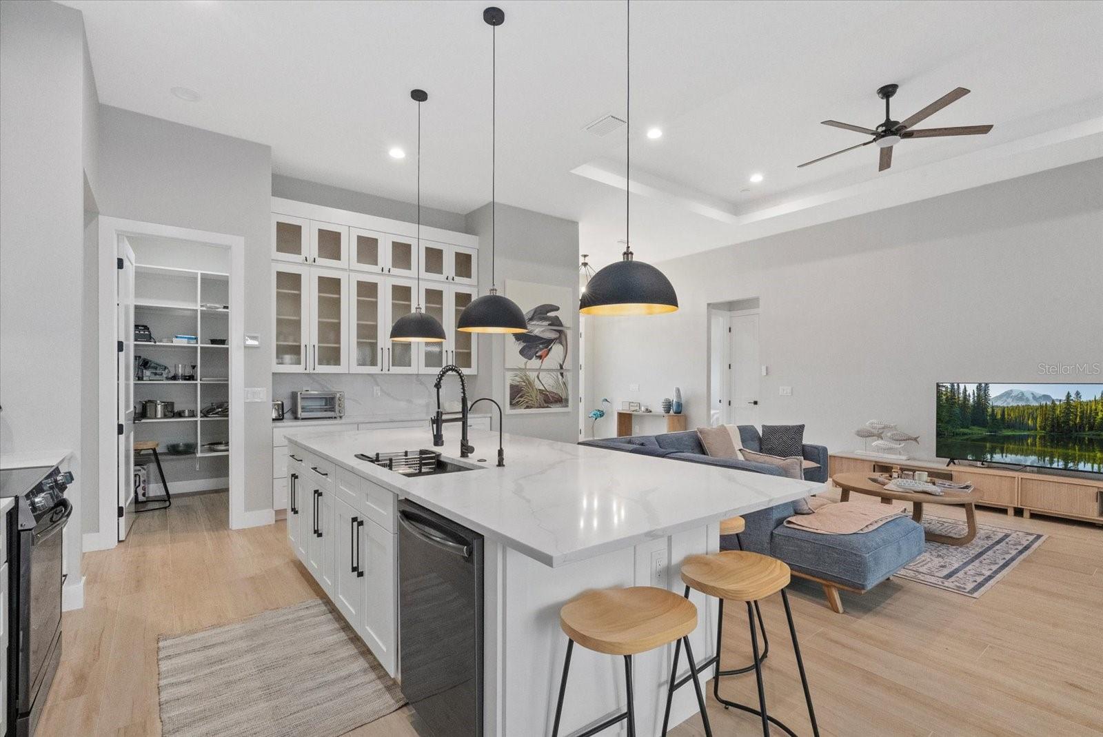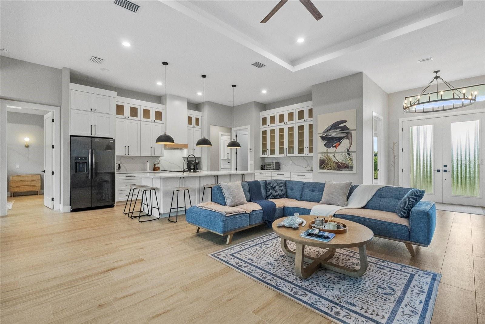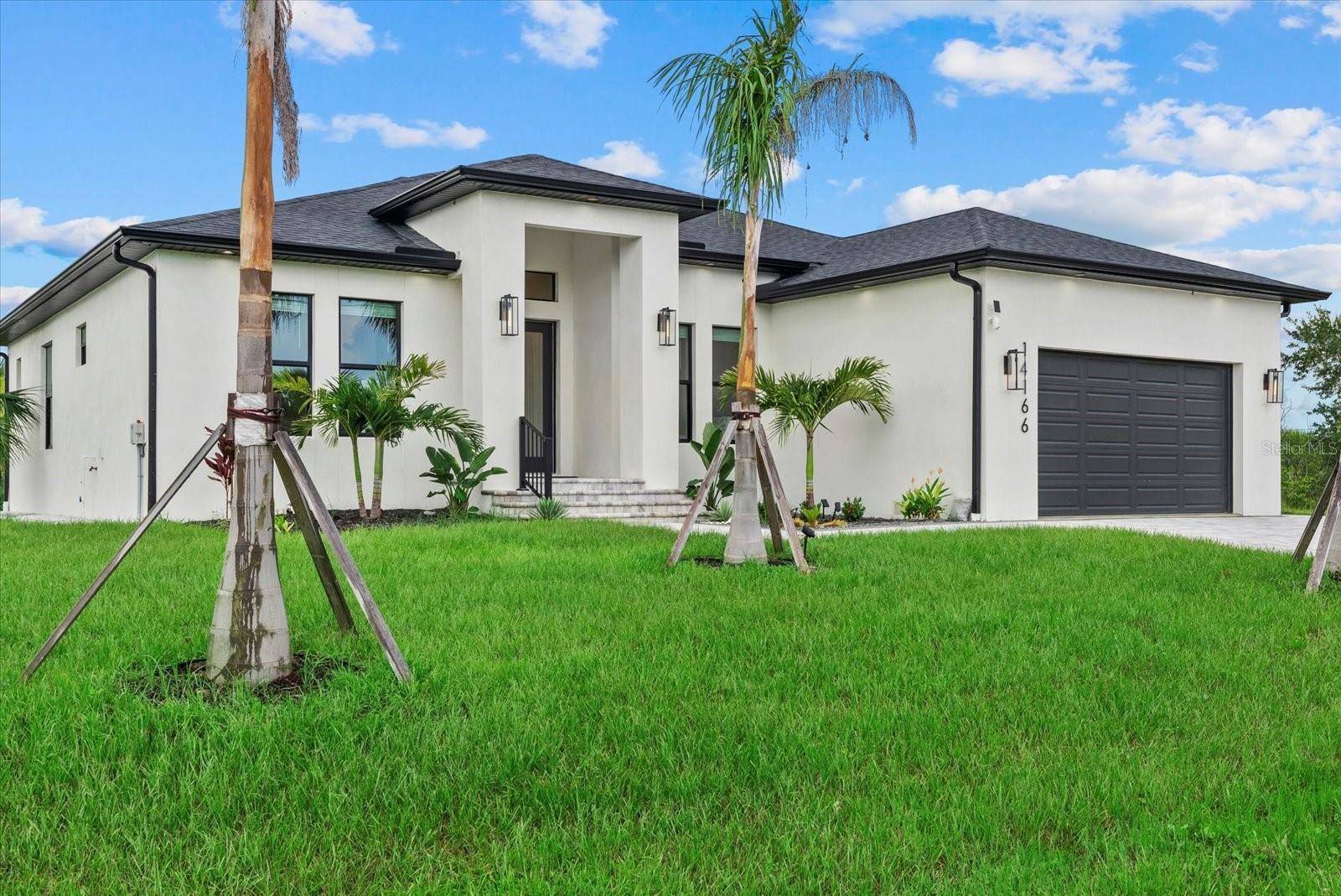 Newly built in 2024 and move-in ready! This stunning WATERFRONT home with GULF ACCESS is packed with high-end features and modern coastal charm. Offering 3 bedrooms + a den, 3 bathrooms, and 2,166 sq ft of living space, the home is built on a 4-course stem wall for added elevation and features IMPACT WINDOWS AND DOORS throughout. A grand entrance welcomes you with modern GLASS DOUBLE DOORS, leading into a bright and airy space with SOARING CEILINGS, 8' INTERIOR DOORS, and wood-look plank TILE flooring that flows seamlessly throughout. The chef's kitchen is a showstopper, featuring QUARTZ COUNTERTOPS with a WATERFALL feature on the island, soft-close cabinetry, and a WALK IN PANTRY with built-in shelving--perfect for both function and style. The primary suite is a true retreat, featuring spacious walk-in closets and a spa-inspired en-suite bathroom with designer tile, a DOUBLE VANITY, and a luxurious walk-in TILED shower. The split floor plan ensures privacy, with two additional bedrooms located on the opposite side of the home--one of which includes its own private en-suite bath, ideal for guests or multigenerational living.The home also features a pavered driveway, pavered walkway all around the home, canal-fed irrigation system, and gutters all around the home for added function and curb appeal. Step outside to take in breathtaking canal views and embrace the best of Florida living--boating, fishing, kayaking, or simply relaxing in the peace and privacy of your own turnkey waterfront retreat. Nestled in the sought-after boating community of South Gulf Cove, this location offers direct access to the Gulf and is just minutes from world-class beaches, top-rated golf courses, and some of the best fishing in Southwest Florida. With an optional HOA of just $120/ year, South Gulf Cove combines relaxed coastal living with unbeatable convenience--a true hidden gem for waterfront lifestyle seekers.
