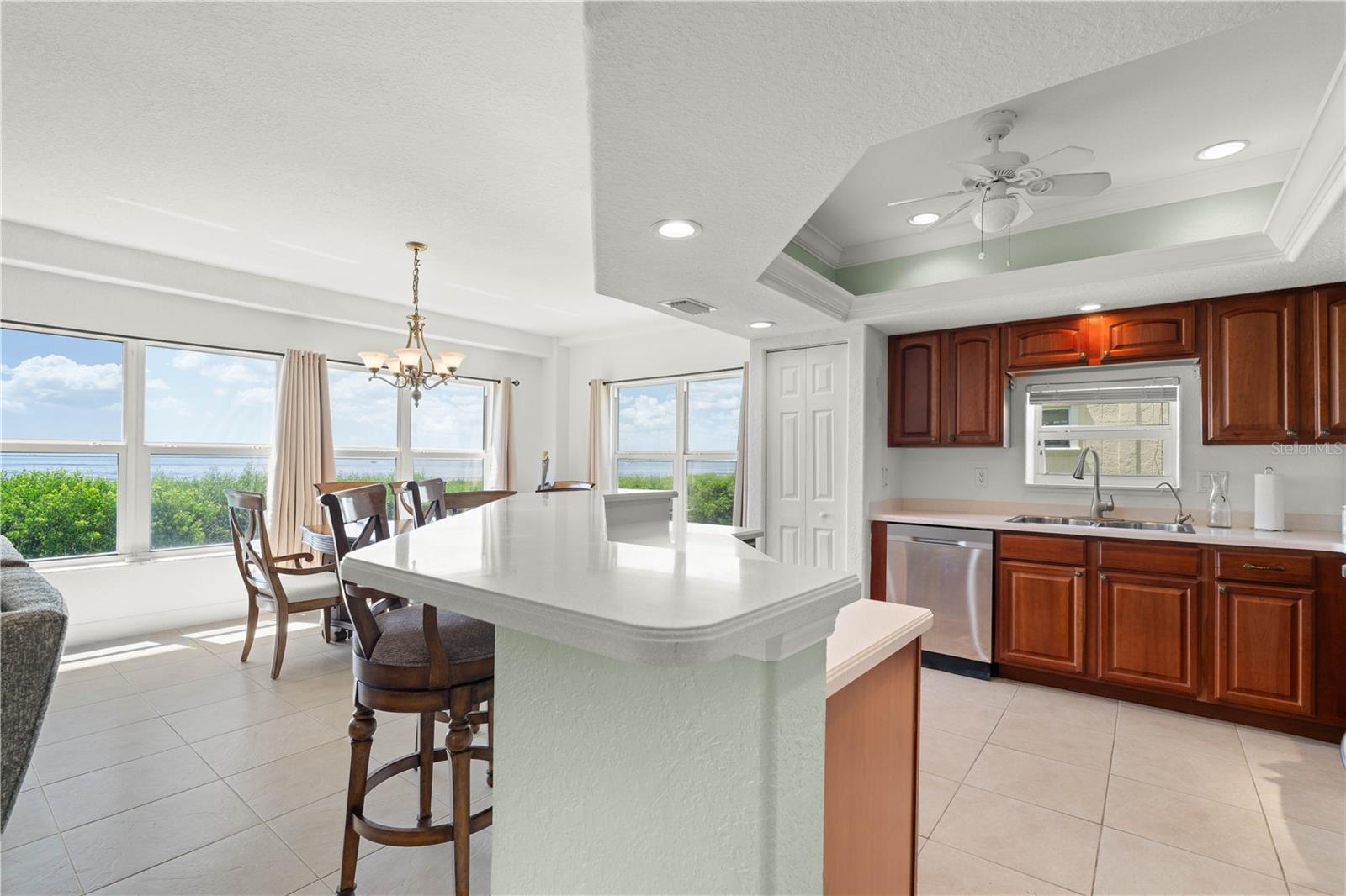END UNIT W/SPECTACULAR VIEWS OF CHARLOTTE HARBOR AT POINTS WEST CONDO IN PGI - Enjoy front-row seats to breathtaking sunsets over Charlotte Harbor from this 2 bed/2 bath, end-unit condo in the waterfront community of Points West. Sweeping western views are available behind this spacious, 1,500+ sqft condo offers a blend of convenience and unforgettable vistas. Watch the dolphins and manatees play from your screened balcony or take in the endless parade of boats passing by--all just steps from your living room. The open-concept layout features a large great room and adjacent dining area, all bathed in natural light from oversized windows & sliders that lead to the lanai. A centrally located kitchen overlooks the living space and offers stainless steel appliances, solid surface counters, curved breakfast bar, raised-panel cabinetry, plus a closet pantry. Tile flooring runs throughout the main living areas, bathrooms, and guest bedroom, adding to the low-maintenance appeal of the unit. The spacious master suite enjoys direct access to the lanai, an oversized walk-in closet, and an en-suite bath with dual sinks and a tiled walk-in shower. The split-bedroom design ensures privacy for both owners and guests. The interior laundry room includes full-sized washer/dryer and additional storage. Points West is a vibrant, owner-occupied community offering resort-style amenities: heated in-ground pool, clubhouse, tennis court, & kayak launch. Covered, under-building parking and a private 4x5 storage unit are also included. No pets are permitted per condo association. Just minutes from Isles Yacht Club, Fishermen's Village, downtown Punta Gorda, and the Harbor Walk pathways, this location invites an active, coastal lifestyle. Walk or bike to waterfront dining, boutique shopping, or take your kayak out from the backyard. Find out why Punta Gorda is continuously voted one of the best places in the country to live, work, play & retire! Schedule your showing today - the view won't disappoint!