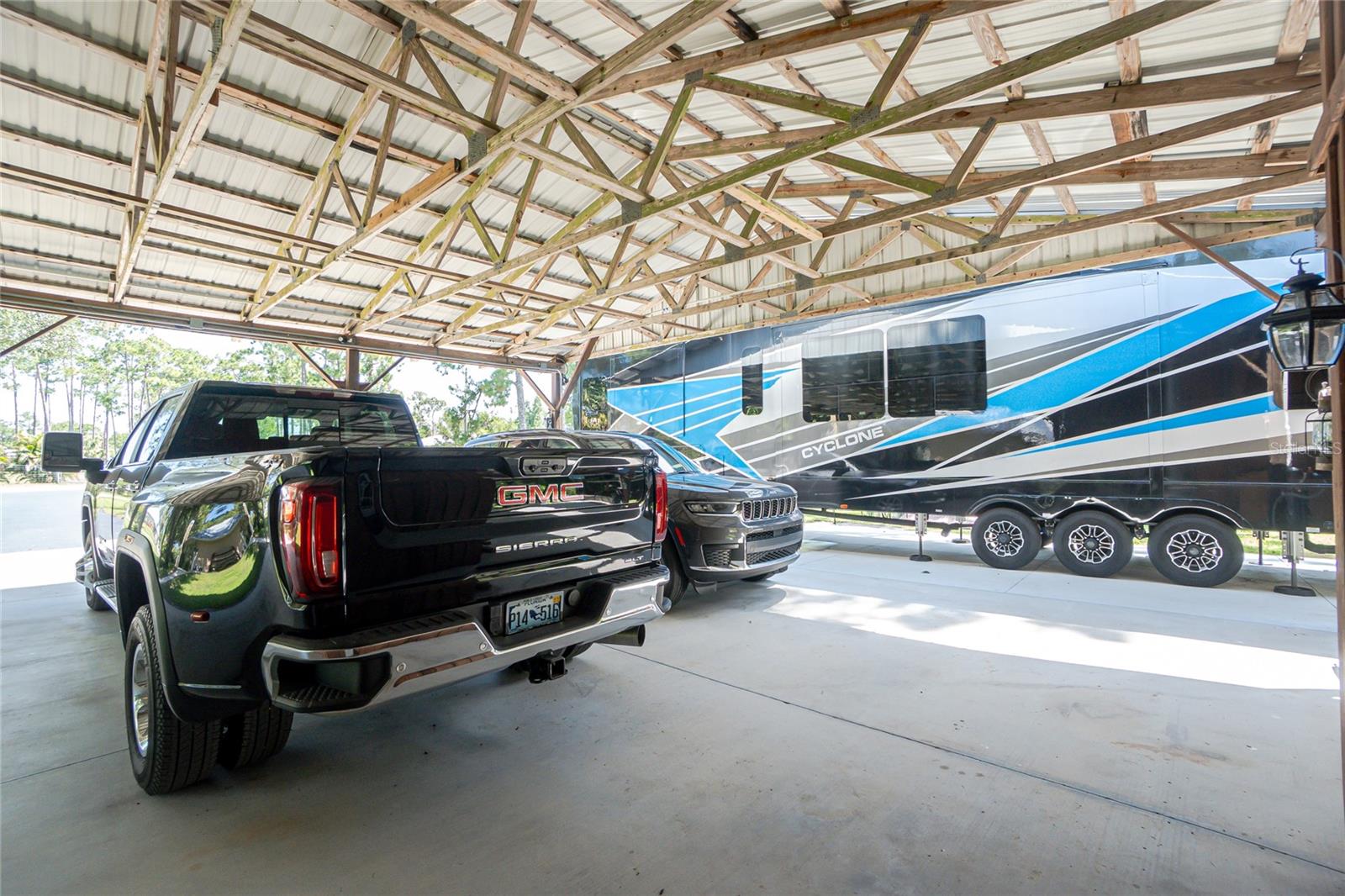 Garage Features: Boat, Covered, Driveway, Garage Door Opener, Golf Cart Parking, Parking Pad, RV Carport, RV Access/Parking, Workshop in Garage