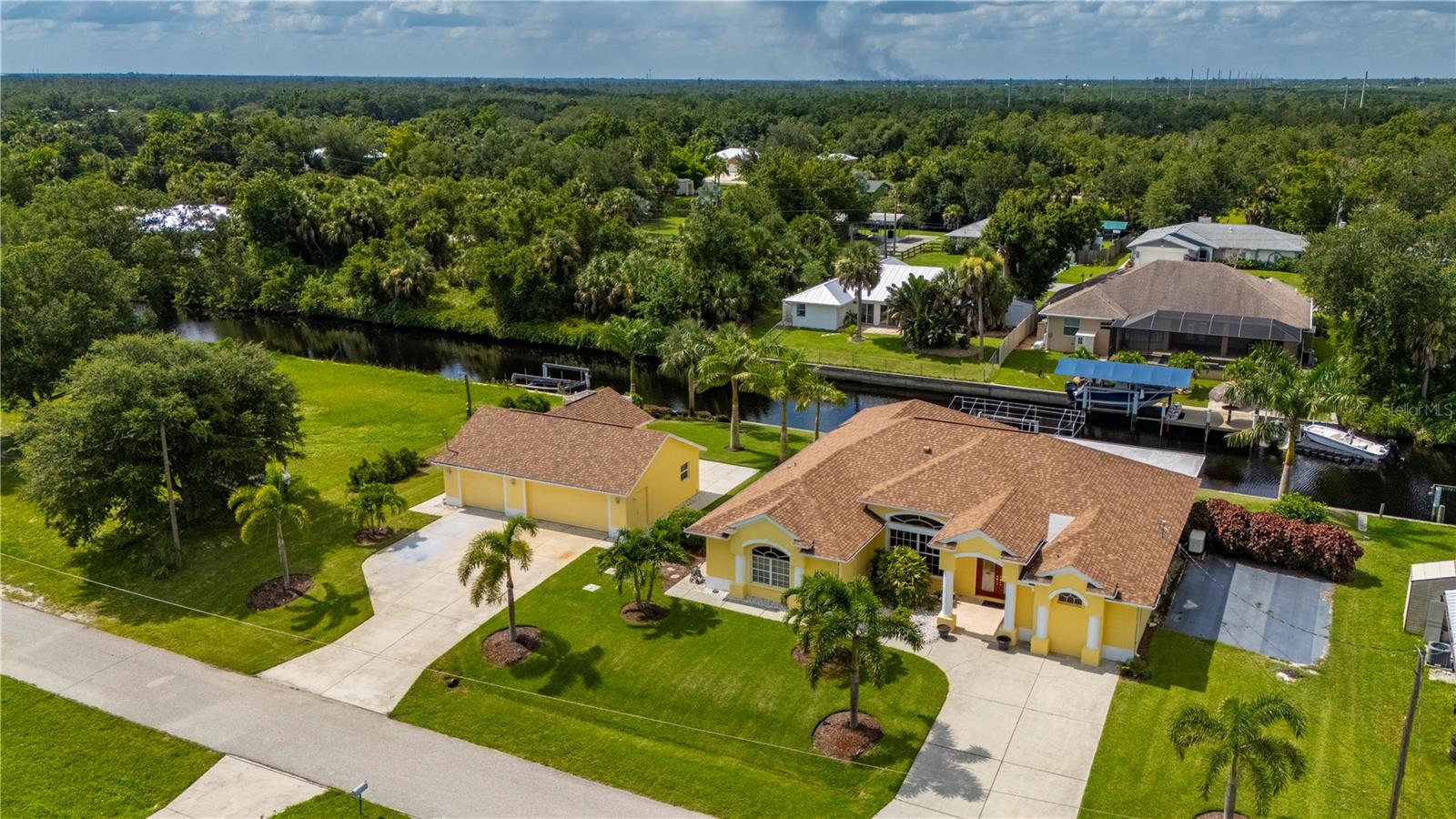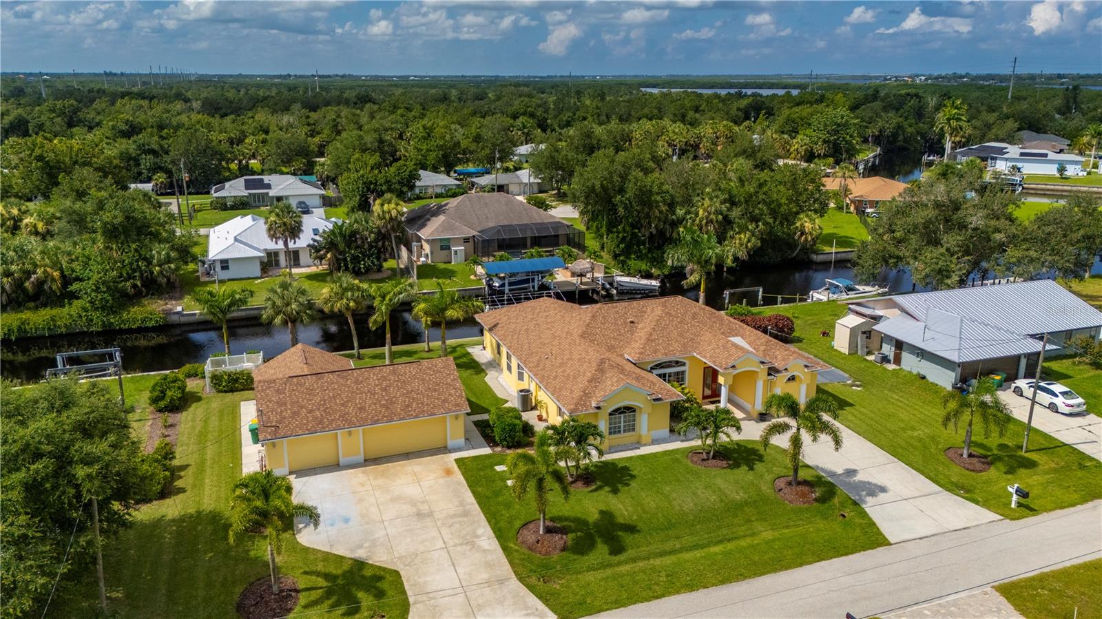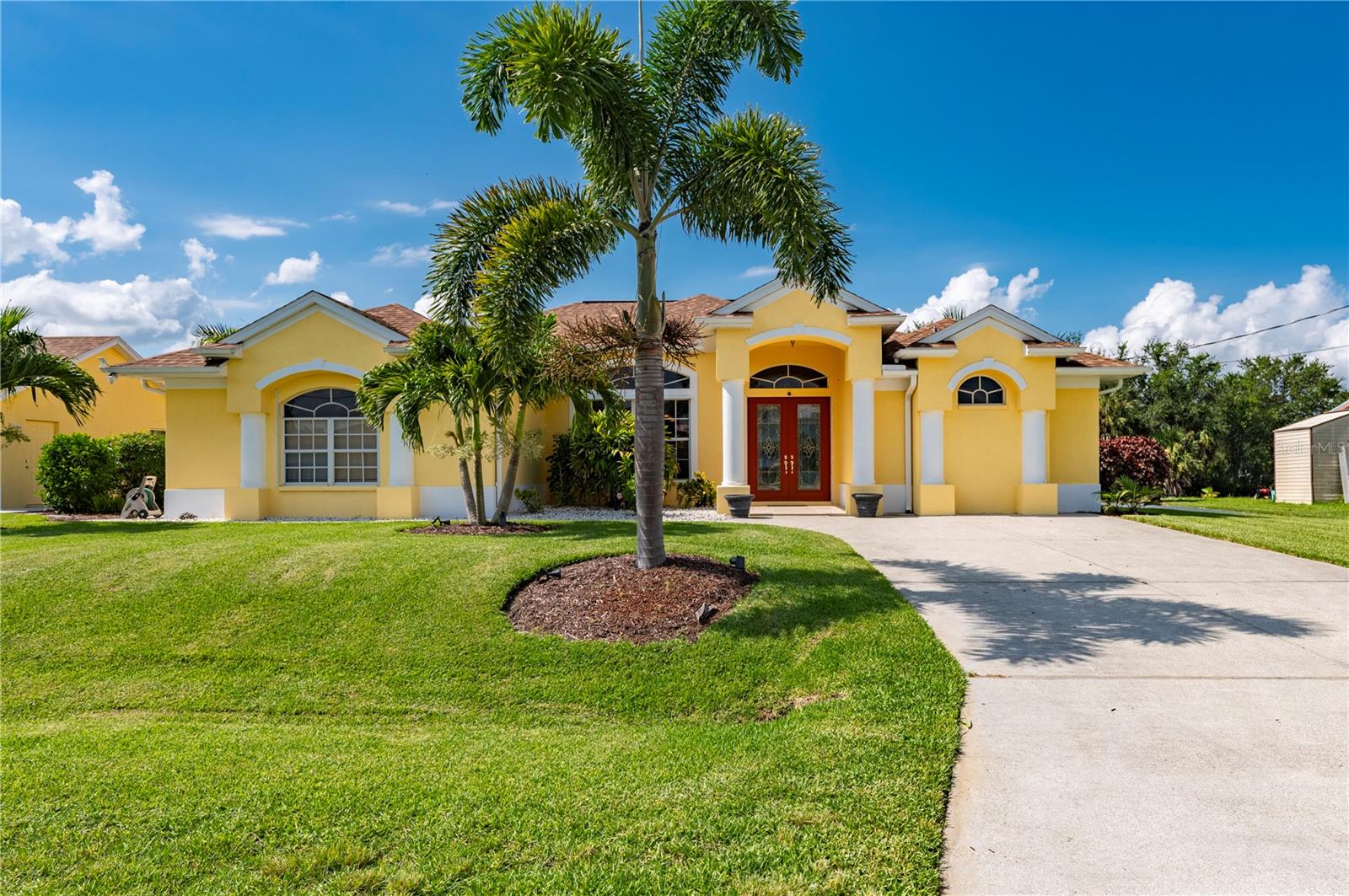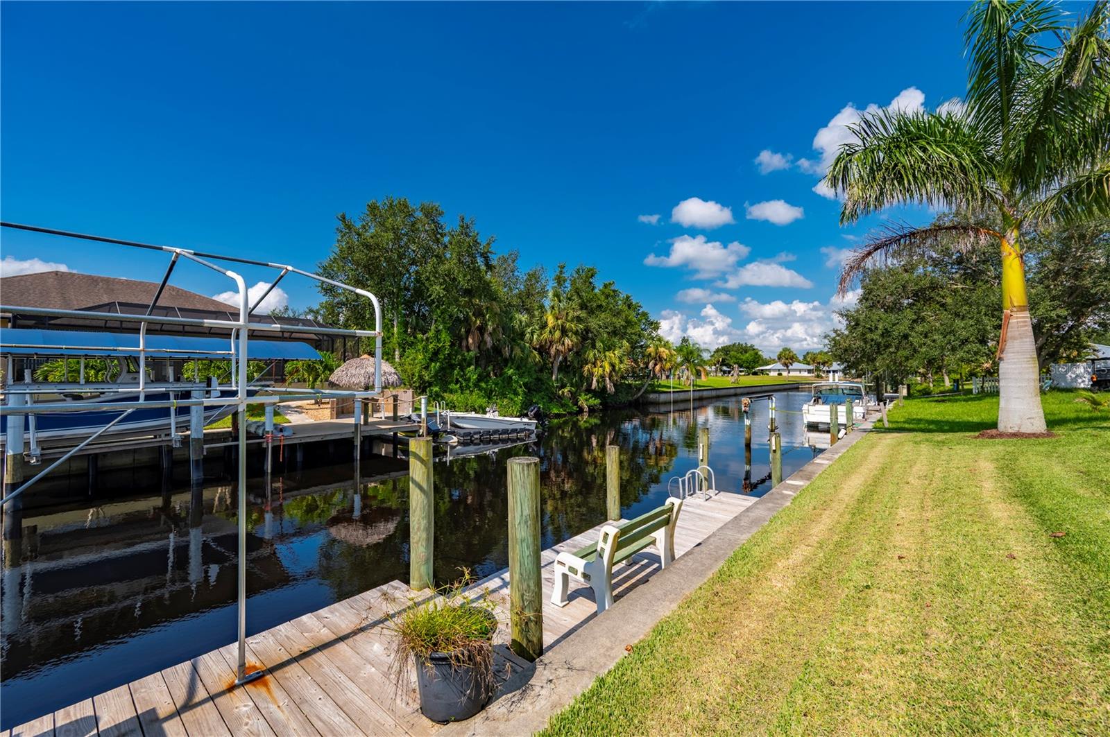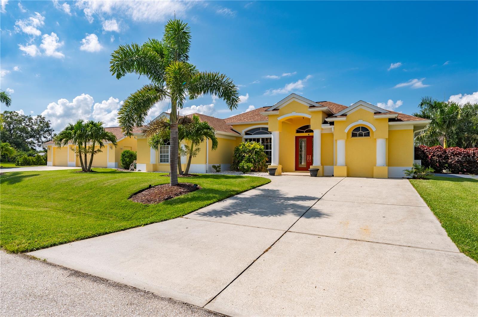 Palm trees sway gently along the canal's edge, where 160 feet of pristine waterfront set the stage for the ultimate coastal lifestyle- all from this move-in ready 3 bedroom, 3 bath home with detached 3 car garage and a private in-law suite on nearly half an acre. From your private dock-complete with a boat lift-you're just moments from the open waters of Peace River and onto Charlotte Harbor, a paradise for boaters and anglers alike. This custom-designed home unfolds with thoughtful grandeur. Beautiful wood-look plank tile stretches throughout a bright, open layout tailored for gathering and entertaining. Volume ceilings and crown molding add elegance, while the spacious kitchen commands attention with stone counters, a wine refrigerator, 2020 stainless appliances, a tile backsplash, under-cabinet accent lighting, and ceiling-height cabinetry for extra storage. A breakfast bar and a panoramic-windowed nook offer perfect spaces to start the day-all overlooking serene water views. The main living space flows effortlessly into a cozy family room/den complete with a full bathroom. Down the hall, a large bonus room-currently used as an office-adds flexibility with custom cabinetry down the hall to adapt to your lifestyle. Two additional bedrooms provide comfort for guests or family-one with direct access to the lanai and backyard. Privately tucked away, the primary suite is a retreat in every sense, with a tray ceiling, sitting area, and sliding glass doors that open directly to the lanai. The ensuite bath offers dual walk-in closets, a soaking tub, and a walk-in shower. Step outside to the oversized, tiled screened lanai, a true extension of your living space with screen/projector- ideal for quiet mornings or evening cocktails, all with peaceful water views as your backdrop. Just across the breezeway, a detached three-car garage includes a converted workshop in the third bay- and a private-entry one-bedroom, one-bath apartment with kitchenette, perfect for in-laws, guests, or long-term stays. This home offers more than space- it offers lifestyle. Recent upgrades include a 2025 dishwasher, 2023 AC condenser, 2022 whole-home generator, 2021 well pump, and 2020 roof. Located in Palm Shores, a peaceful, non-HOA community with no deed restrictions, you'll enjoy rare freedom with a prime location just minutes to Punta Gorda, I-75, and Punta Gorda Airport. For the boater, entertainer, multi-generational household, or anyone seeking privacy and elegance by the water -this home is ready to elevate every day.