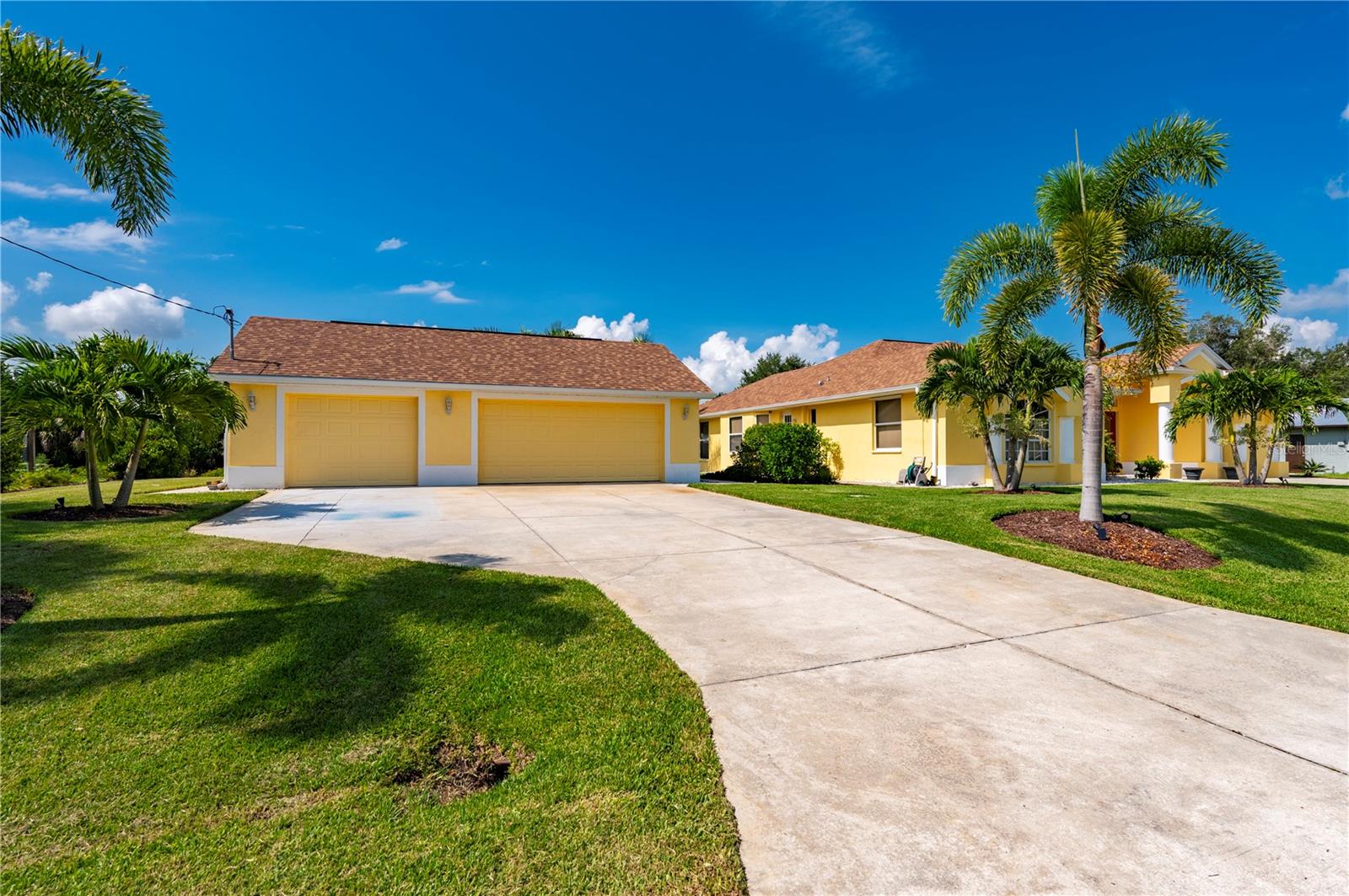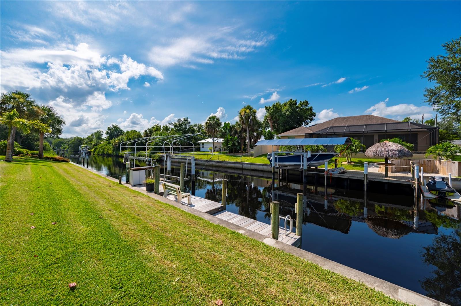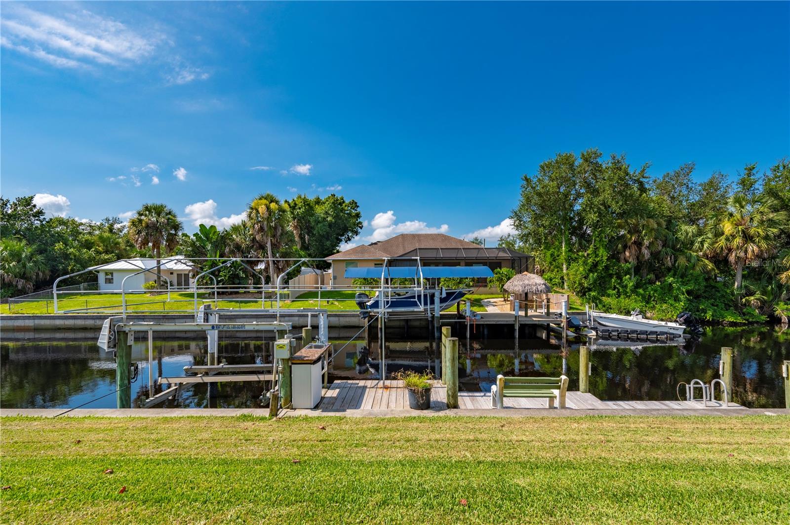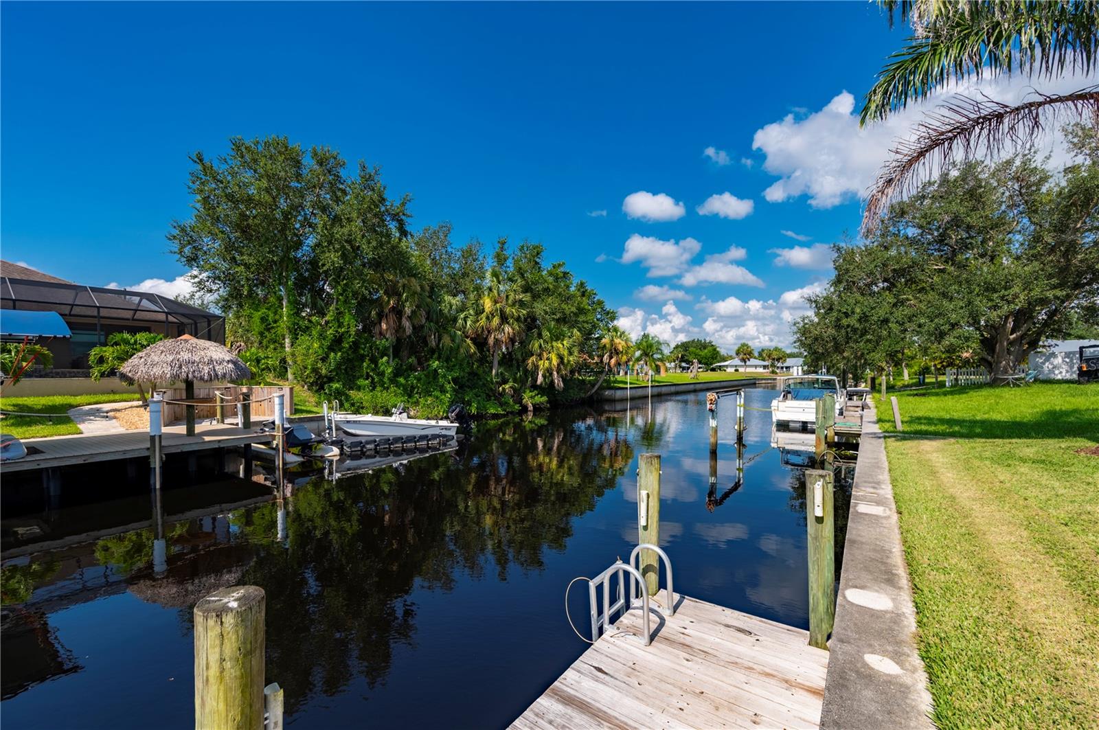 Palm trees sway gently along the canal's edge, where 160 feet of pristine waterfront set the stage for the ultimate coastal lifestyle- all from this move-in ready 3 bedroom, 3 bath home with detached 3 car garage and a private in-law suite on nearly half an acre. From your private dock-complete with a boat lift-you're just moments from the open waters of Peace River and onto Charlotte Harbor, a paradise for boaters and anglers alike. This custom-designed home unfolds with thoughtful grandeur. Beautiful wood-look plank tile stretches throughout a bright, open layout tailored for gathering and entertaining. Volume ceilings and crown molding add elegance, while the spacious kitchen commands attention with stone counters, a wine refrigerator, 2020 stainless appliances, a tile backsplash, under-cabinet accent lighting, and ceiling-height cabinetry for extra storage. A breakfast bar and a panoramic-windowed nook offer perfect spaces to start the day-all overlooking serene water views. The main living space flows effortlessly into a cozy family room/den complete with a full bathroom. Down the hall, a large bonus room-currently used as an office-adds flexibility with custom cabinetry down the hall to adapt to your lifestyle. Two additional bedrooms provide comfort for guests or family-one with direct access to the lanai and backyard. Privately tucked away, the primary suite is a retreat in every sense, with a tray ceiling, sitting area, and sliding glass doors that open directly to the lanai. The ensuite bath offers dual walk-in closets, a soaking tub, and a walk-in shower. Step outside to the oversized, tiled screened lanai, a true extension of your living space with screen/projector- ideal for quiet mornings or evening cocktails, all with peaceful water views as your backdrop. Just across the breezeway, a detached three-car garage includes a converted workshop in the third bay- and a private-entry one-bedroom, one-bath apartment with kitchenette, perfect for in-laws, guests, or long-term stays. This home offers more than space- it offers lifestyle. Recent upgrades include a 2025 dishwasher, 2023 AC condenser, 2022 whole-home generator, 2021 well pump, and 2020 roof. Located in Palm Shores, a peaceful, non-HOA community with no deed restrictions, you'll enjoy rare freedom with a prime location just minutes to Punta Gorda, I-75, and Punta Gorda Airport. For the boater, entertainer, multi-generational household, or anyone seeking privacy and elegance by the water -this home is ready to elevate every day.