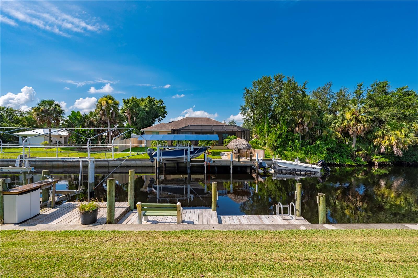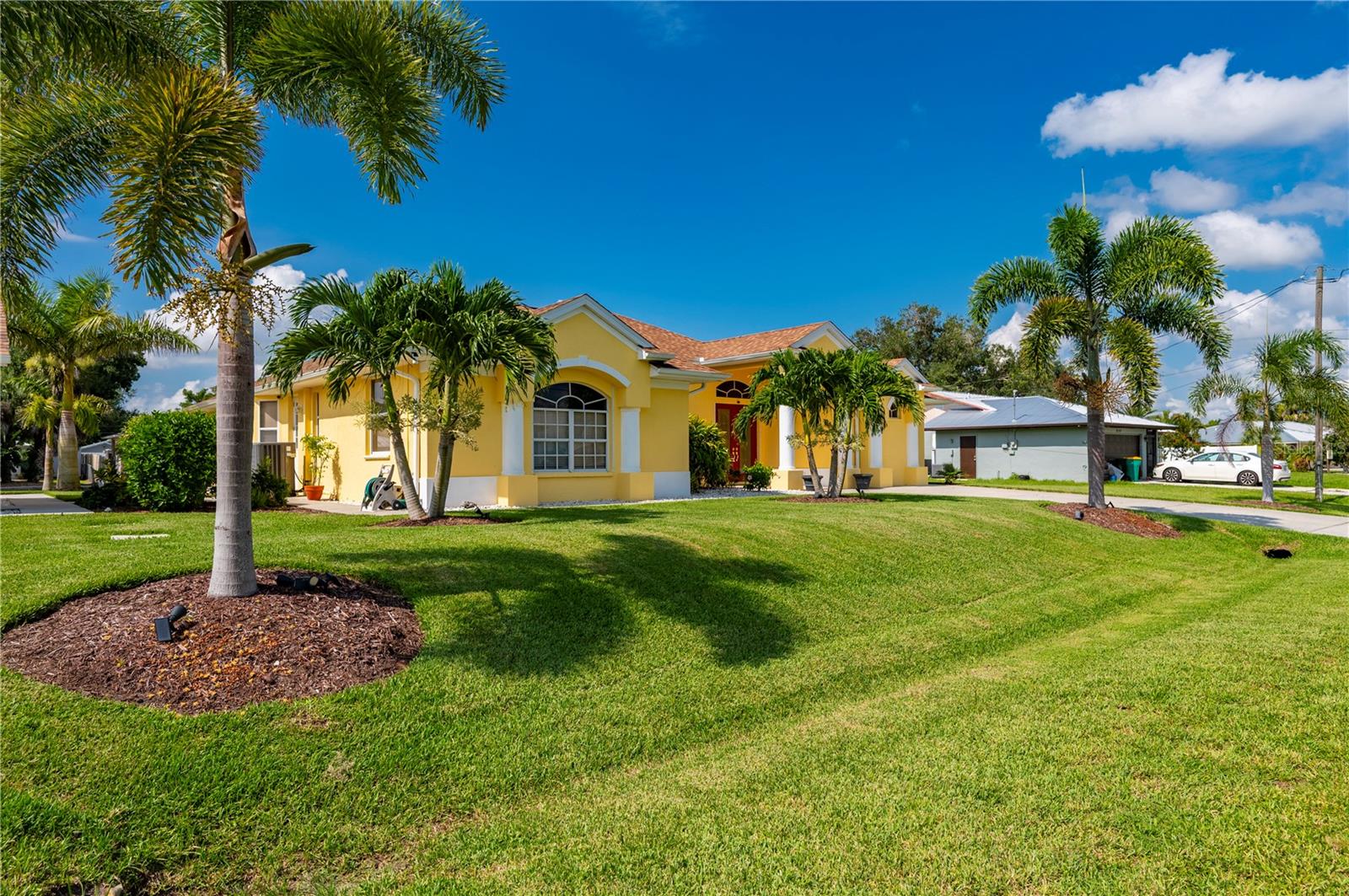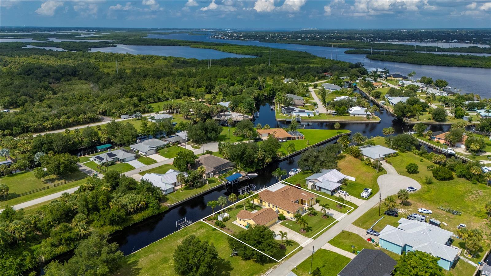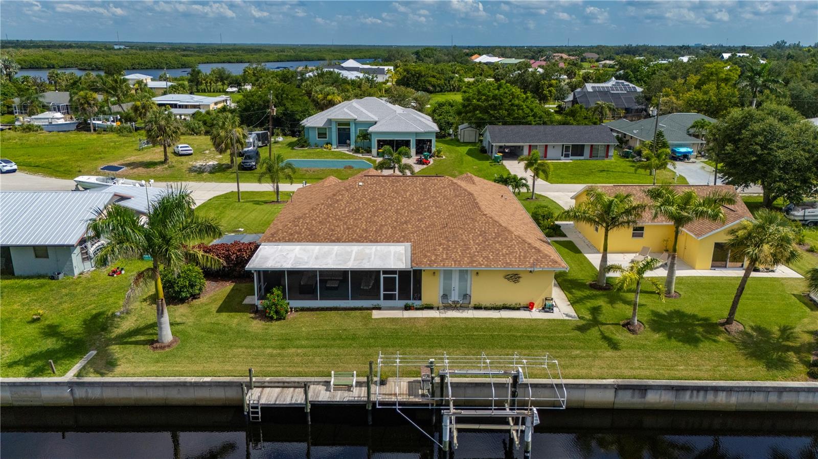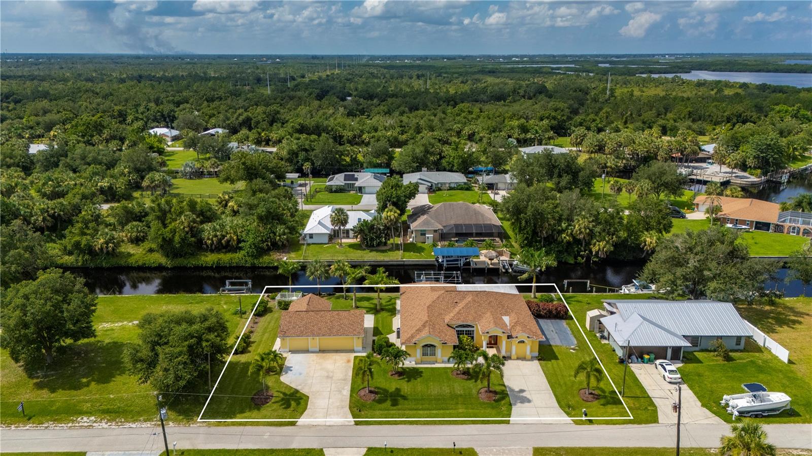 Palm trees sway gently along the canal's edge, where 160 feet of pristine waterfront set the stage for the ultimate coastal lifestyle- all from this move-in ready 3 bedroom, 3 bath home with detached 3 car garage and a private in-law suite on nearly half an acre. From your private dock-complete with a boat lift-you're just moments from the open waters of Peace River and onto Charlotte Harbor, a paradise for boaters and anglers alike. This custom-designed home unfolds with thoughtful grandeur. Beautiful wood-look plank tile stretches throughout a bright, open layout tailored for gathering and entertaining. Volume ceilings and crown molding add elegance, while the spacious kitchen commands attention with stone counters, a wine refrigerator, 2020 stainless appliances, a tile backsplash, under-cabinet accent lighting, and ceiling-height cabinetry for extra storage. A breakfast bar and a panoramic-windowed nook offer perfect spaces to start the day-all overlooking serene water views. The main living space flows effortlessly into a cozy family room/den complete with a full bathroom. Down the hall, a large bonus room-currently used as an office-adds flexibility with custom cabinetry down the hall to adapt to your lifestyle. Two additional bedrooms provide comfort for guests or family-one with direct access to the lanai and backyard. Privately tucked away, the primary suite is a retreat in every sense, with a tray ceiling, sitting area, and sliding glass doors that open directly to the lanai. The ensuite bath offers dual walk-in closets, a soaking tub, and a walk-in shower. Step outside to the oversized, tiled screened lanai, a true extension of your living space with screen/projector- ideal for quiet mornings or evening cocktails, all with peaceful water views as your backdrop. Just across the breezeway, a detached three-car garage includes a converted workshop in the third bay- and a private-entry one-bedroom, one-bath apartment with kitchenette, perfect for in-laws, guests, or long-term stays. This home offers more than space- it offers lifestyle. Recent upgrades include a 2025 dishwasher, 2023 AC condenser, 2022 whole-home generator, 2021 well pump, and 2020 roof. Located in Palm Shores, a peaceful, non-HOA community with no deed restrictions, you'll enjoy rare freedom with a prime location just minutes to Punta Gorda, I-75, and Punta Gorda Airport. For the boater, entertainer, multi-generational household, or anyone seeking privacy and elegance by the water -this home is ready to elevate every day.