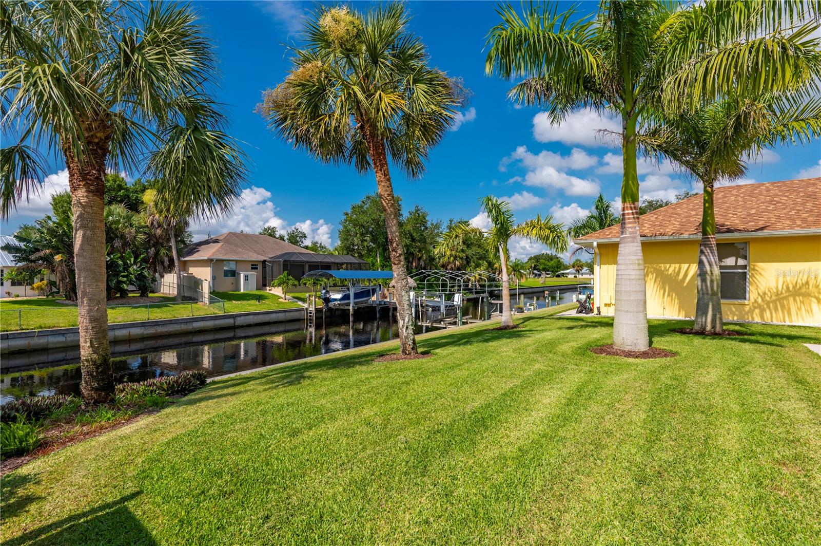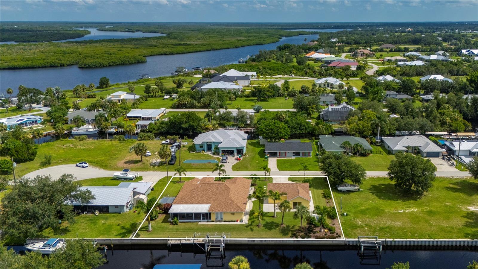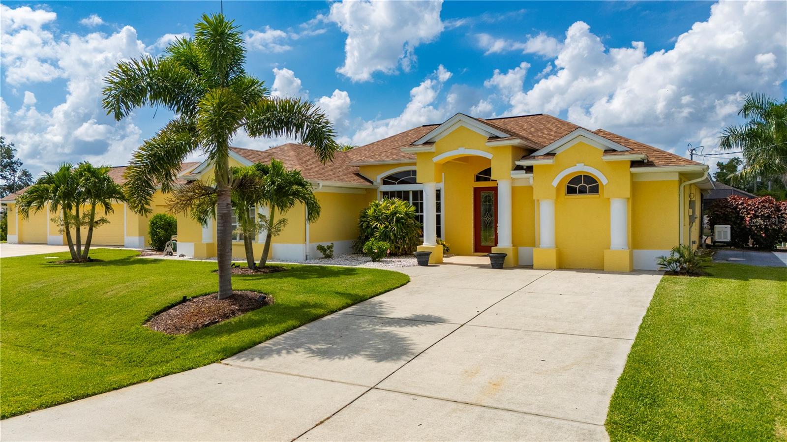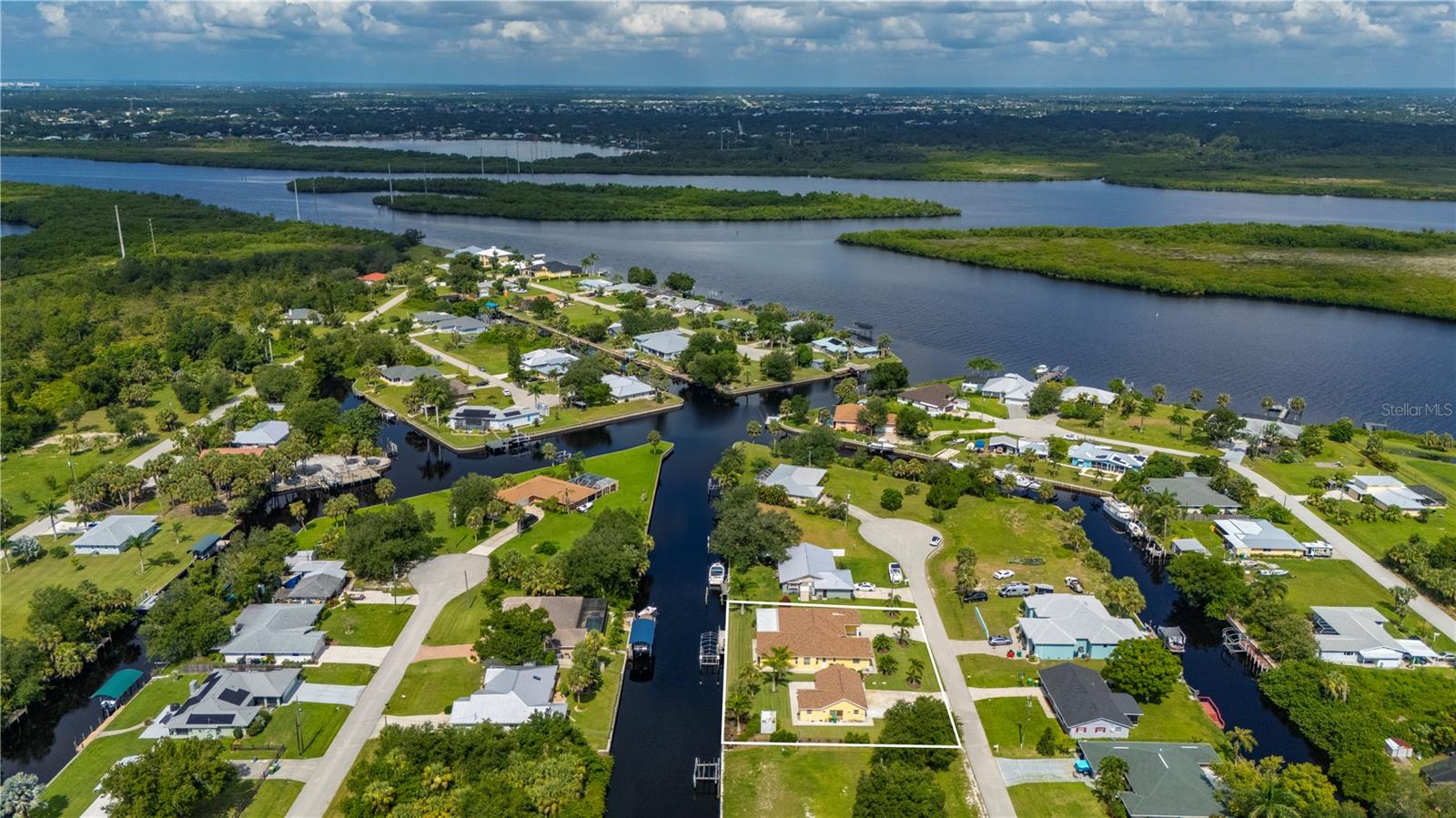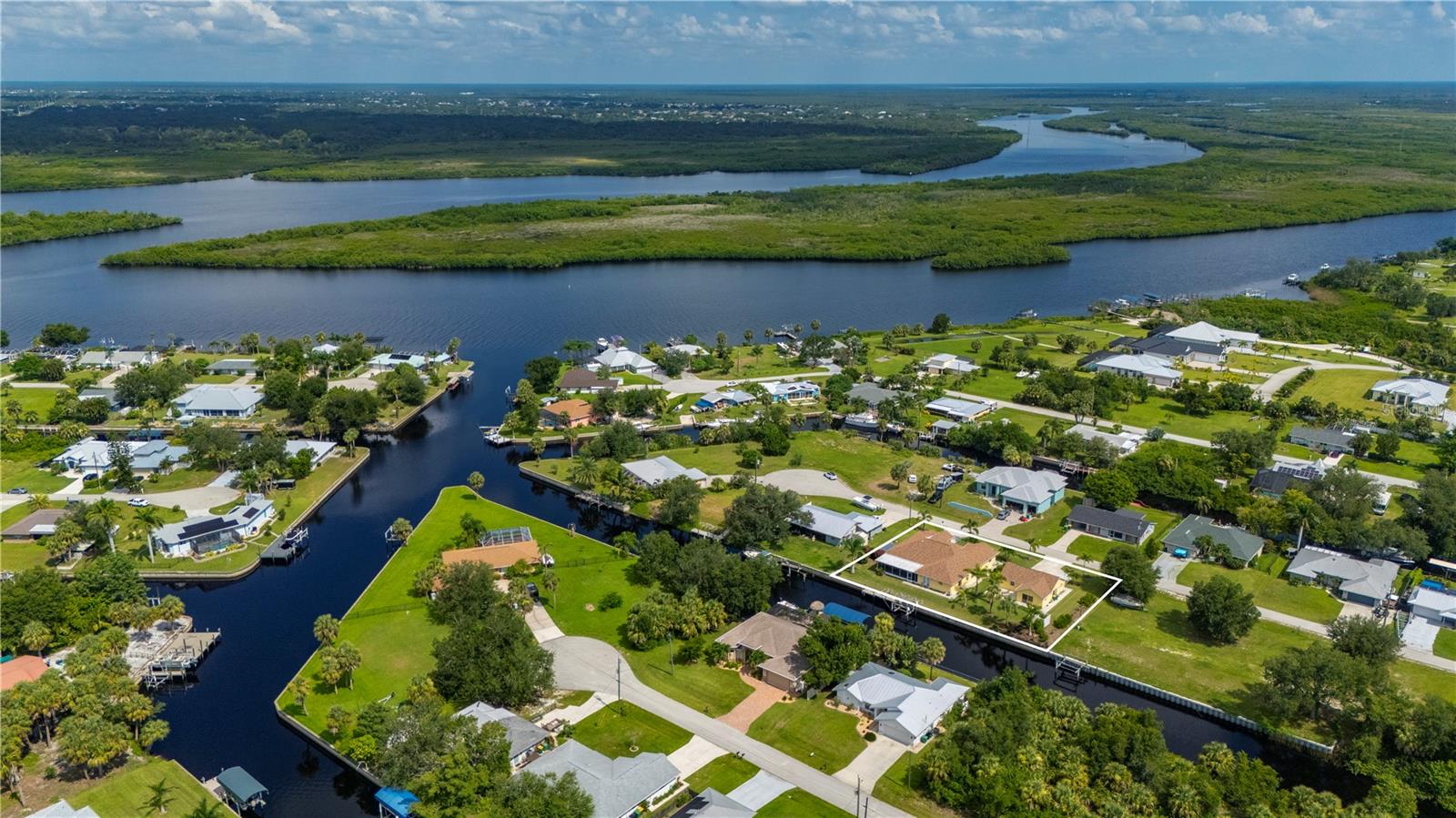 Palm trees sway gently along the canal's edge, where 160 feet of pristine waterfront set the stage for the ultimate coastal lifestyle- all from this move-in ready 3 bedroom, 3 bath home with detached 3 car garage and a private in-law suite on nearly half an acre. From your private dock-complete with a boat lift-you're just moments from the open waters of Peace River and onto Charlotte Harbor, a paradise for boaters and anglers alike. This custom-designed home unfolds with thoughtful grandeur. Beautiful wood-look plank tile stretches throughout a bright, open layout tailored for gathering and entertaining. Volume ceilings and crown molding add elegance, while the spacious kitchen commands attention with stone counters, a wine refrigerator, 2020 stainless appliances, a tile backsplash, under-cabinet accent lighting, and ceiling-height cabinetry for extra storage. A breakfast bar and a panoramic-windowed nook offer perfect spaces to start the day-all overlooking serene water views. The main living space flows effortlessly into a cozy family room/den complete with a full bathroom. Down the hall, a large bonus room-currently used as an office-adds flexibility with custom cabinetry down the hall to adapt to your lifestyle. Two additional bedrooms provide comfort for guests or family-one with direct access to the lanai and backyard. Privately tucked away, the primary suite is a retreat in every sense, with a tray ceiling, sitting area, and sliding glass doors that open directly to the lanai. The ensuite bath offers dual walk-in closets, a soaking tub, and a walk-in shower. Step outside to the oversized, tiled screened lanai, a true extension of your living space with screen/projector- ideal for quiet mornings or evening cocktails, all with peaceful water views as your backdrop. Just across the breezeway, a detached three-car garage includes a converted workshop in the third bay- and a private-entry one-bedroom, one-bath apartment with kitchenette, perfect for in-laws, guests, or long-term stays. This home offers more than space- it offers lifestyle. Recent upgrades include a 2025 dishwasher, 2023 AC condenser, 2022 whole-home generator, 2021 well pump, and 2020 roof. Located in Palm Shores, a peaceful, non-HOA community with no deed restrictions, you'll enjoy rare freedom with a prime location just minutes to Punta Gorda, I-75, and Punta Gorda Airport. For the boater, entertainer, multi-generational household, or anyone seeking privacy and elegance by the water -this home is ready to elevate every day.