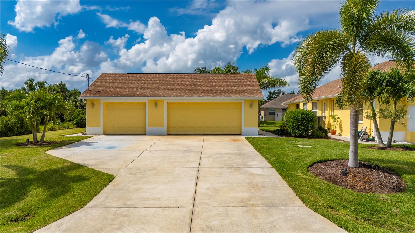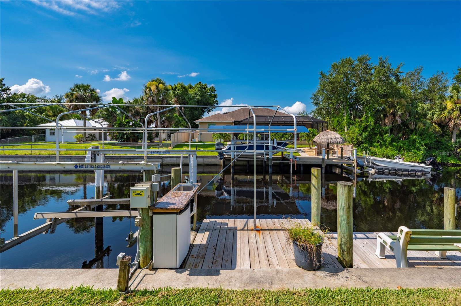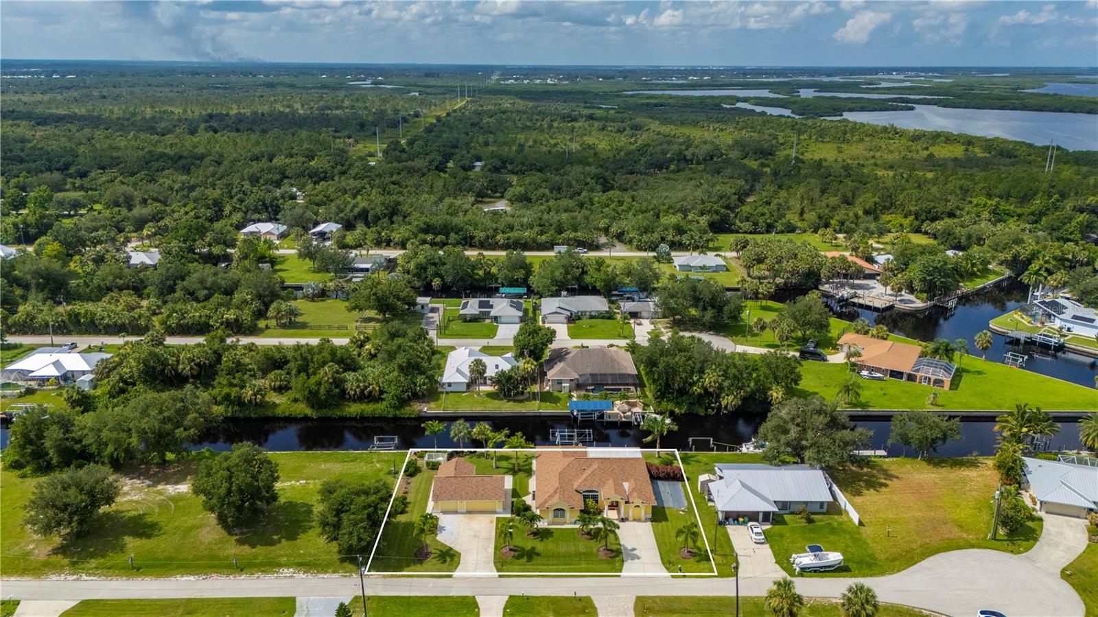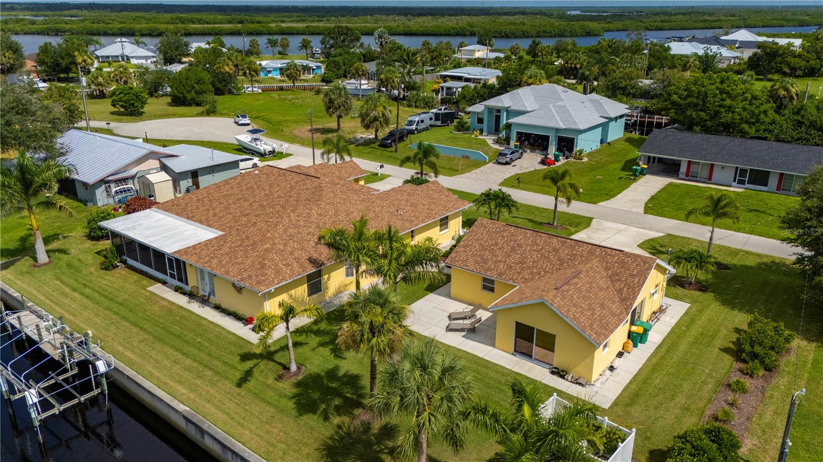 Palm trees sway gently along the canal's edge, where 160 feet of pristine waterfront set the stage for the ultimate coastal lifestyle- all from this move-in ready 3 bedroom, 3 bath home with detached 3 car garage and a private in-law suite on nearly half an acre. From your private dock-complete with a boat lift-you're just moments from the open waters of Peace River and onto Charlotte Harbor, a paradise for boaters and anglers alike. This custom-designed home unfolds with thoughtful grandeur. Beautiful wood-look plank tile stretches throughout a bright, open layout tailored for gathering and entertaining. Volume ceilings and crown molding add elegance, while the spacious kitchen commands attention with stone counters, a wine refrigerator, 2020 stainless appliances, a tile backsplash, under-cabinet accent lighting, and ceiling-height cabinetry for extra storage. A breakfast bar and a panoramic-windowed nook offer perfect spaces to start the day-all overlooking serene water views. The main living space flows effortlessly into a cozy family room/den complete with a full bathroom. Down the hall, a large bonus room-currently used as an office-adds flexibility with custom cabinetry down the hall to adapt to your lifestyle. Two additional bedrooms provide comfort for guests or family-one with direct access to the lanai and backyard. Privately tucked away, the primary suite is a retreat in every sense, with a tray ceiling, sitting area, and sliding glass doors that open directly to the lanai. The ensuite bath offers dual walk-in closets, a soaking tub, and a walk-in shower. Step outside to the oversized, tiled screened lanai, a true extension of your living space with screen/projector- ideal for quiet mornings or evening cocktails, all with peaceful water views as your backdrop. Just across the breezeway, a detached three-car garage includes a converted workshop in the third bay- and a private-entry one-bedroom, one-bath apartment with kitchenette, perfect for in-laws, guests, or long-term stays. This home offers more than space- it offers lifestyle. Recent upgrades include a 2025 dishwasher, 2023 AC condenser, 2022 whole-home generator, 2021 well pump, and 2020 roof. Located in Palm Shores, a peaceful, non-HOA community with no deed restrictions, you'll enjoy rare freedom with a prime location just minutes to Punta Gorda, I-75, and Punta Gorda Airport. For the boater, entertainer, multi-generational household, or anyone seeking privacy and elegance by the water -this home is ready to elevate every day.