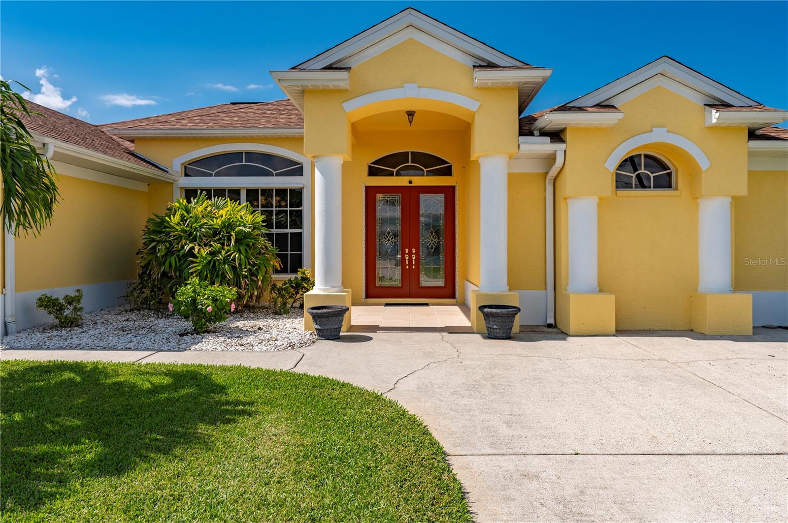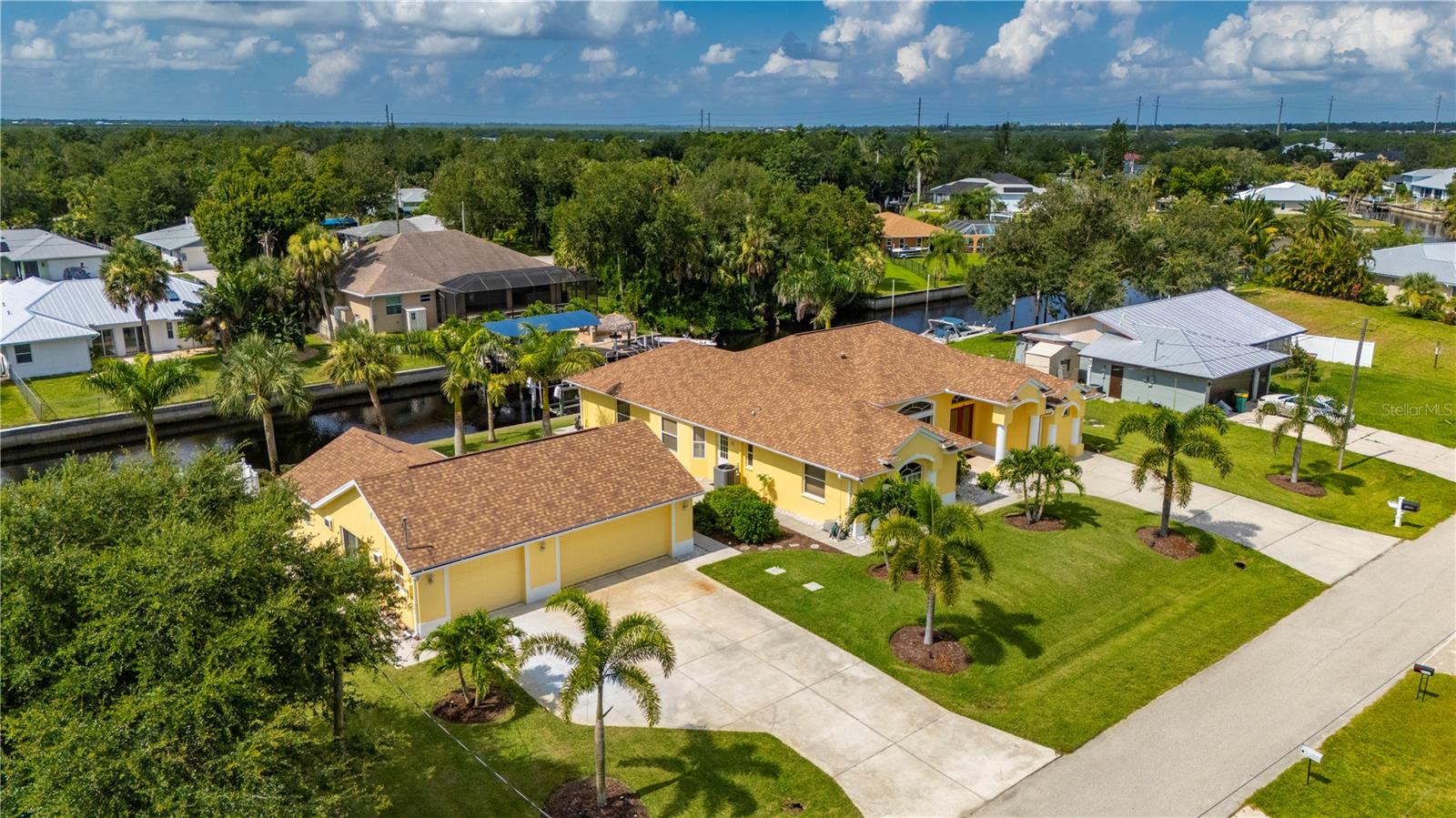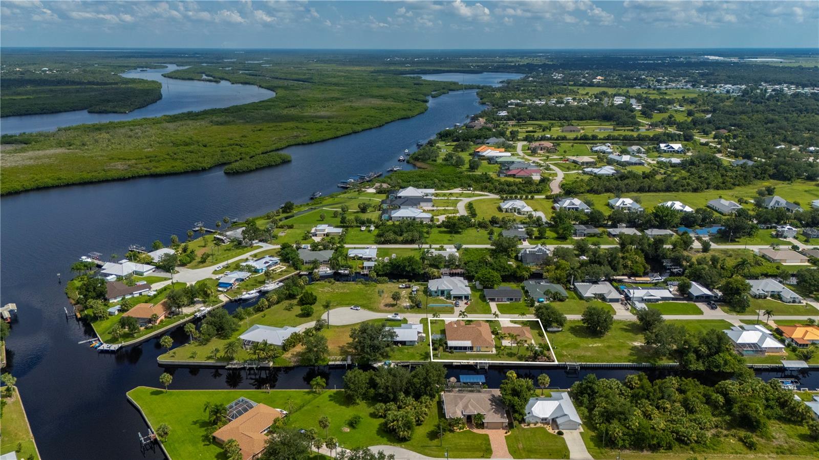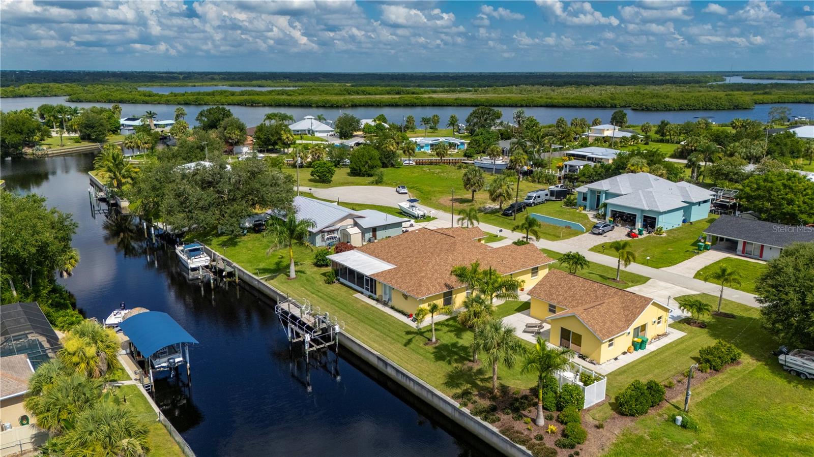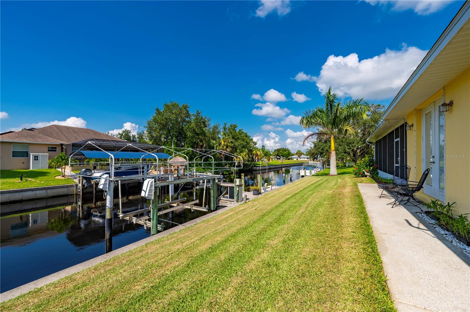 Palm trees sway gently along the canal's edge, where 160 feet of pristine waterfront set the stage for the ultimate coastal lifestyle- all from this move-in ready 3 bedroom, 3 bath home with detached 3 car garage and a private in-law suite on nearly half an acre. From your private dock-complete with a boat lift-you're just moments from the open waters of Peace River and onto Charlotte Harbor, a paradise for boaters and anglers alike. This custom-designed home unfolds with thoughtful grandeur. Beautiful wood-look plank tile stretches throughout a bright, open layout tailored for gathering and entertaining. Volume ceilings and crown molding add elegance, while the spacious kitchen commands attention with stone counters, a wine refrigerator, 2020 stainless appliances, a tile backsplash, under-cabinet accent lighting, and ceiling-height cabinetry for extra storage. A breakfast bar and a panoramic-windowed nook offer perfect spaces to start the day-all overlooking serene water views. The main living space flows effortlessly into a cozy family room/den complete with a full bathroom. Down the hall, a large bonus room-currently used as an office-adds flexibility with custom cabinetry down the hall to adapt to your lifestyle. Two additional bedrooms provide comfort for guests or family-one with direct access to the lanai and backyard. Privately tucked away, the primary suite is a retreat in every sense, with a tray ceiling, sitting area, and sliding glass doors that open directly to the lanai. The ensuite bath offers dual walk-in closets, a soaking tub, and a walk-in shower. Step outside to the oversized, tiled screened lanai, a true extension of your living space with screen/projector- ideal for quiet mornings or evening cocktails, all with peaceful water views as your backdrop. Just across the breezeway, a detached three-car garage includes a converted workshop in the third bay- and a private-entry one-bedroom, one-bath apartment with kitchenette, perfect for in-laws, guests, or long-term stays. This home offers more than space- it offers lifestyle. Recent upgrades include a 2025 dishwasher, 2023 AC condenser, 2022 whole-home generator, 2021 well pump, and 2020 roof. Located in Palm Shores, a peaceful, non-HOA community with no deed restrictions, you'll enjoy rare freedom with a prime location just minutes to Punta Gorda, I-75, and Punta Gorda Airport. For the boater, entertainer, multi-generational household, or anyone seeking privacy and elegance by the water -this home is ready to elevate every day.
