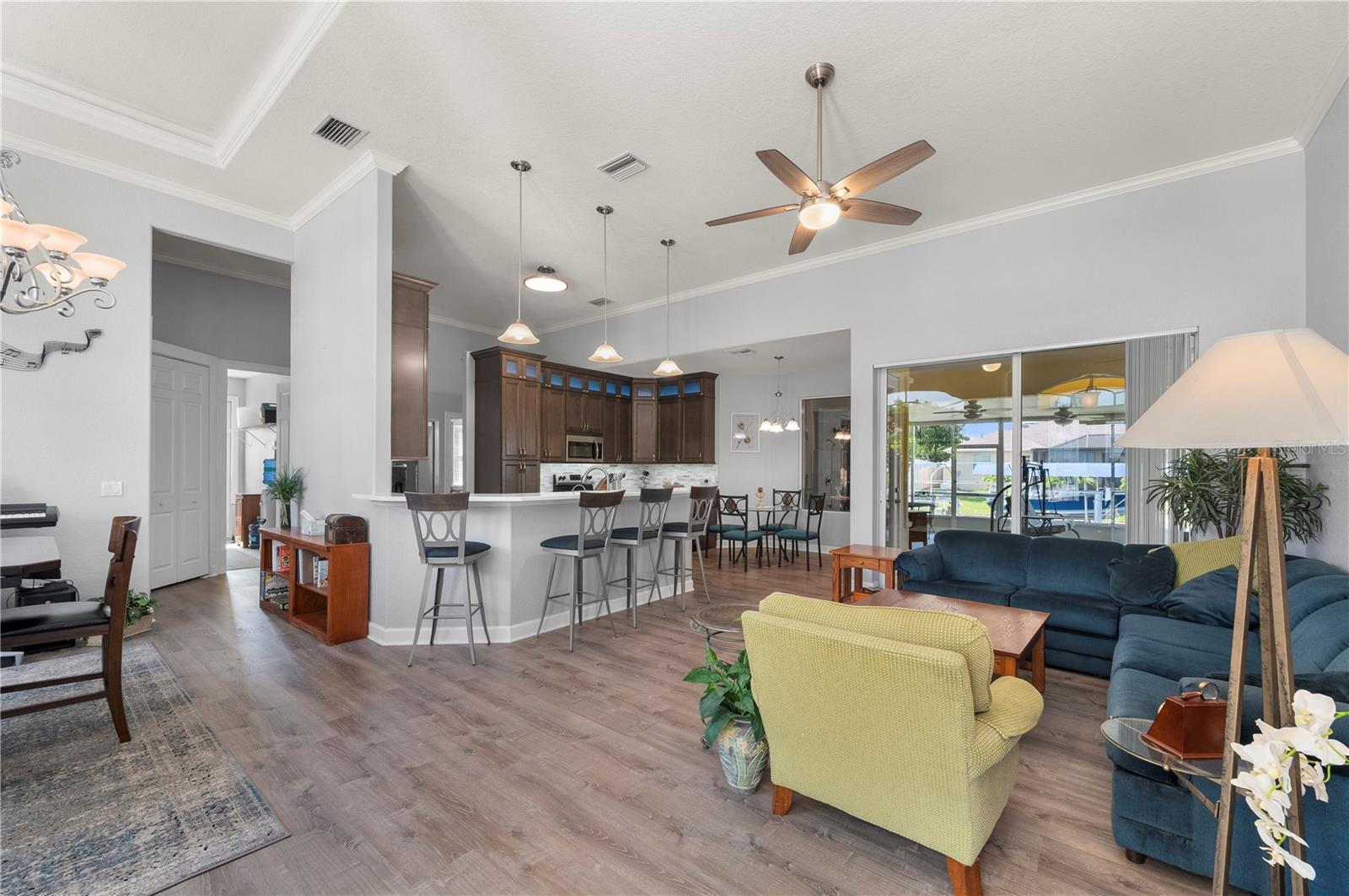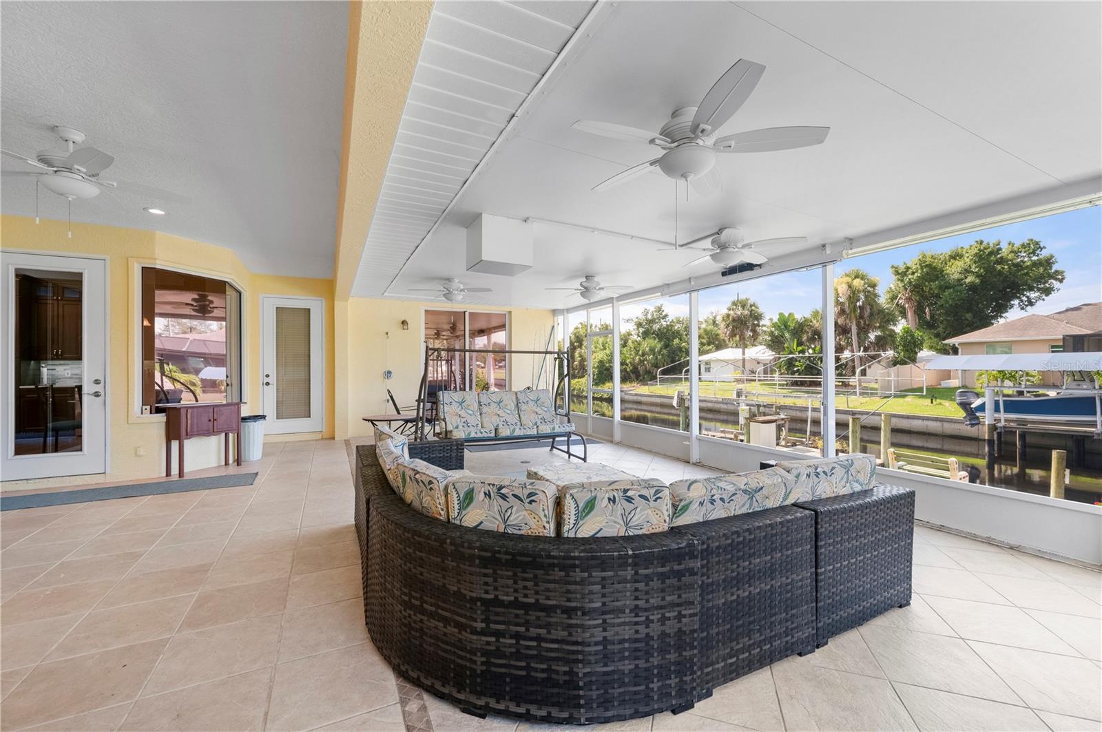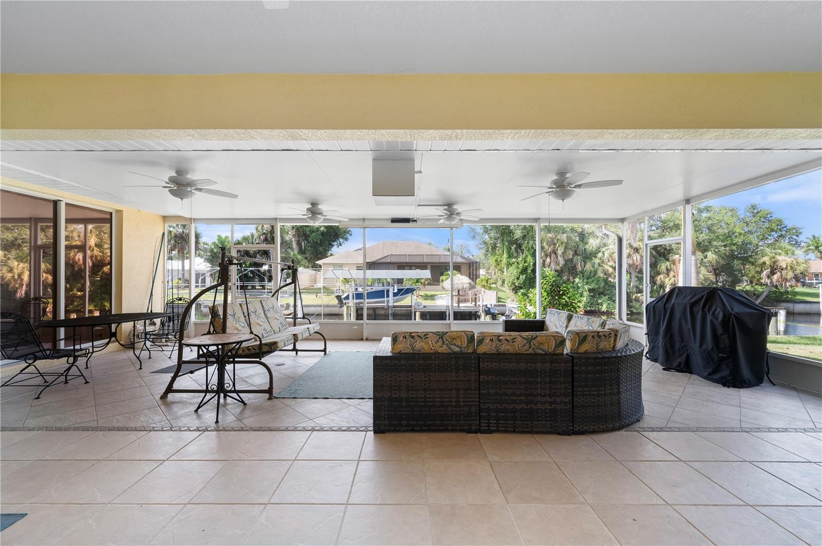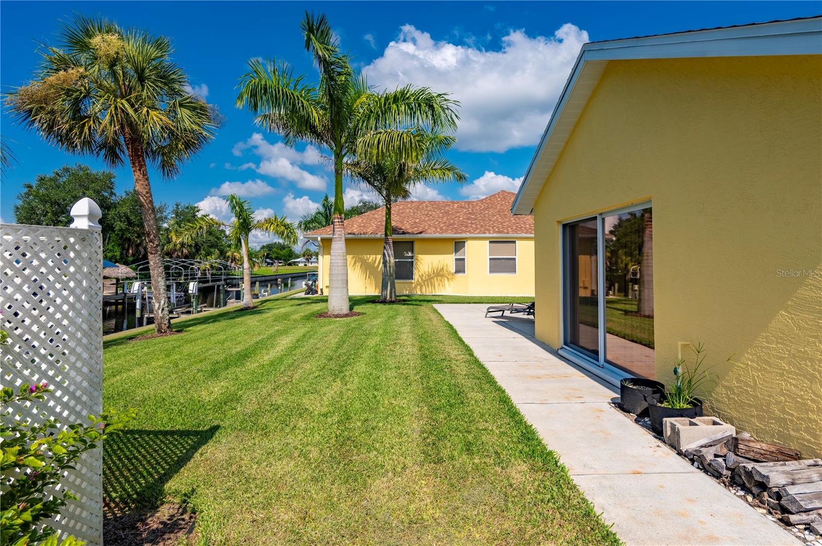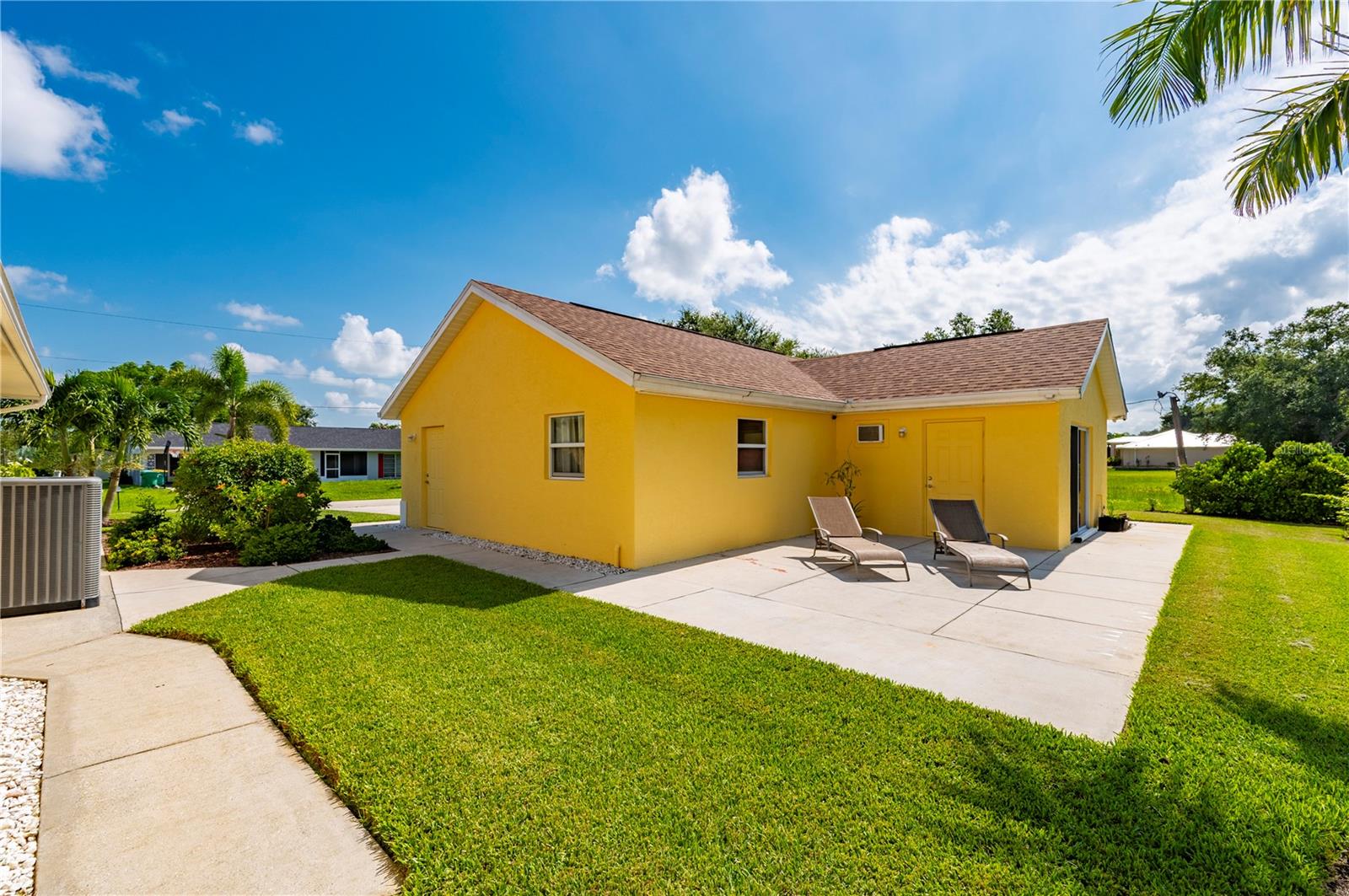 Palm trees sway gently along the canal's edge, where 160 feet of pristine waterfront set the stage for the ultimate coastal lifestyle- all from this move-in ready 3 bedroom, 3 bath home with detached 3 car garage and a private in-law suite on nearly half an acre. From your private dock-complete with a boat lift-you're just moments from the open waters of Peace River and onto Charlotte Harbor, a paradise for boaters and anglers alike. This custom-designed home unfolds with thoughtful grandeur. Beautiful wood-look plank tile stretches throughout a bright, open layout tailored for gathering and entertaining. Volume ceilings and crown molding add elegance, while the spacious kitchen commands attention with stone counters, a wine refrigerator, 2020 stainless appliances, a tile backsplash, under-cabinet accent lighting, and ceiling-height cabinetry for extra storage. A breakfast bar and a panoramic-windowed nook offer perfect spaces to start the day-all overlooking serene water views. The main living space flows effortlessly into a cozy family room/den complete with a full bathroom. Down the hall, a large bonus room-currently used as an office-adds flexibility with custom cabinetry down the hall to adapt to your lifestyle. Two additional bedrooms provide comfort for guests or family-one with direct access to the lanai and backyard. Privately tucked away, the primary suite is a retreat in every sense, with a tray ceiling, sitting area, and sliding glass doors that open directly to the lanai. The ensuite bath offers dual walk-in closets, a soaking tub, and a walk-in shower. Step outside to the oversized, tiled screened lanai, a true extension of your living space with screen/projector- ideal for quiet mornings or evening cocktails, all with peaceful water views as your backdrop. Just across the breezeway, a detached three-car garage includes a converted workshop in the third bay- and a private-entry one-bedroom, one-bath apartment with kitchenette, perfect for in-laws, guests, or long-term stays. This home offers more than space- it offers lifestyle. Recent upgrades include a 2025 dishwasher, 2023 AC condenser, 2022 whole-home generator, 2021 well pump, and 2020 roof. Located in Palm Shores, a peaceful, non-HOA community with no deed restrictions, you'll enjoy rare freedom with a prime location just minutes to Punta Gorda, I-75, and Punta Gorda Airport. For the boater, entertainer, multi-generational household, or anyone seeking privacy and elegance by the water -this home is ready to elevate every day.