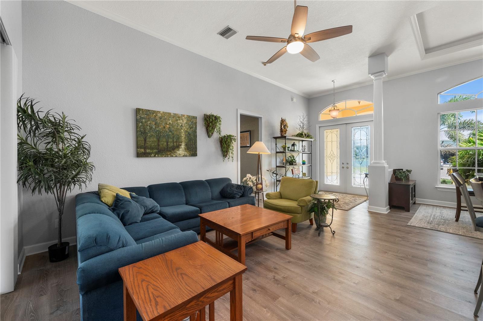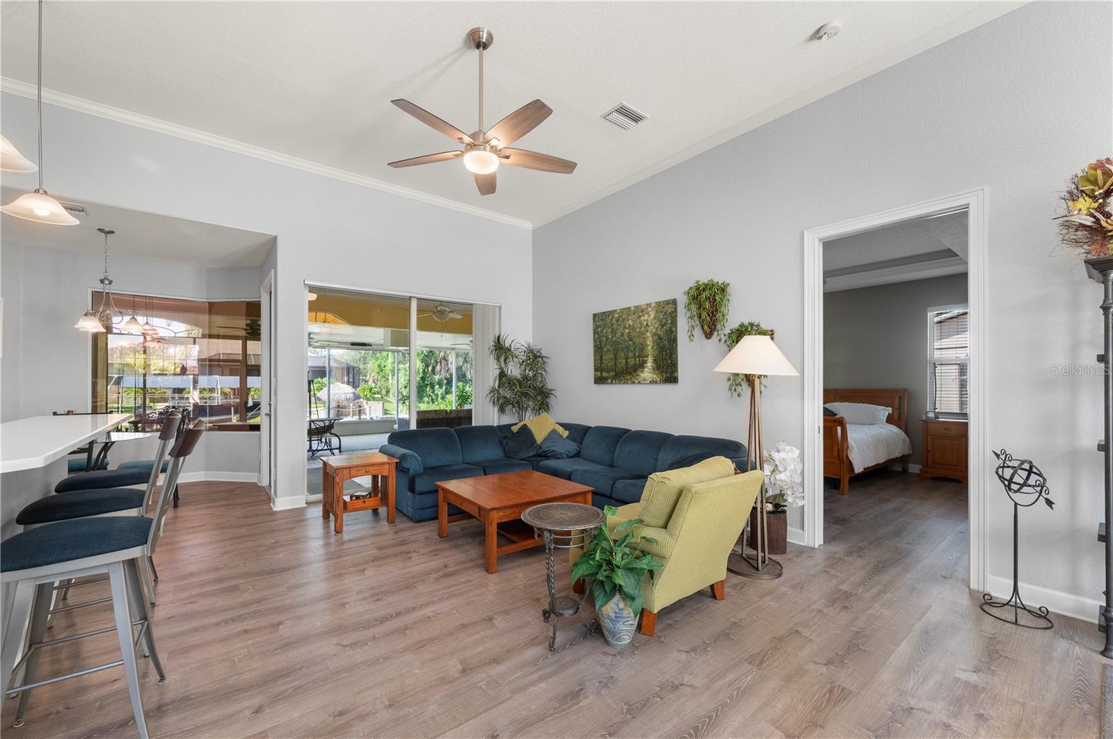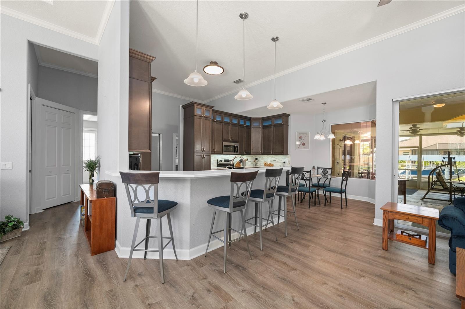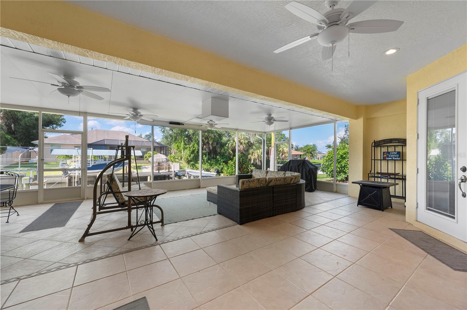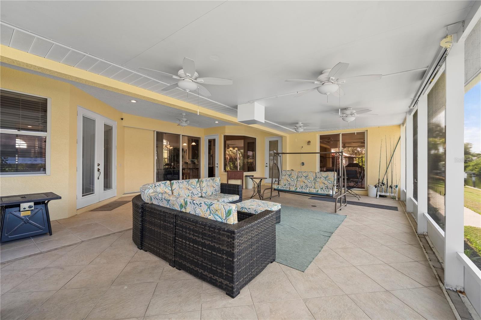 Palm trees sway gently along the canal's edge, where 160 feet of pristine waterfront set the stage for the ultimate coastal lifestyle- all from this move-in ready 3 bedroom, 3 bath home with detached 3 car garage and a private in-law suite on nearly half an acre. From your private dock-complete with a boat lift-you're just moments from the open waters of Peace River and onto Charlotte Harbor, a paradise for boaters and anglers alike. This custom-designed home unfolds with thoughtful grandeur. Beautiful wood-look plank tile stretches throughout a bright, open layout tailored for gathering and entertaining. Volume ceilings and crown molding add elegance, while the spacious kitchen commands attention with stone counters, a wine refrigerator, 2020 stainless appliances, a tile backsplash, under-cabinet accent lighting, and ceiling-height cabinetry for extra storage. A breakfast bar and a panoramic-windowed nook offer perfect spaces to start the day-all overlooking serene water views. The main living space flows effortlessly into a cozy family room/den complete with a full bathroom. Down the hall, a large bonus room-currently used as an office-adds flexibility with custom cabinetry down the hall to adapt to your lifestyle. Two additional bedrooms provide comfort for guests or family-one with direct access to the lanai and backyard. Privately tucked away, the primary suite is a retreat in every sense, with a tray ceiling, sitting area, and sliding glass doors that open directly to the lanai. The ensuite bath offers dual walk-in closets, a soaking tub, and a walk-in shower. Step outside to the oversized, tiled screened lanai, a true extension of your living space with screen/projector- ideal for quiet mornings or evening cocktails, all with peaceful water views as your backdrop. Just across the breezeway, a detached three-car garage includes a converted workshop in the third bay- and a private-entry one-bedroom, one-bath apartment with kitchenette, perfect for in-laws, guests, or long-term stays. This home offers more than space- it offers lifestyle. Recent upgrades include a 2025 dishwasher, 2023 AC condenser, 2022 whole-home generator, 2021 well pump, and 2020 roof. Located in Palm Shores, a peaceful, non-HOA community with no deed restrictions, you'll enjoy rare freedom with a prime location just minutes to Punta Gorda, I-75, and Punta Gorda Airport. For the boater, entertainer, multi-generational household, or anyone seeking privacy and elegance by the water -this home is ready to elevate every day.